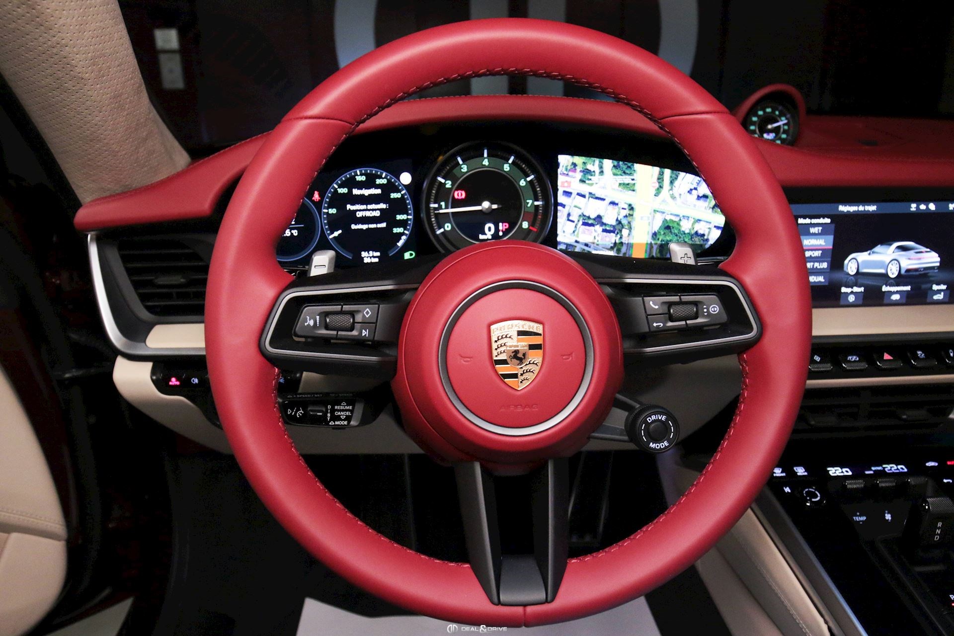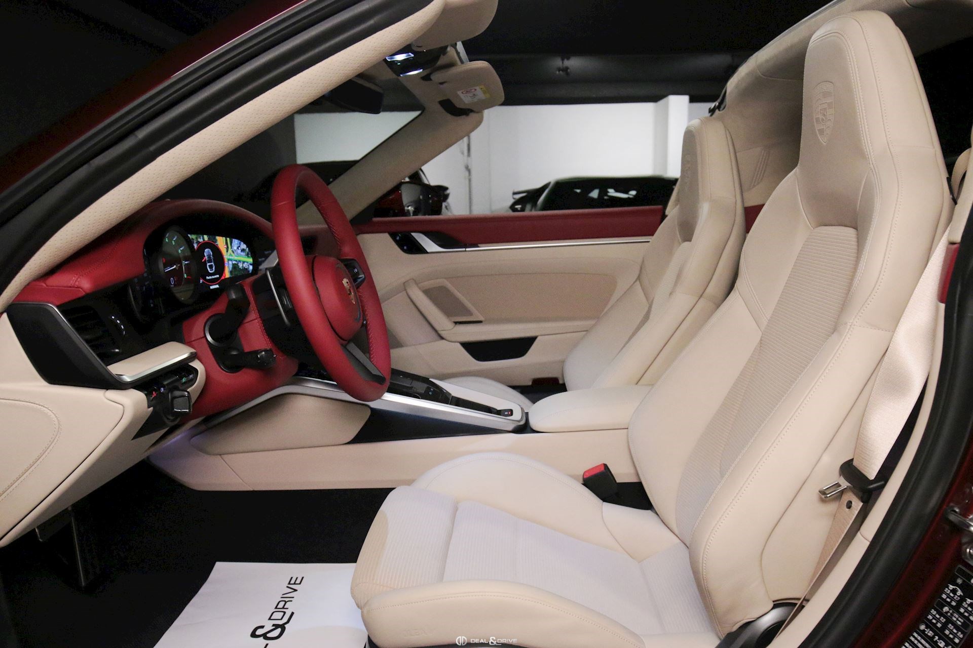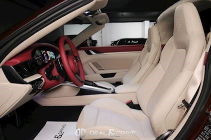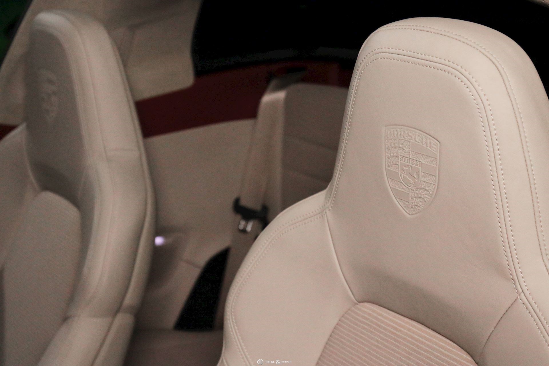 INTÉRIEUR Pack Sport Chrono avec chiffres en Vert et aiguille en blanc Volant en cuir multifonctions avec écusson Porsche Historique Panneaux de portes en velours côtelé Ceintures de sécurité en Beige Atacama Logo Porsche Exclusive Manufaktur sur l’accoudoir central Ciel de pavillon et habillage des montants avant et centraux en Alcantara perforé Plaque de l’édition de couleur Or sur planche de bord Climatisation automatique 2 zones Sièges Sport adaptatifs avant, 18 positions Bandes centrales des sièges avant et arrière en velours côtelé Beige Atacama et appuie-tête avec écusson Porsche Baguettes de seuil de porte en aluminium brossé avec inscription ‘911 Targa 4S Heritage Design Edition’ Tapis de sol Heritage Design Sièges chauffants à l'avant Design Heritage spécifique avec chiffres en Vert et aiguilles en Blanc