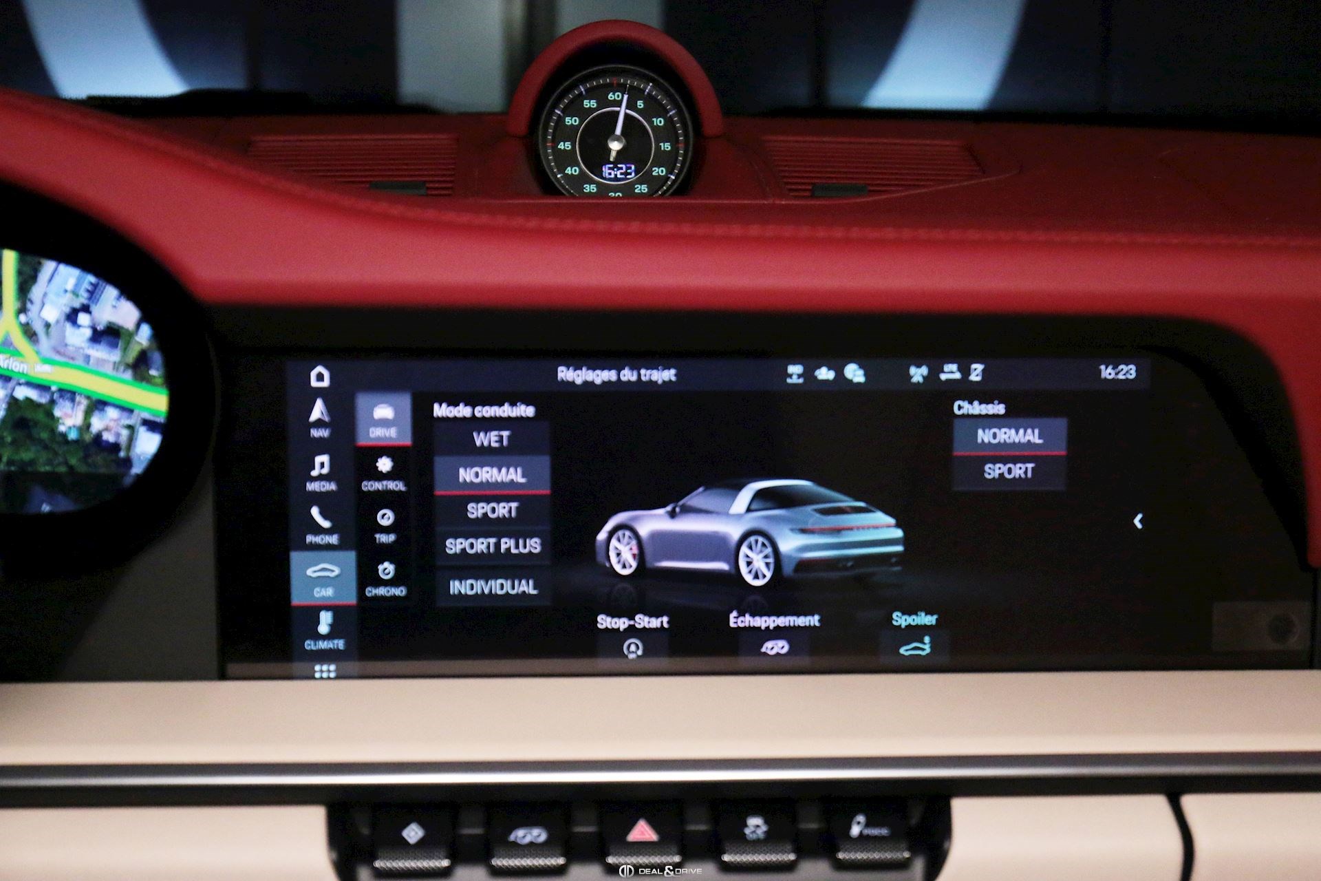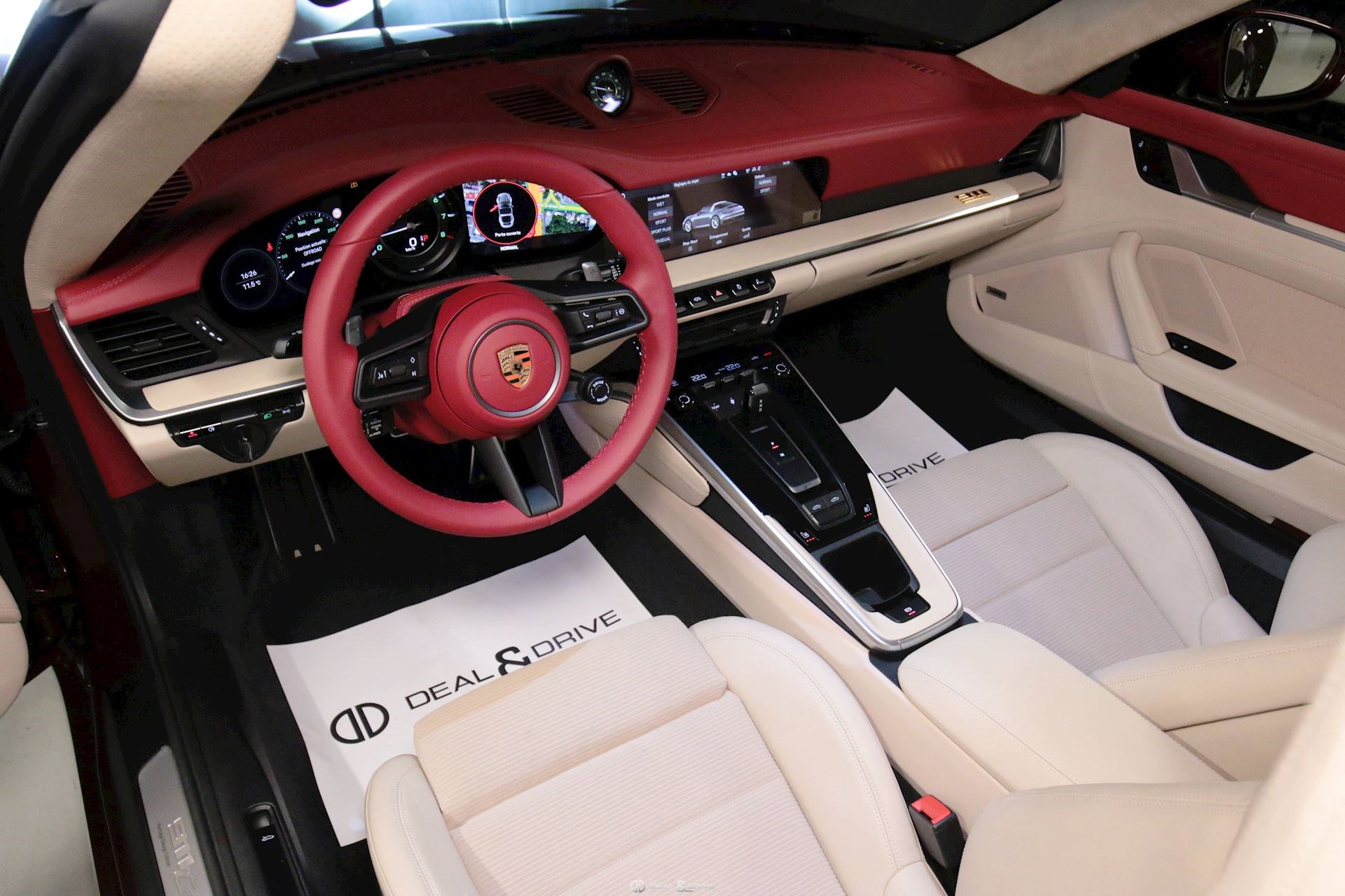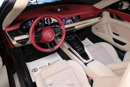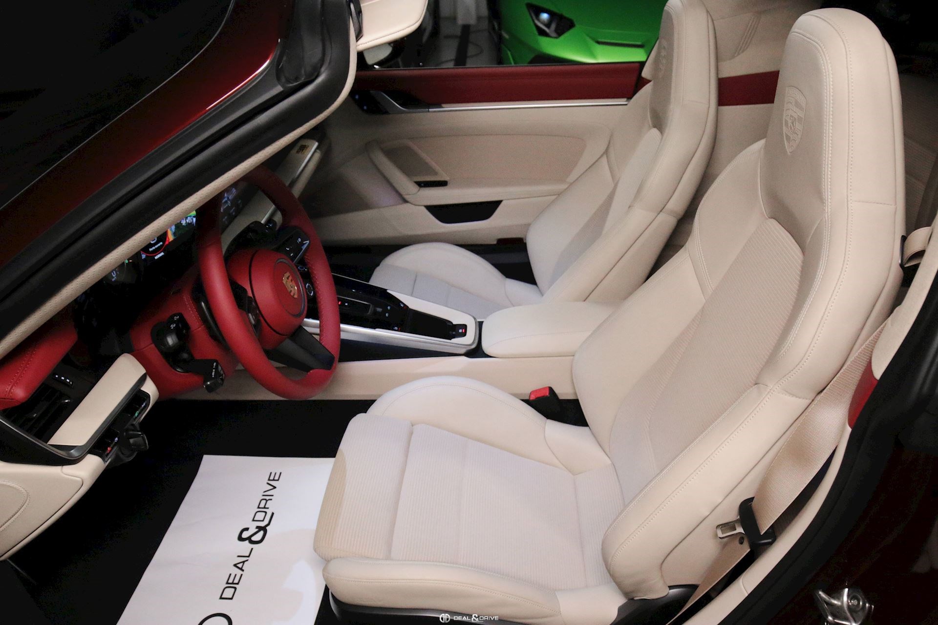 INTÉRIEUR Pack Sport Chrono avec chiffres en Vert et aiguille en blanc Volant en cuir multifonctions avec écusson Porsche Historique Panneaux de portes en velours côtelé Ceintures de sécurité en Beige Atacama Logo Porsche Exclusive Manufaktur sur l’accoudoir central Ciel de pavillon et habillage des montants avant et centraux en Alcantara perforé Plaque de l’édition de couleur Or sur planche de bord Climatisation automatique 2 zones Sièges Sport adaptatifs avant, 18 positions Bandes centrales des sièges avant et arrière en velours côtelé Beige Atacama et appuie-tête avec écusson Porsche Baguettes de seuil de porte en aluminium brossé avec inscription ‘911 Targa 4S Heritage Design Edition’ Tapis de sol Heritage Design Sièges chauffants à l'avant Design Heritage spécifique avec chiffres en Vert et aiguilles en Blanc