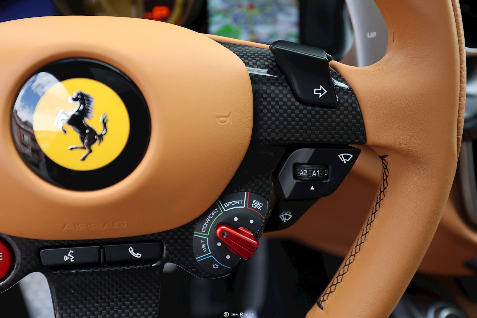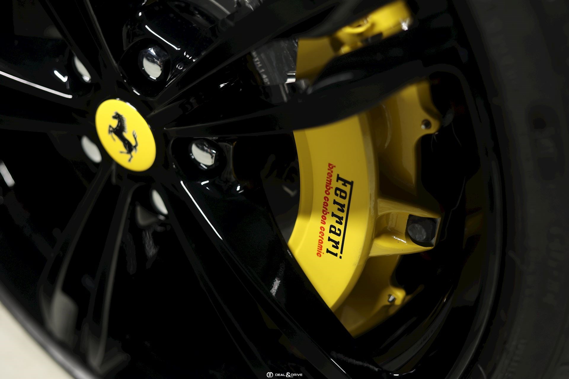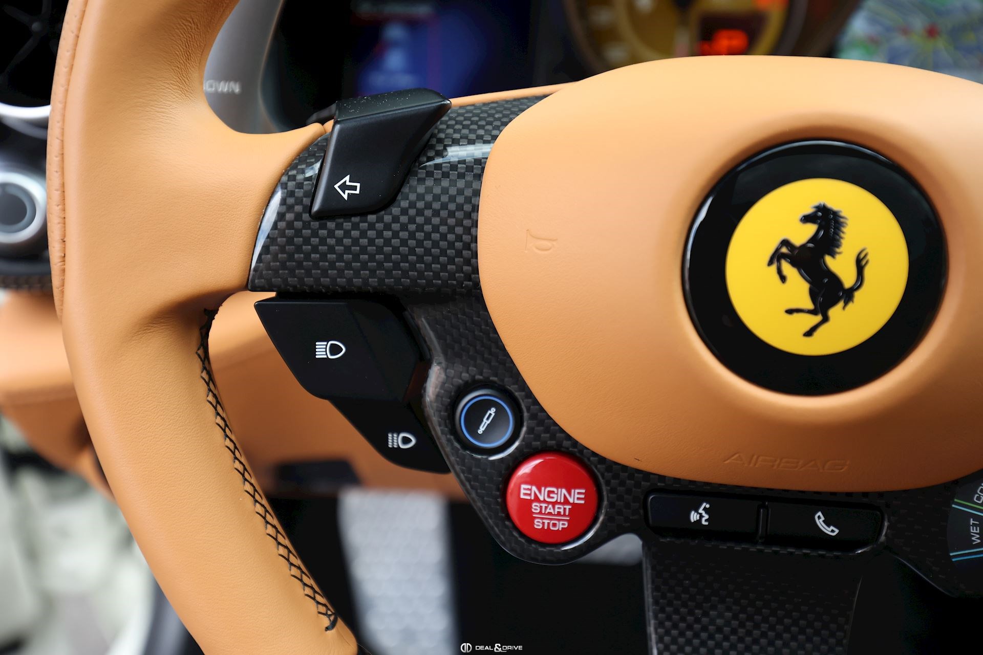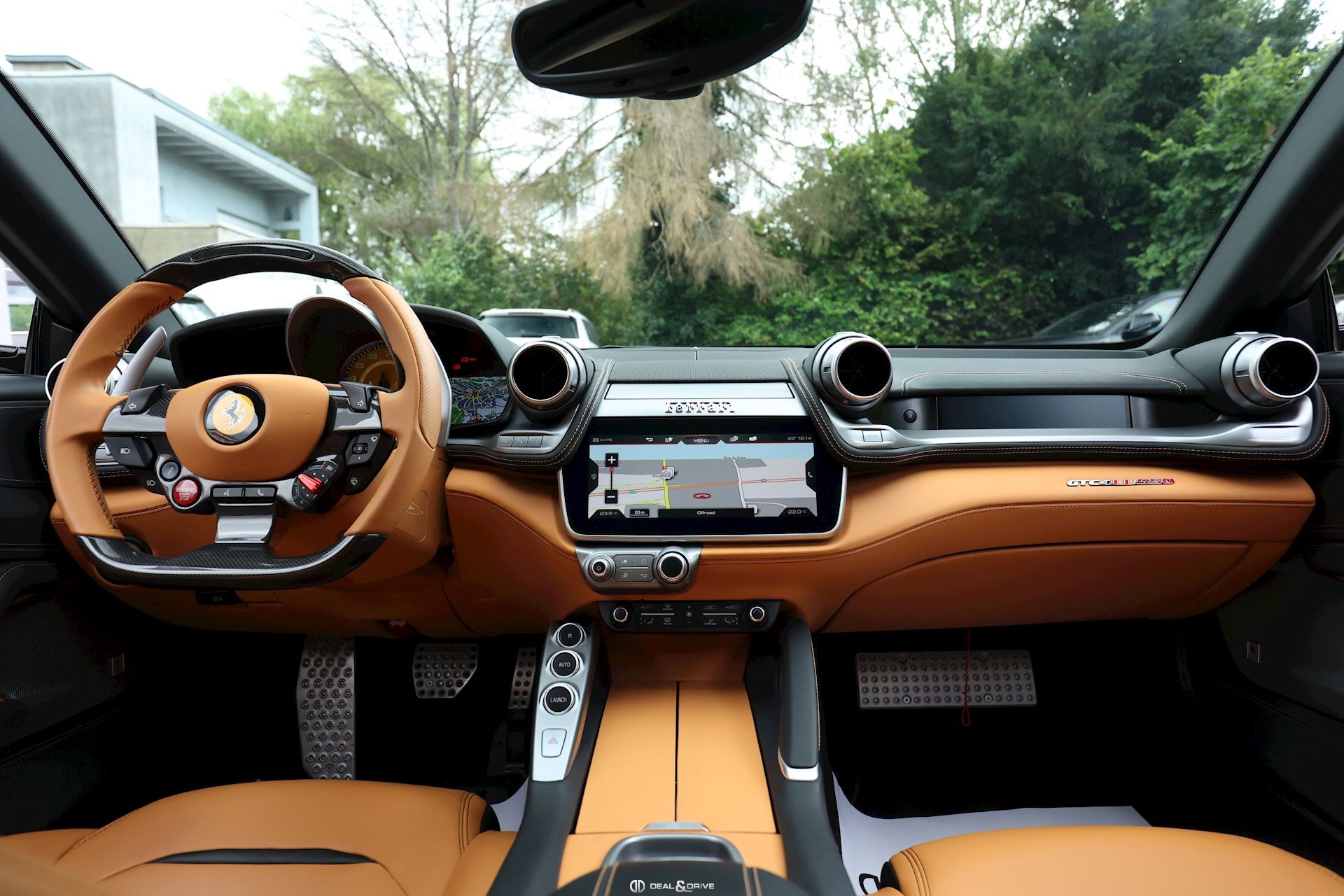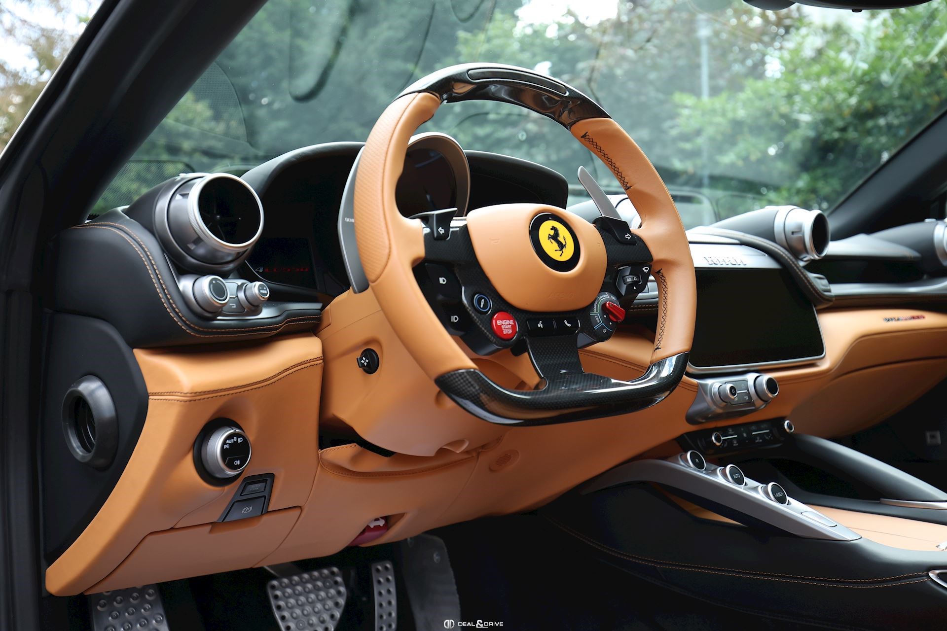 INTÉRIEUR Volant en carbone avec Shift Light LED Volant en cuir, multifonctions Sièges avant électriques Sièges avant chauffants Sièges avant avec fonction mémoire Appui-lombaires électriques Logo Ferrari de couleur noir brodé sur les appuie-têtes Compte tour de couleur jaune Climatisation automatique 2 zones