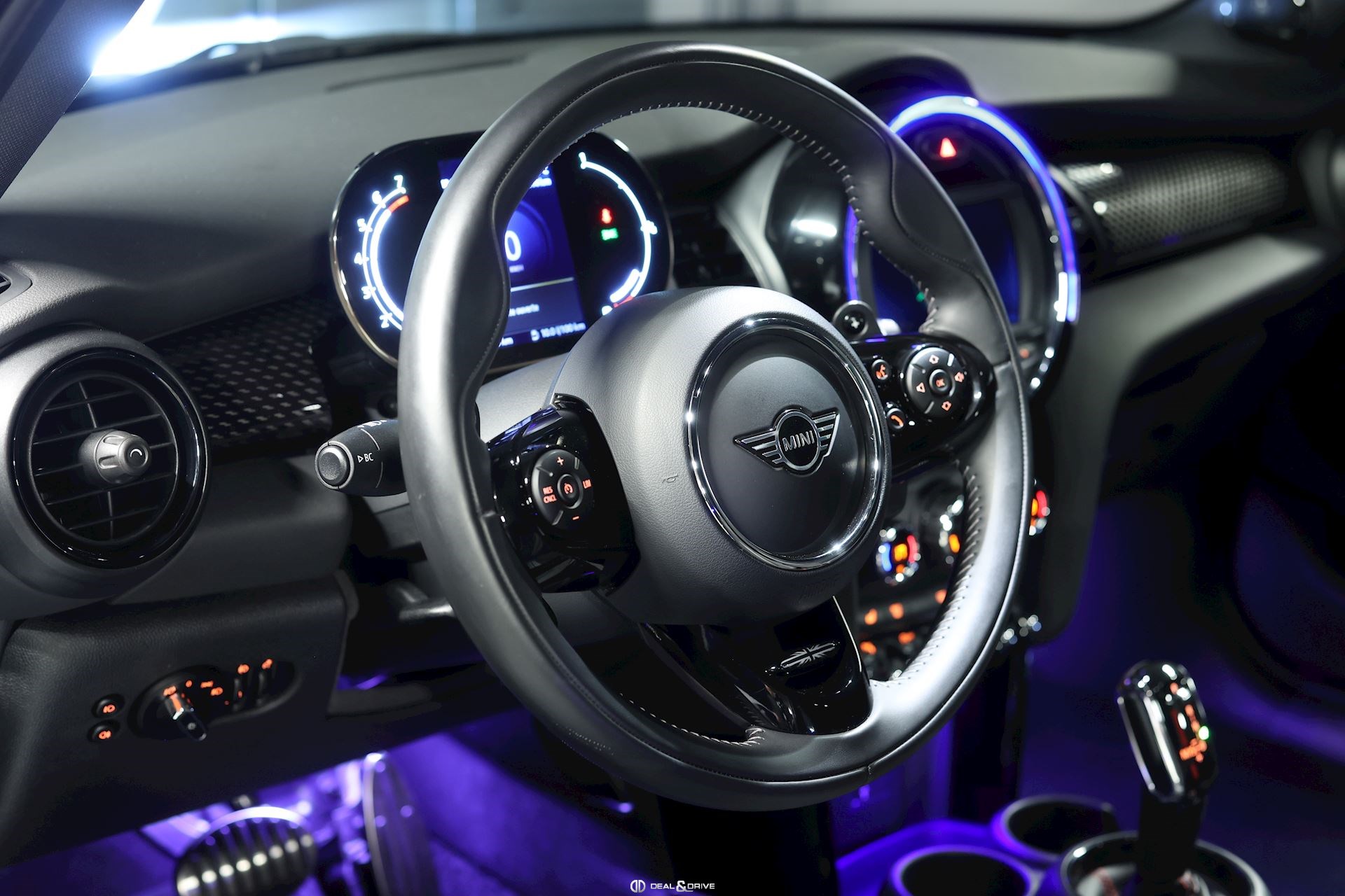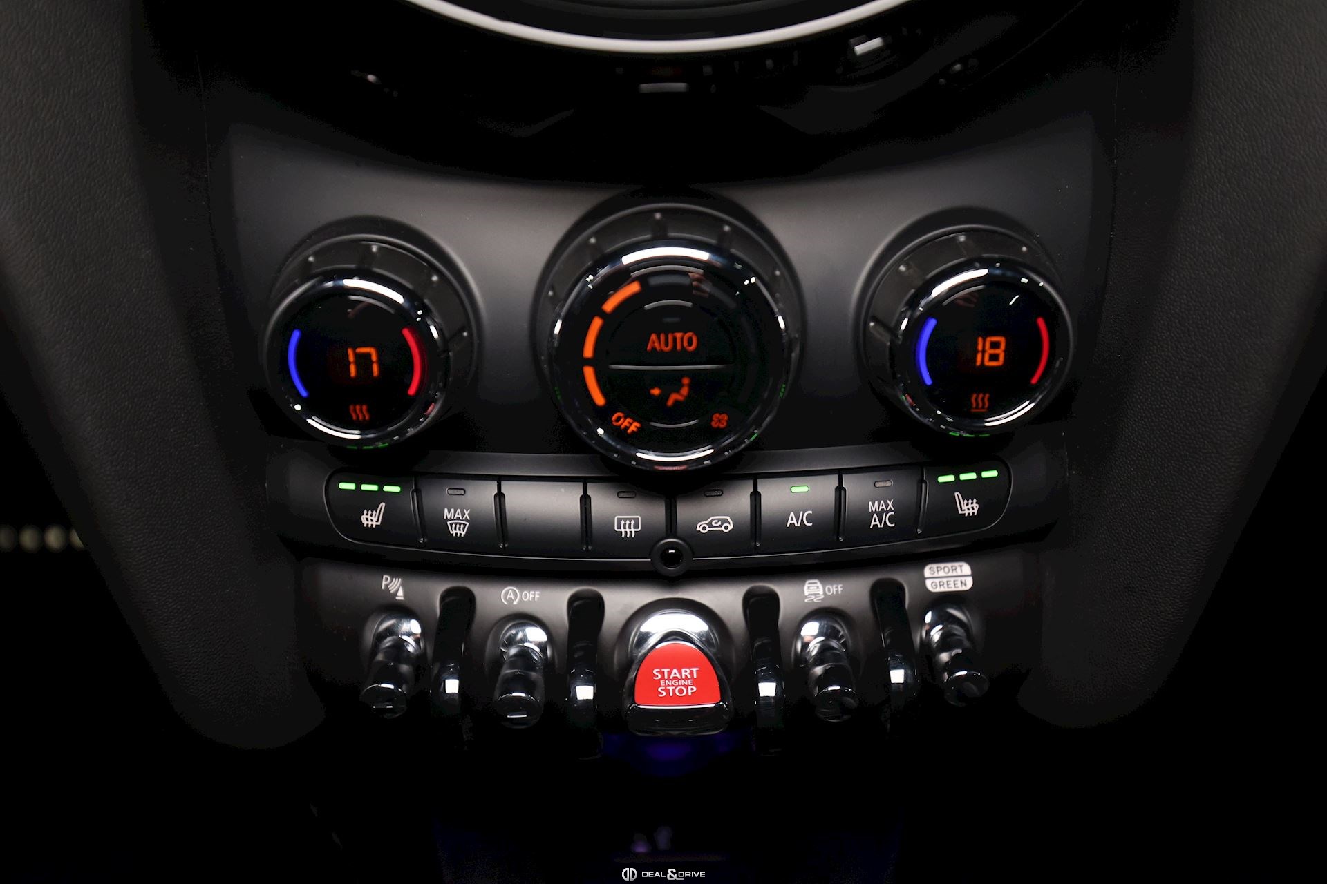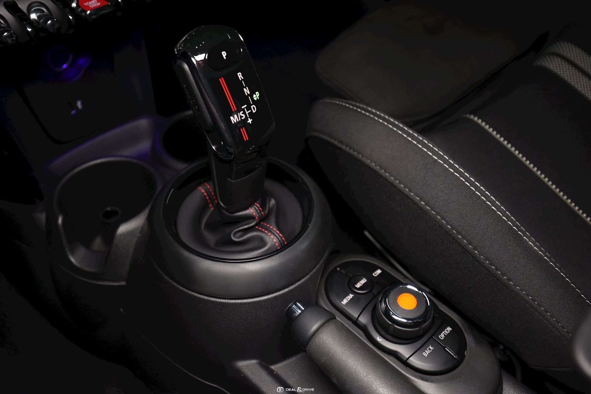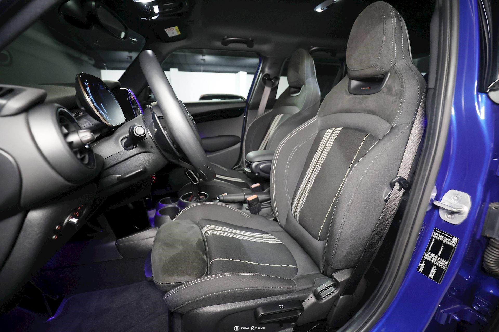 Accoudoir central avant Volant en cuir, multifonctions avec palettes au volant Plafonnier en tissu noir Tapis de sol Rétroviseur intérieur avec fonction anti-éblouissement Sellerie Combinaison tissu Dinamica Sièges avant Sport John Cooper Works Sièges avant chauffants Climatisation automatique 2 zones
