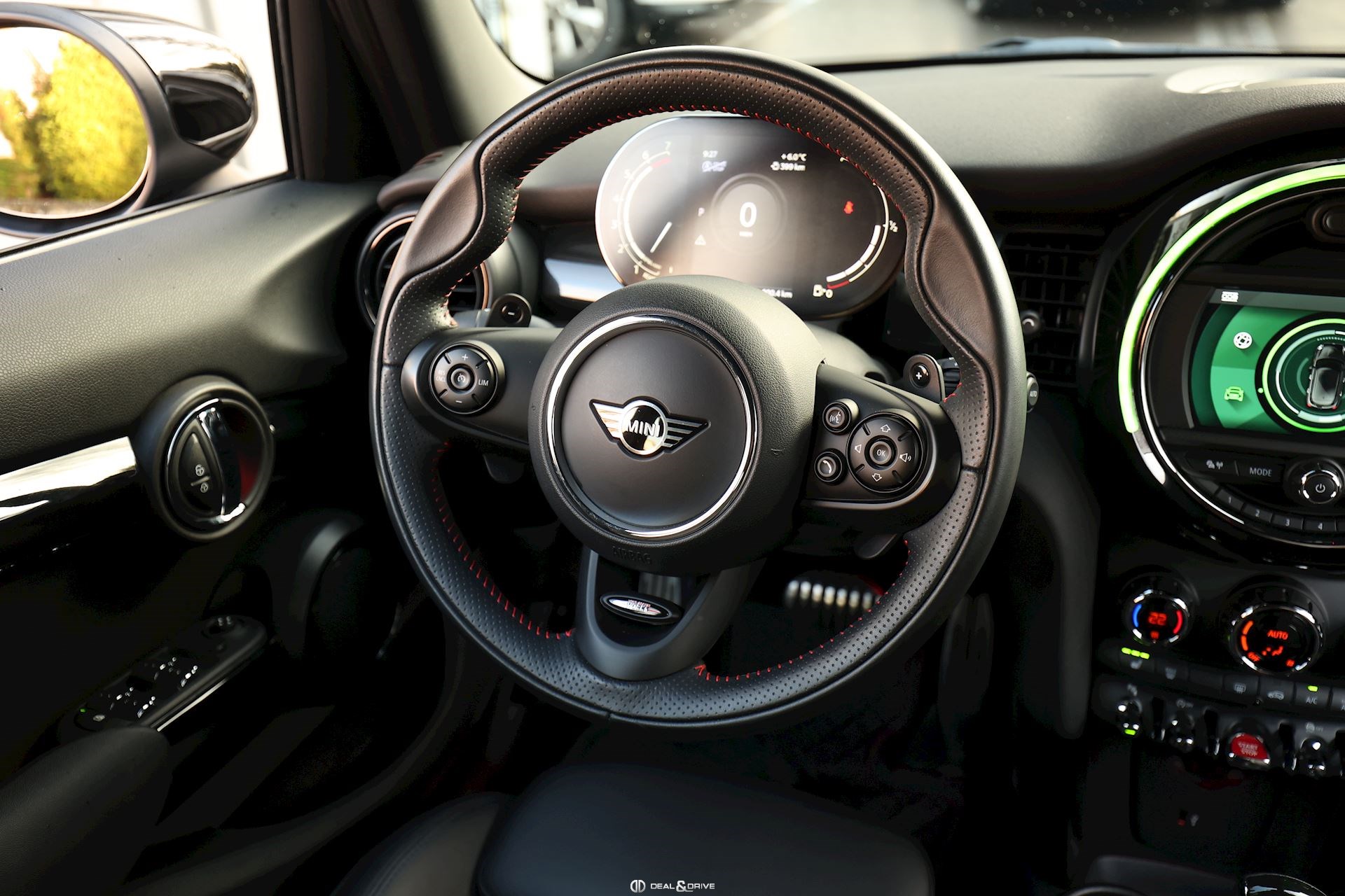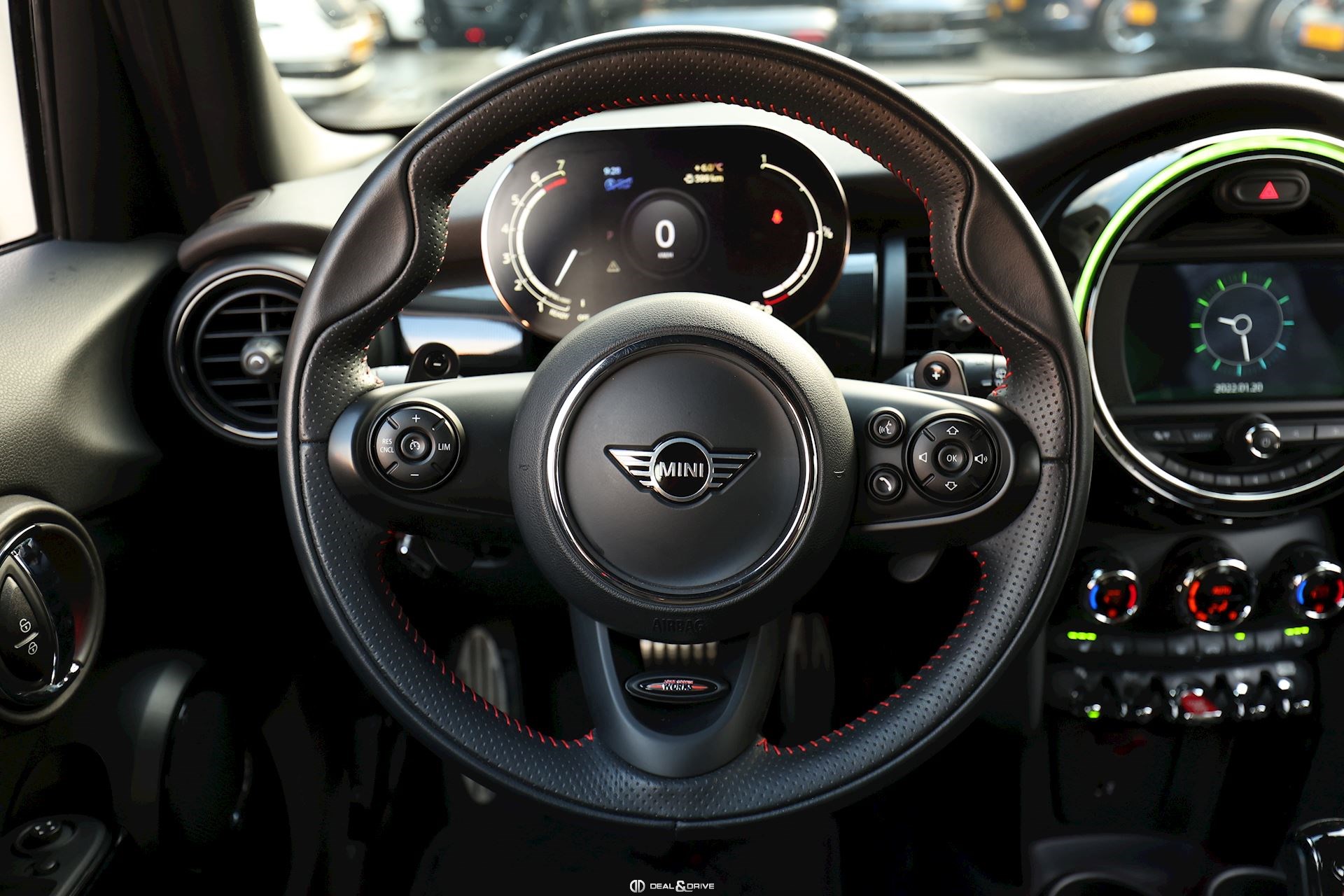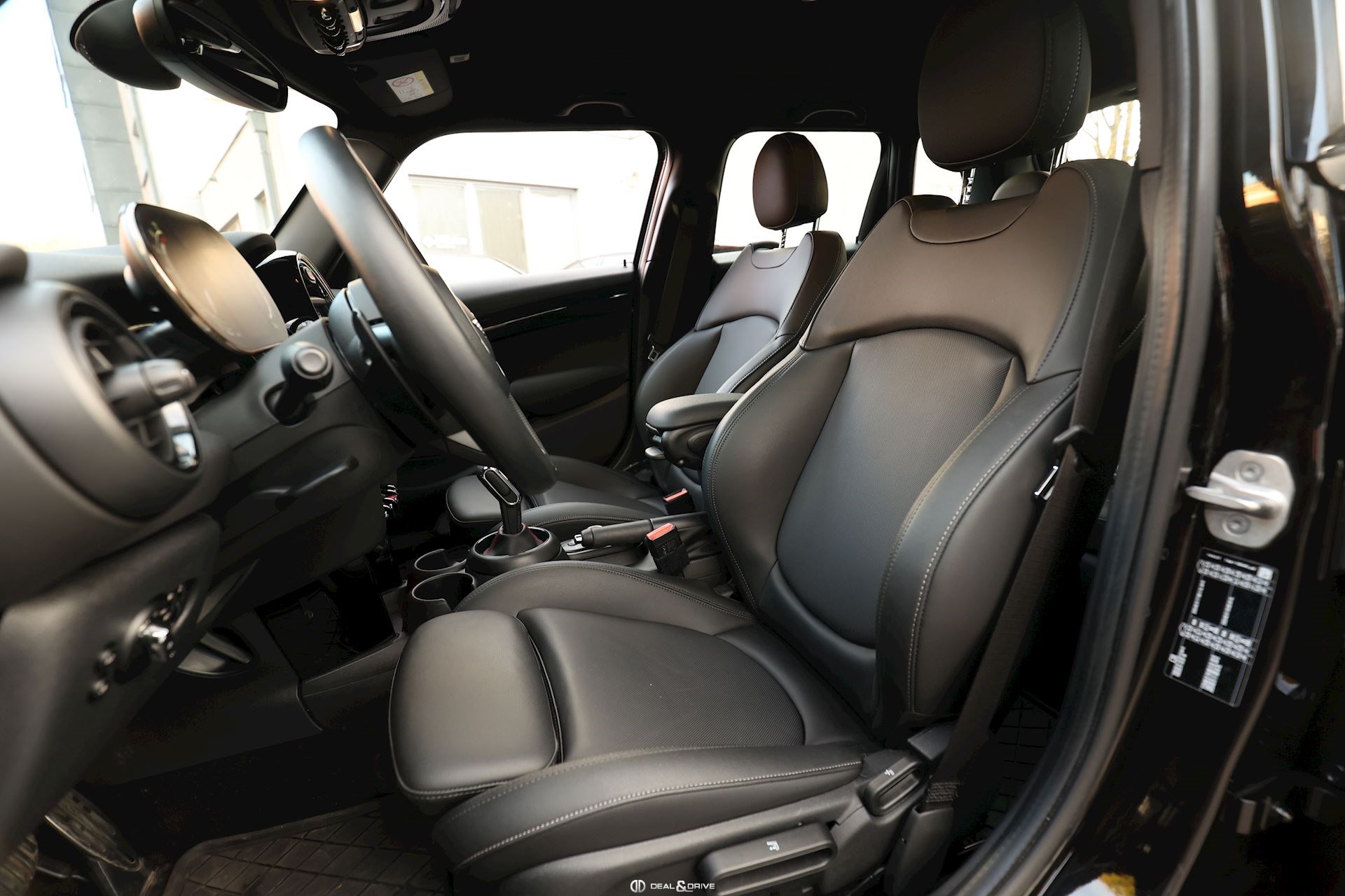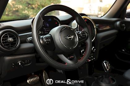 INTÉRIEUR Sièges avant chauffants Climatisation automatique 2 zones Volant sport John Cooper Works en cuir multifonctions avec palettes au volant Plafonnier noir Sellerie cuir Supports Isofix sur le siège passager Seuils de portes avec inscription John Cooper Works