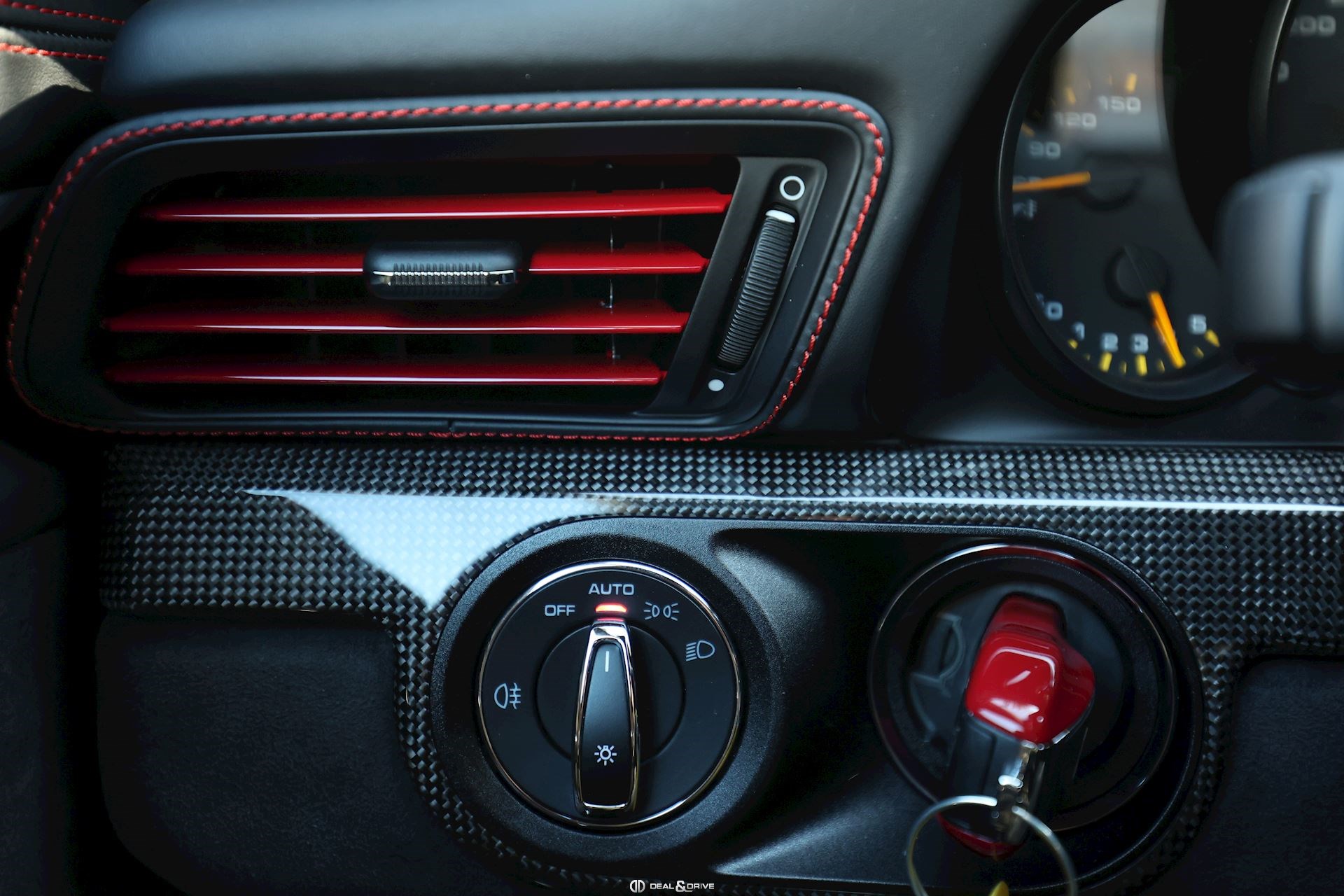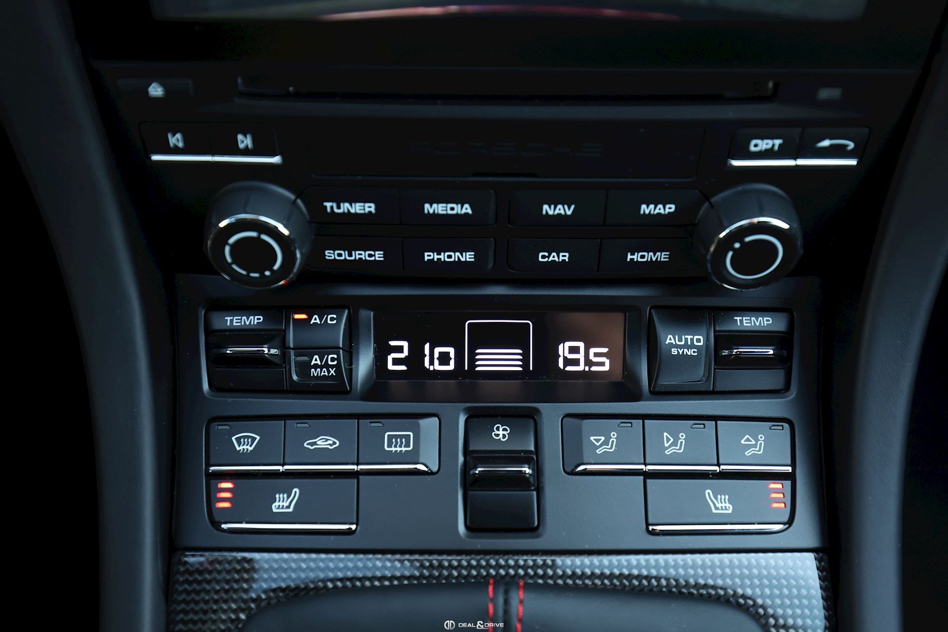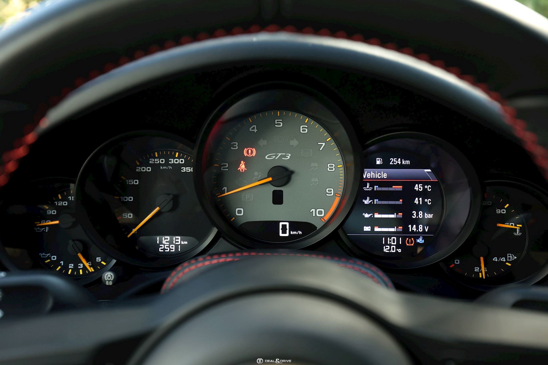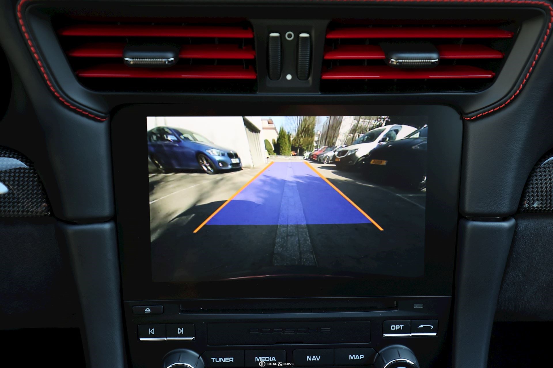 Pack Intérieur carbone Pack coutures décoratives en rouge Pack additionnel intérieur de panneaux de porte en cuir et Alcantara Pack additionnel cuir Baguettes des seuils de porte personnalisées en carbone, illuminées Colonne de direction en cuir Inscription ‘’GT3’’ brodée dans les appuie-têtes en rouge Volant en cuir avec surpiqûres rouges Ceintures de sécurité en couleur Rouge Indien Sortie des ceintures de sécurité en Alcantara Lamelles des buses d’aération peintes en rouge Tapis de sol Porsche personnalisés gansés de cuir rouge Filet de rangement Sellerie cuir et Alcantara Sièges Sport adaptatif Plus Sièges électriques 18 voies Sièges chauffants Dossier des sièges Sport Plus en cuir Tunnel central avant en cuir Accoudoir central en Alcantara avec logo Porsche Climatisation automatique 2 zones Clefs du véhicule peintes en couleur carrosserie Plafonnier en Alcantara noir Pare-soleil en Alcantara Pédalier en Aluminium