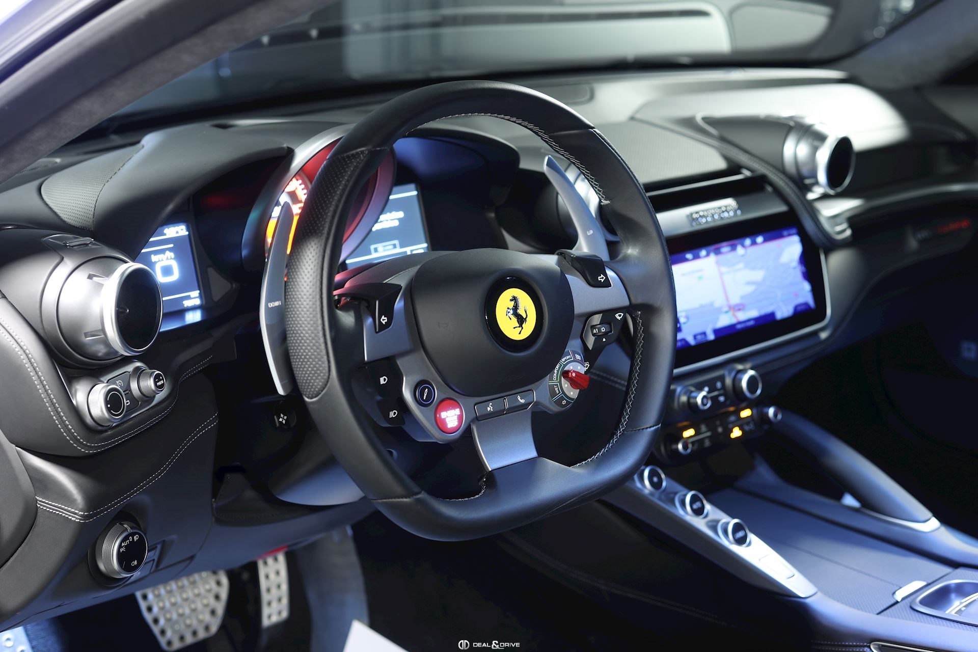 INTÉRIEUR ALIH Plafonnier en Alcantara CHARCOAL EMPH Logo Ferrari de couleur CHARCOAL brodé sur les appuie-têtes PIP2 Inserts intérieurs en cuir CHARCOAL RPMA Compte tour de couleur Aluminium RSFV Sièges avant réglables électriquement avec fonction ventilation STC2 Coutures contrastées en couleur CHARCOAL UALZ Partie supérieure de l'habitacle en Alcantara CHARCOAL Climatisation automatique 2 zones Rétroviseur intérieur avec fonction anti-éblouissement Volant en cuir multifonctions Sièges avant chauffants Appui-lombaires électriques Sièges avant avec fonction mémoire et fonction Easy Entry