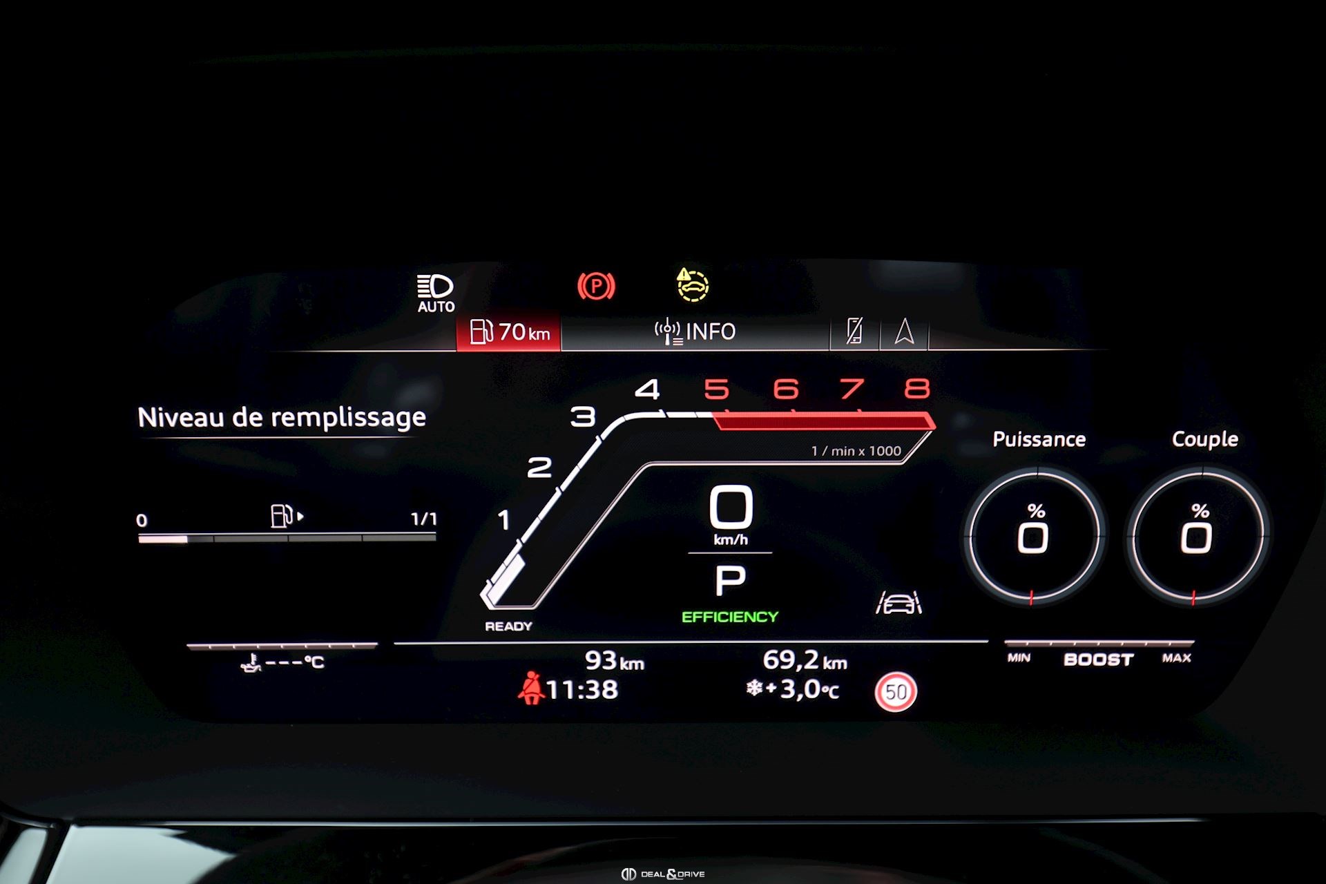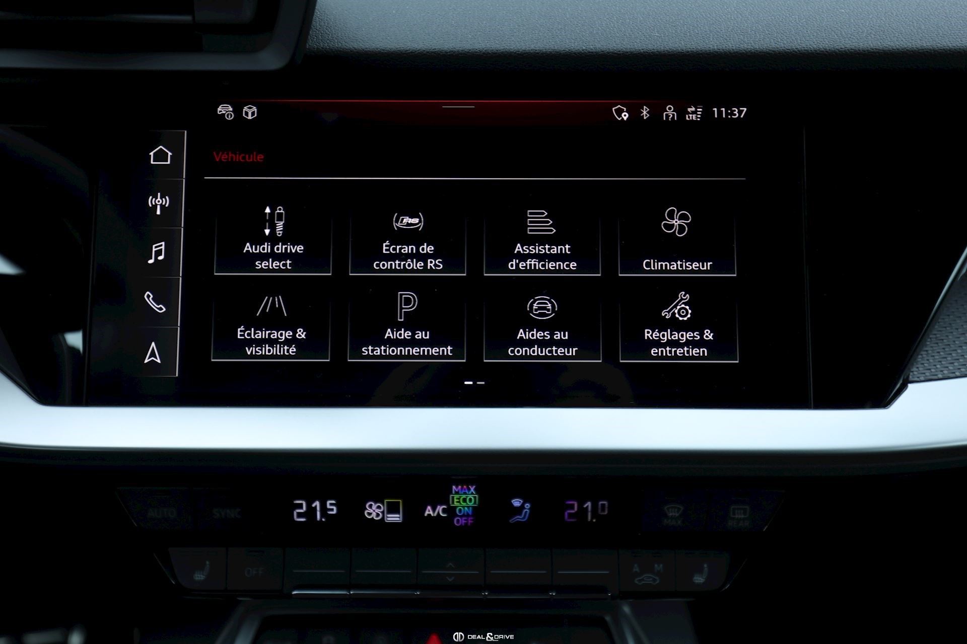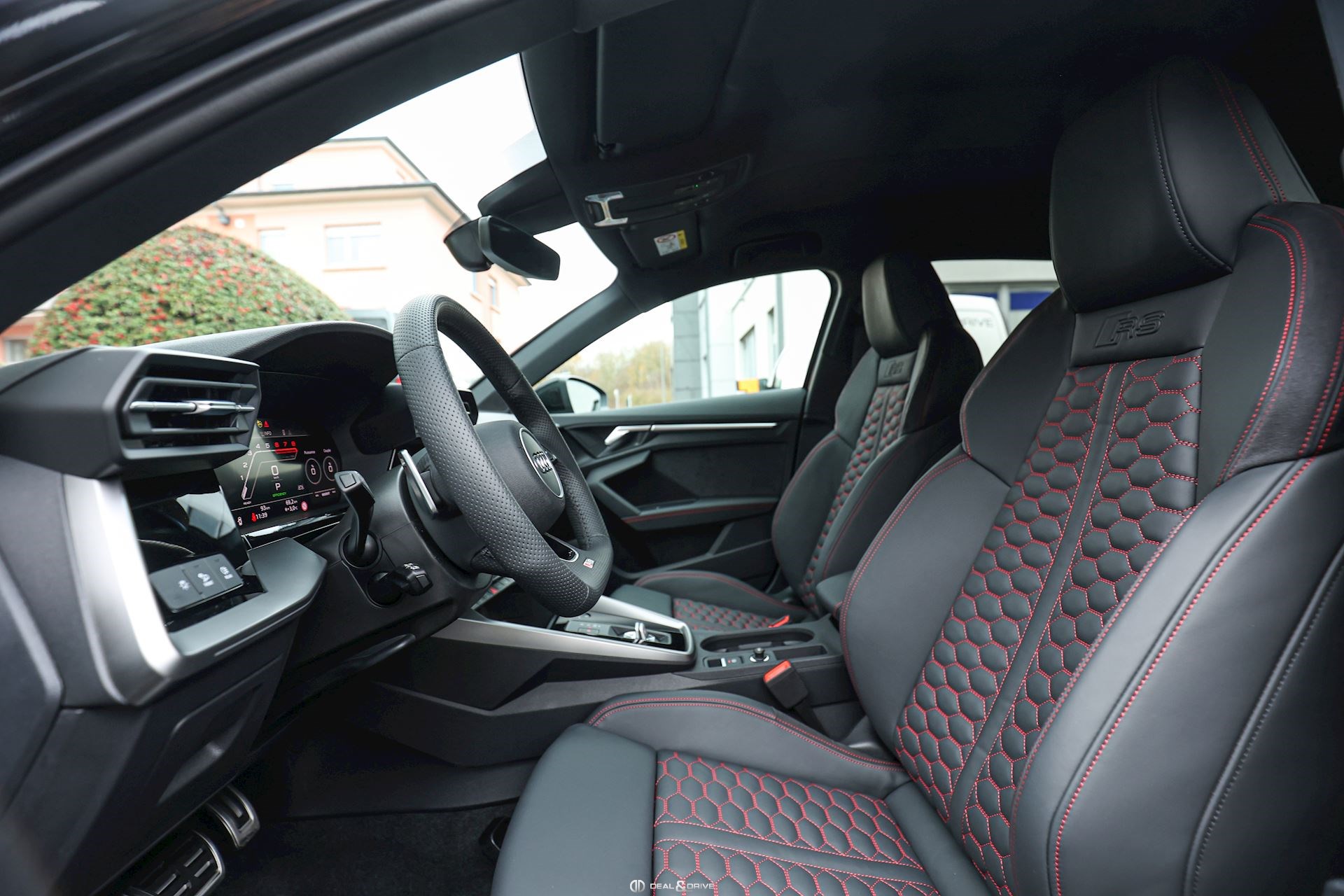 INTÉRIEUR Pack Premium Sièges avant chauffants Rétroviseur intérieur avec fonction anti-éblouissement Avertissement de changement de voie avec avertissement de sortie et assistant de trafic transversal arrière Sellerie en cuir Nappa fin avec embossage RS et surpiqûres alvéolées Appuie-lombaires électriques Aide au démarrage en côte Hold Assist Audi Pre Sense Basic