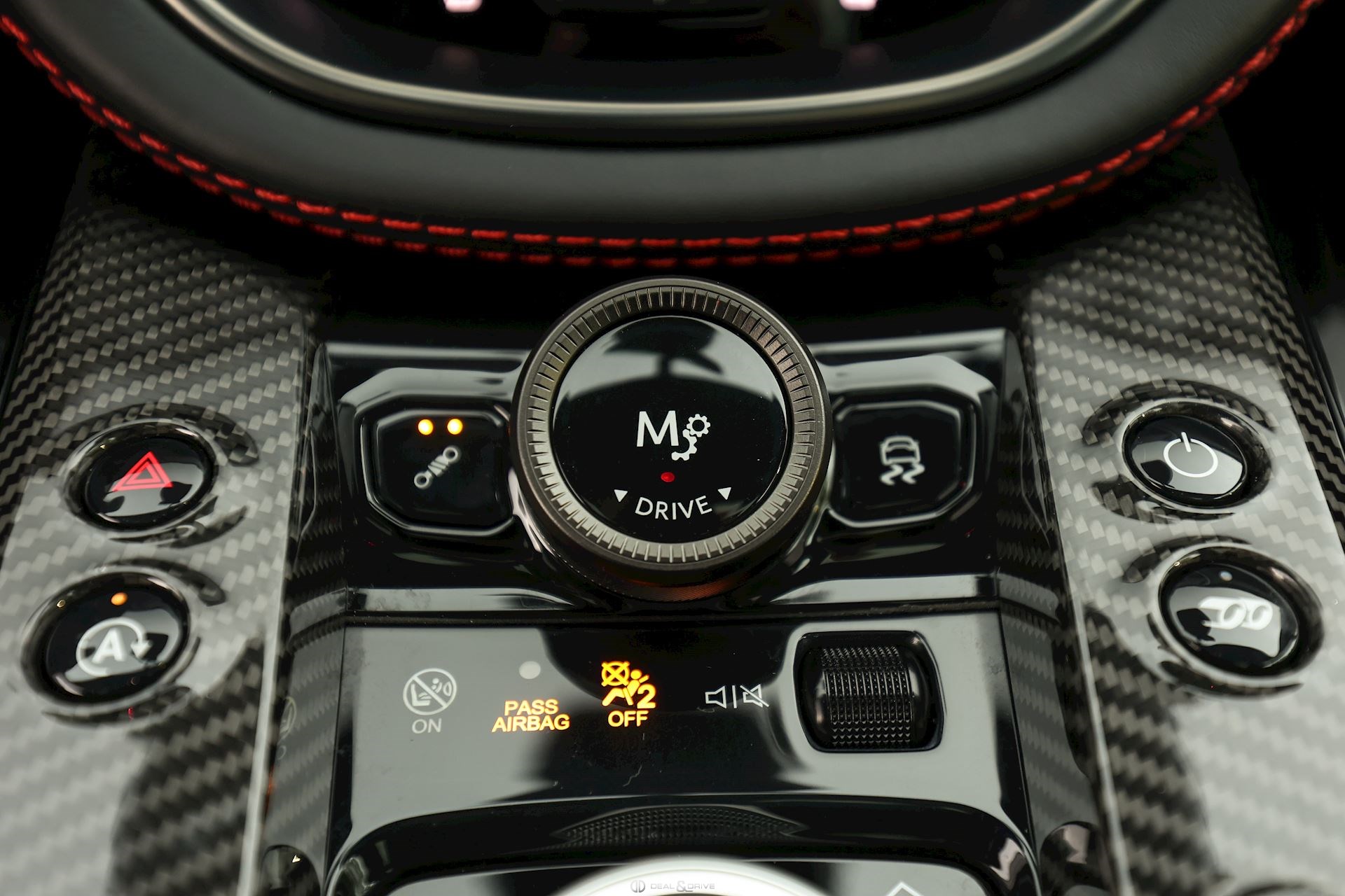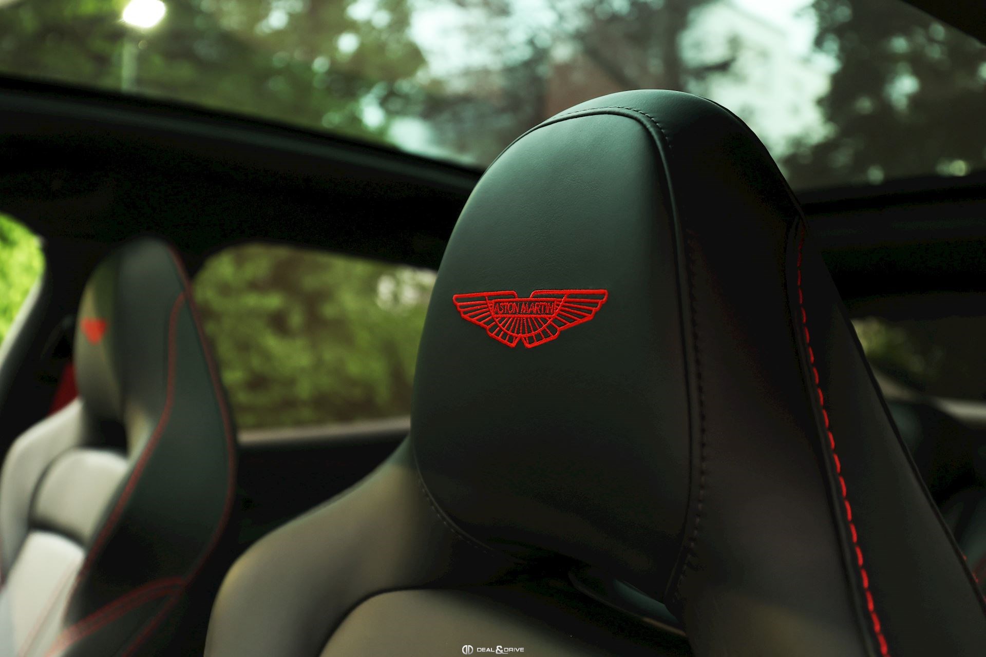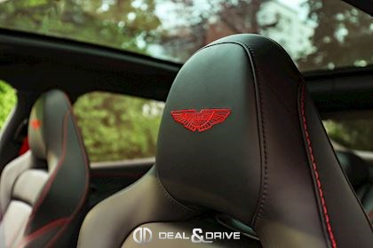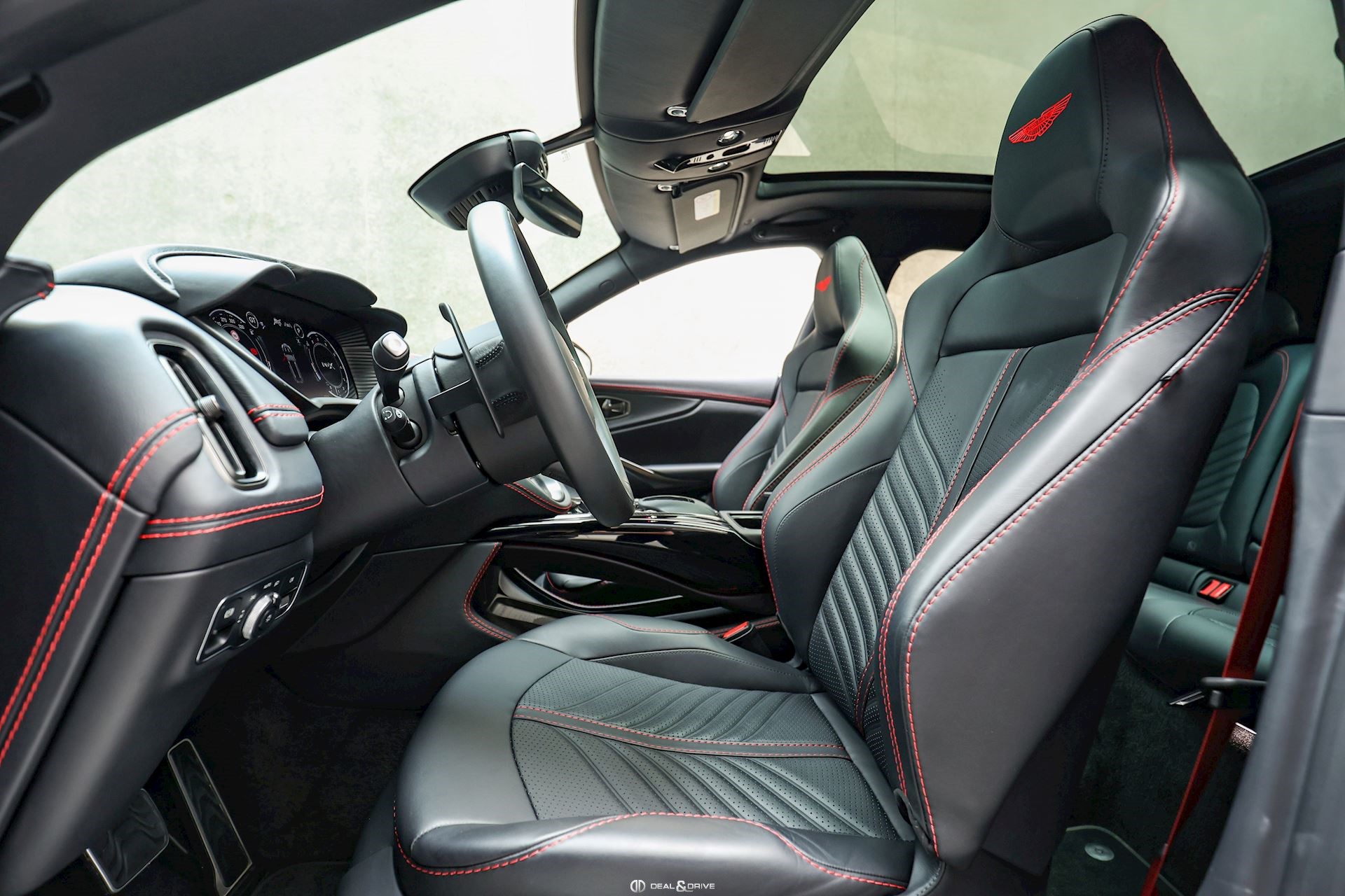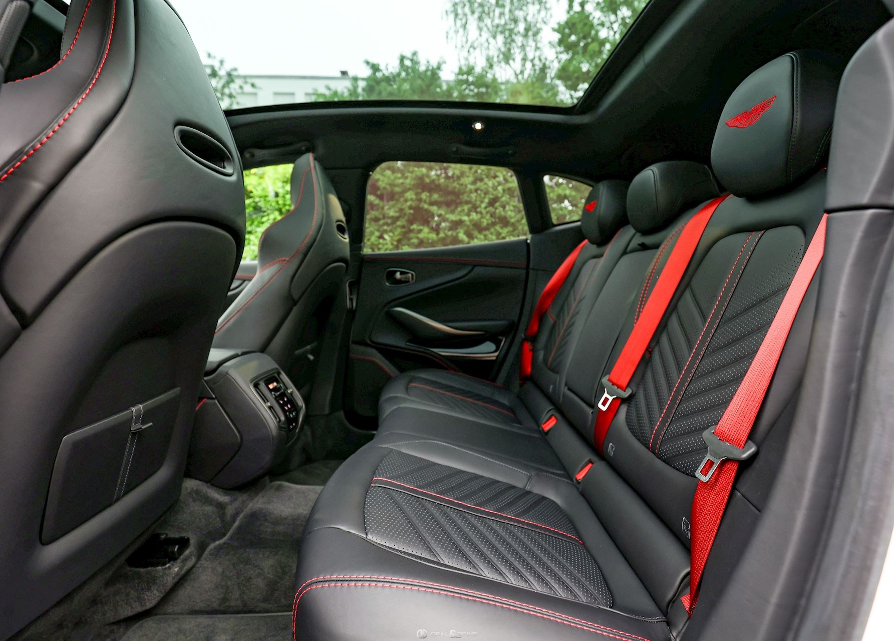 INTÉRIEUR Inserts en Carbone brillant Volant en cuir, multifonctions Volant réglable électriquement Volant chauffant Ceintures de sécurité Spice Red Sièges avant électriques Siège conducteur avec fonction mémoire Sièges avant chauffants Sièges avant ventilés Sièges arrière chauffants Sièges arrière ventilés Surpiqûres rouges Emblème Aston Martin brodé sur les appuie-têtes en Rouge Tapis de sol Plafonnier Noir Pare-soleils doubles