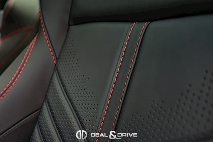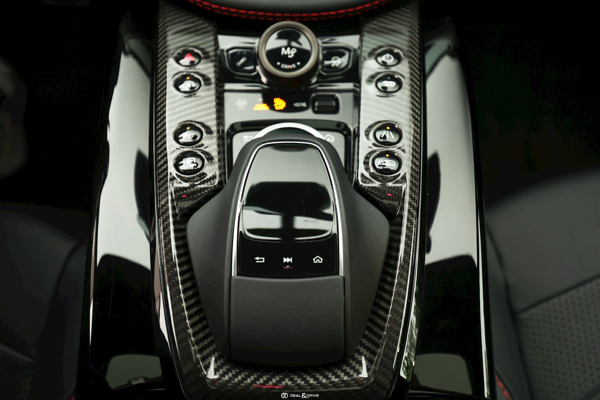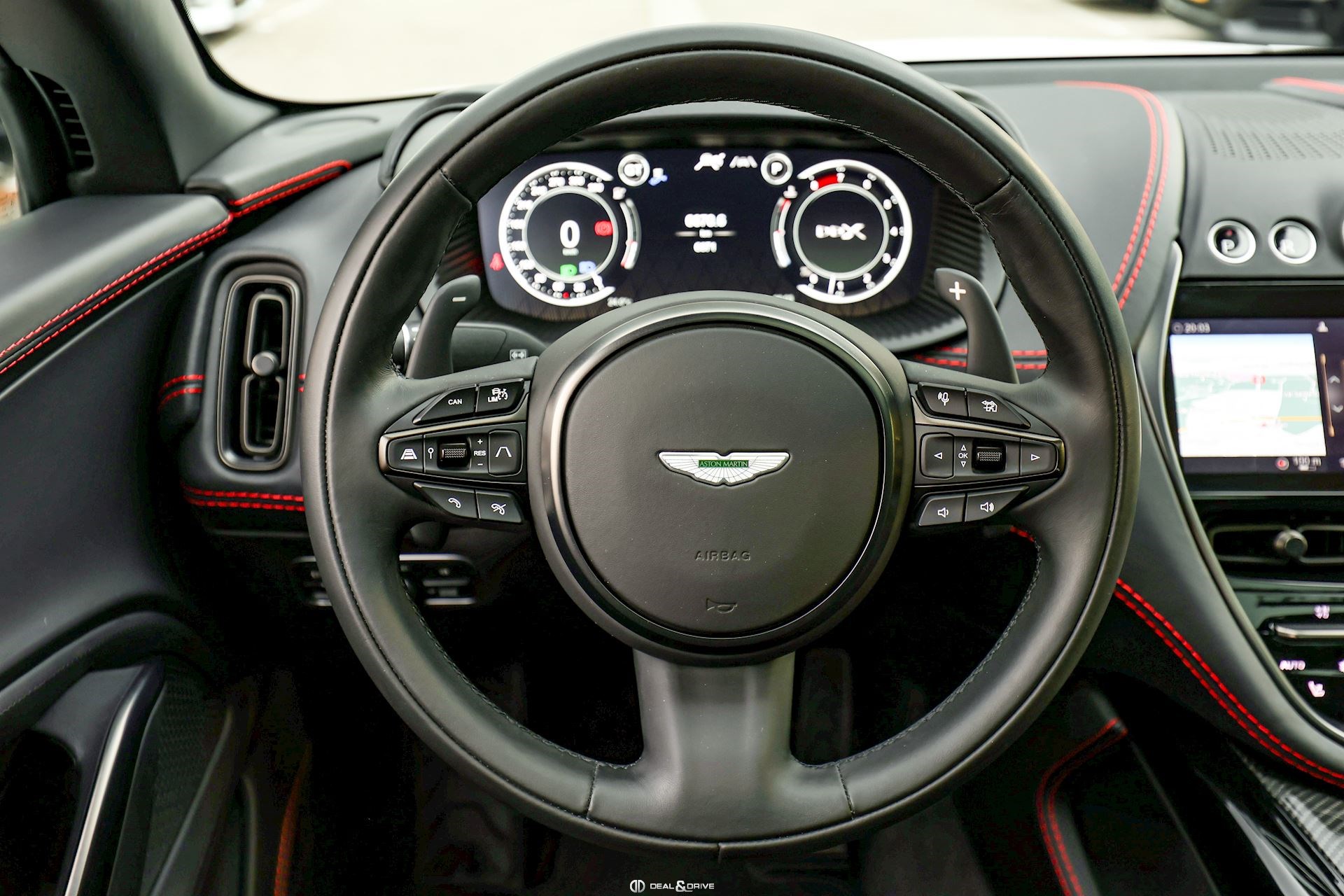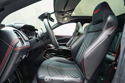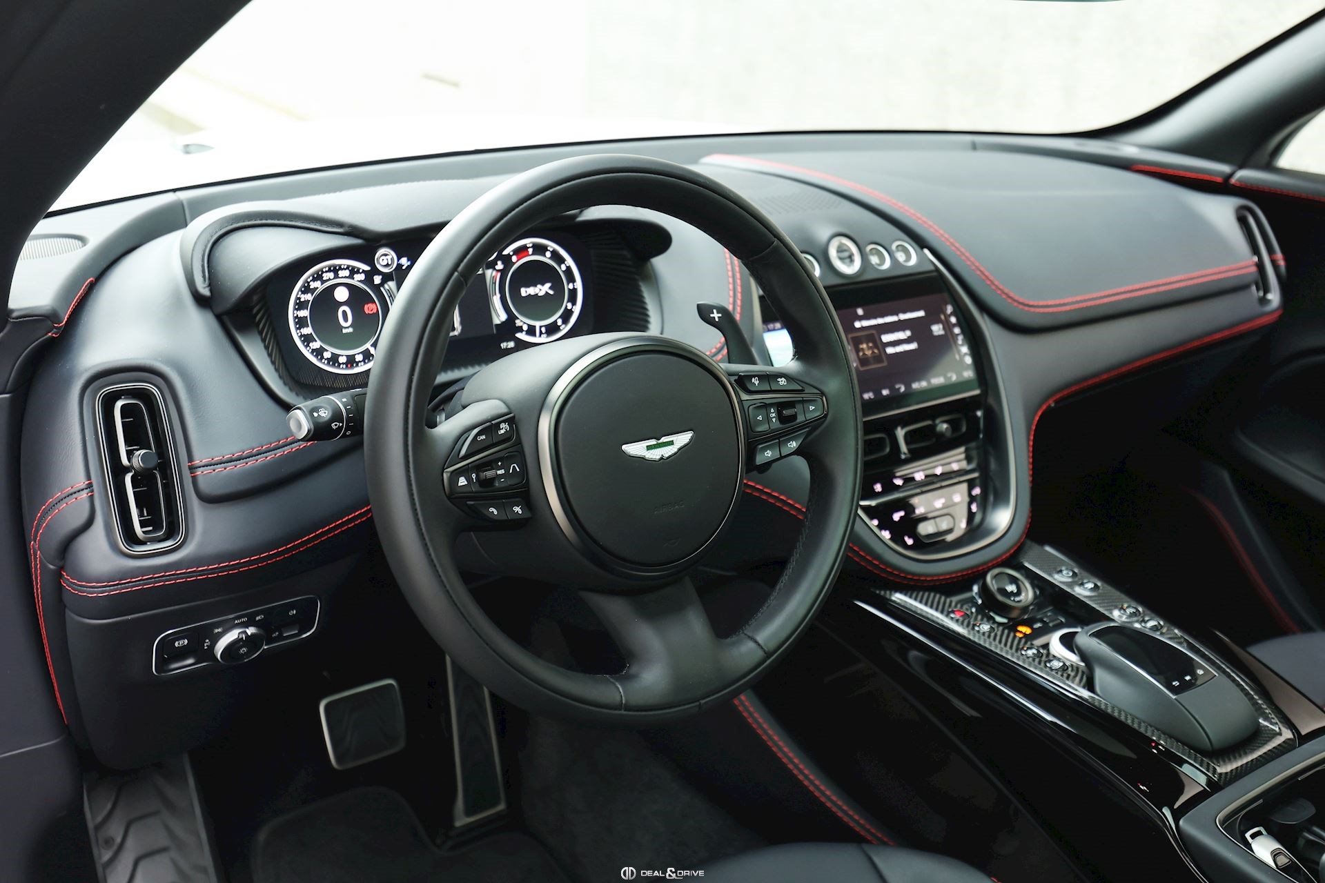 INTÉRIEUR Inserts en Carbone brillant Volant en cuir, multifonctions Volant réglable électriquement Volant chauffant Ceintures de sécurité Spice Red Sièges avant électriques Siège conducteur avec fonction mémoire Sièges avant chauffants Sièges avant ventilés Sièges arrière chauffants Sièges arrière ventilés Surpiqûres rouges Emblème Aston Martin brodé sur les appuie-têtes en Rouge Tapis de sol Plafonnier Noir Pare-soleils doubles