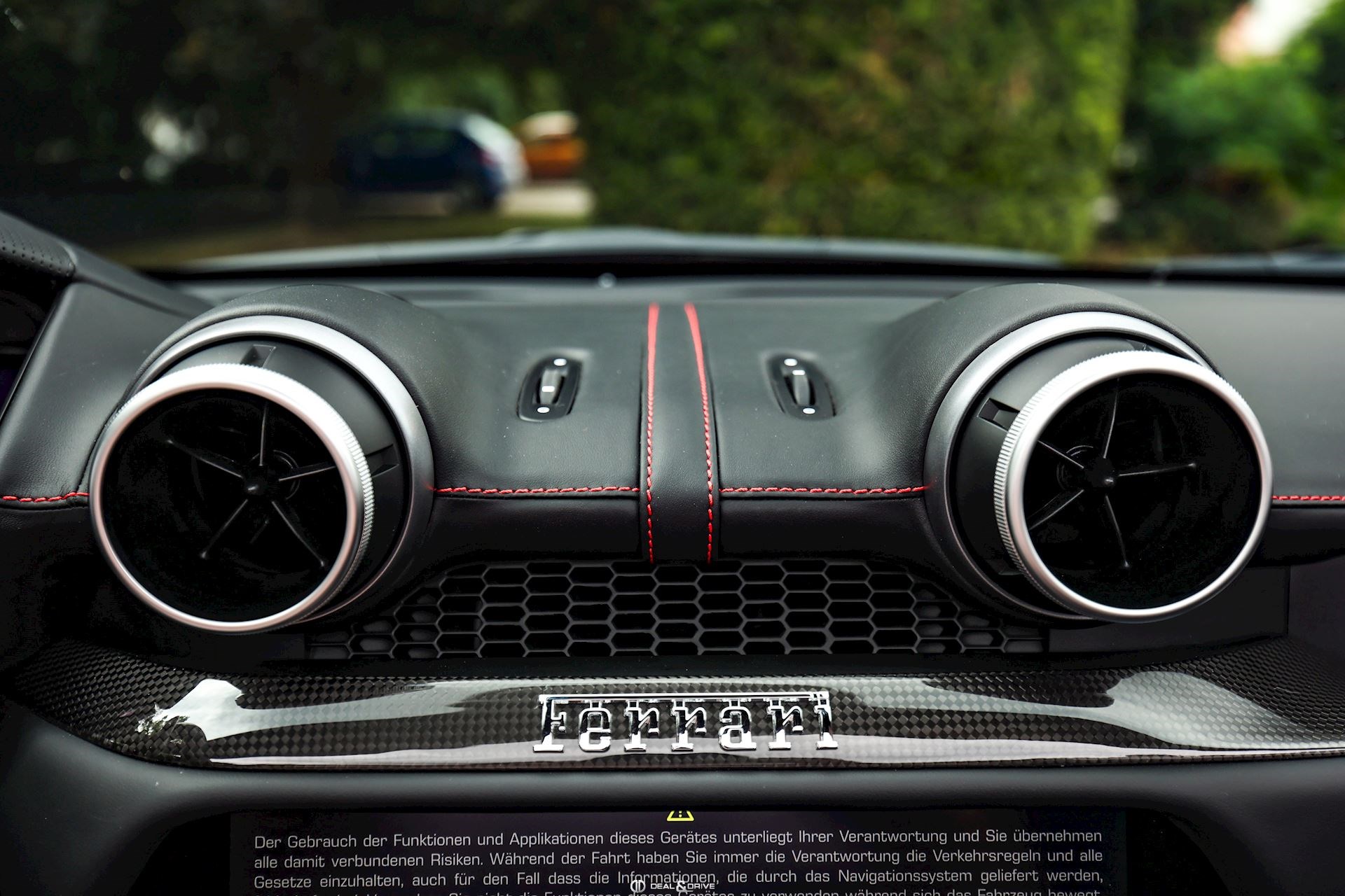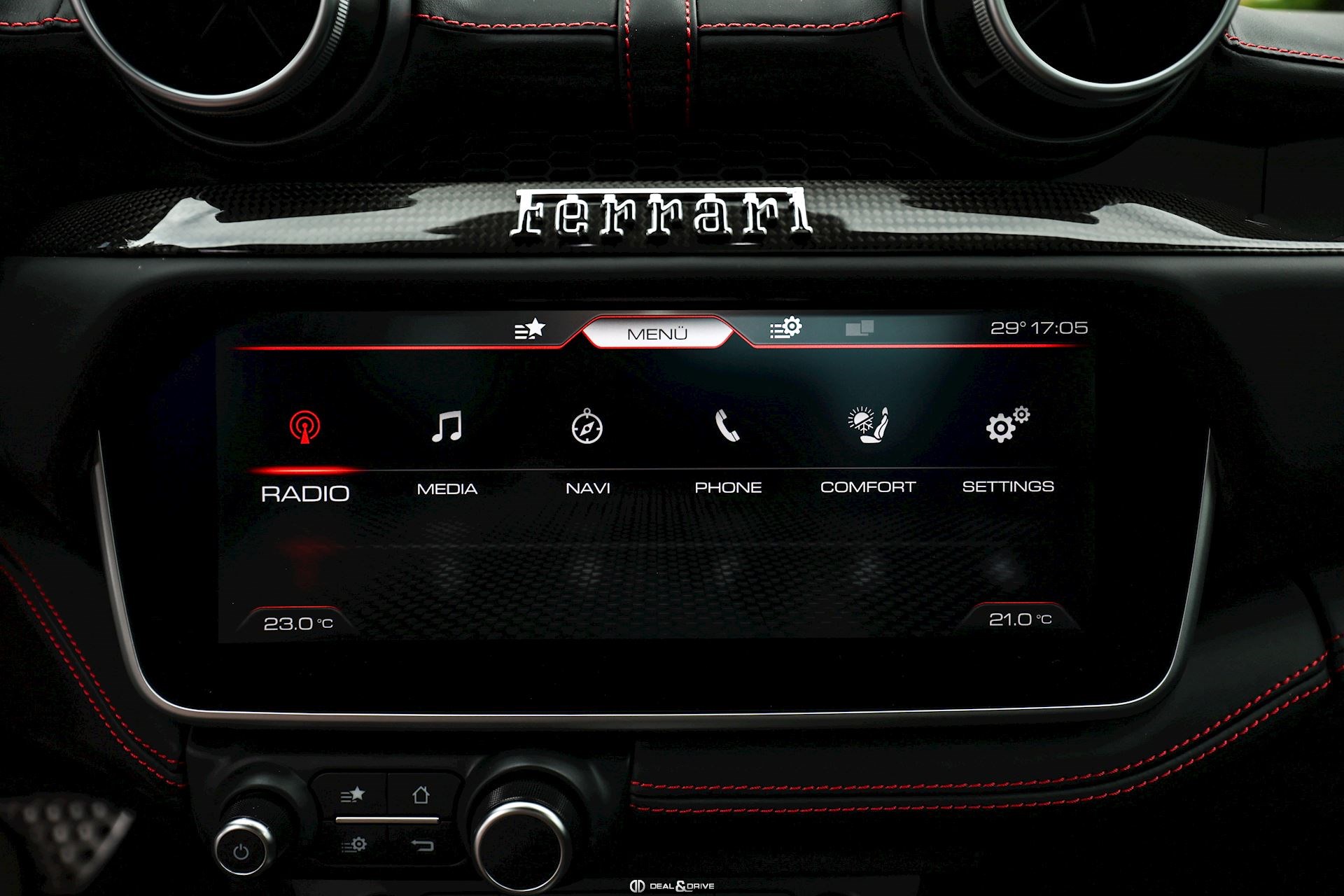 INTÉRIEUR AIRS Chauffage de nuque CIDL Zone du conducteur en Carbone avec volant à LEDs CILR Tunnel central en Carbone DATR Inserts sur le tableau de bord en Carbone DAYT Sièges style Daytona EMPH Cavallino brodé sur les appuie-têtes en Rosso 0504 FLMA Tapis de sol avec LOGO MIR3 Rétroviseur intérieur avec fonction anti-éblouissement RSFV Sièges électriques et ventilés SKPA Banquette arrière rabattable STC2 Surpiqûres en ROSSO 0504 MATS Tapis de sol en Nero CITP Porte-gobelets en Carbone