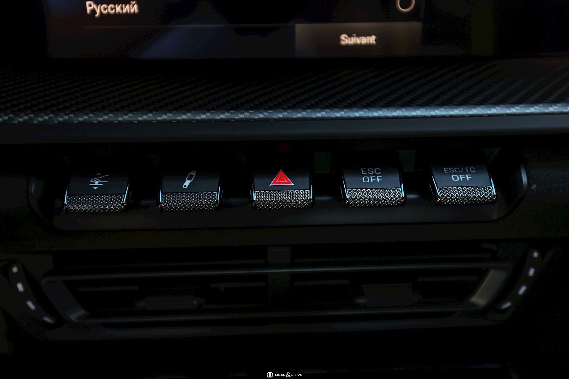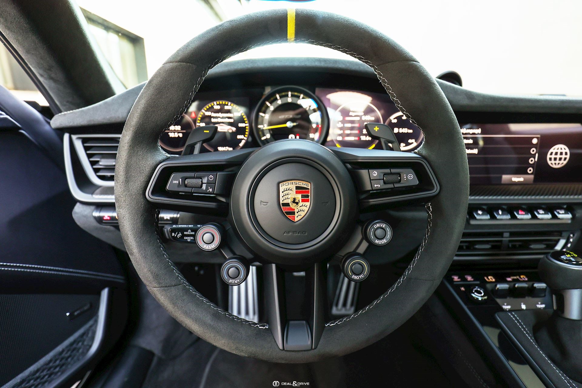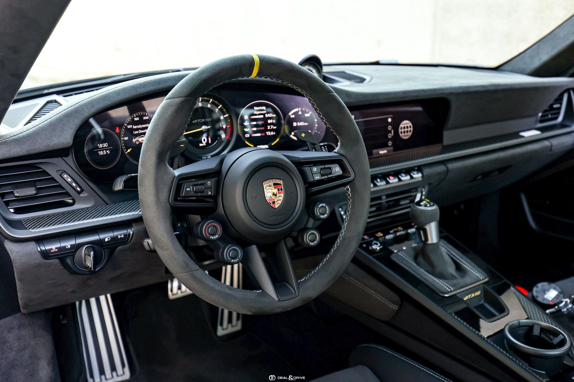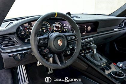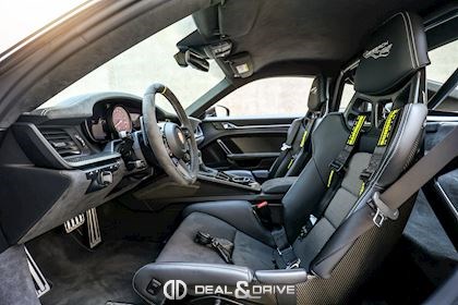 INTÉRIEUR Volant GT Race-Tex, multifonctions Sièges baquets en Carbone Inserts en Carbone satiné Système de pédales et Repose-pied en Aluminium Seuils de porte en Carbone, éclairés Pare-soleils en Race-Tex Console centrale en Race-Tex avec logo Porsche Plafonnier Noir Climatisation automatique 2 zones
