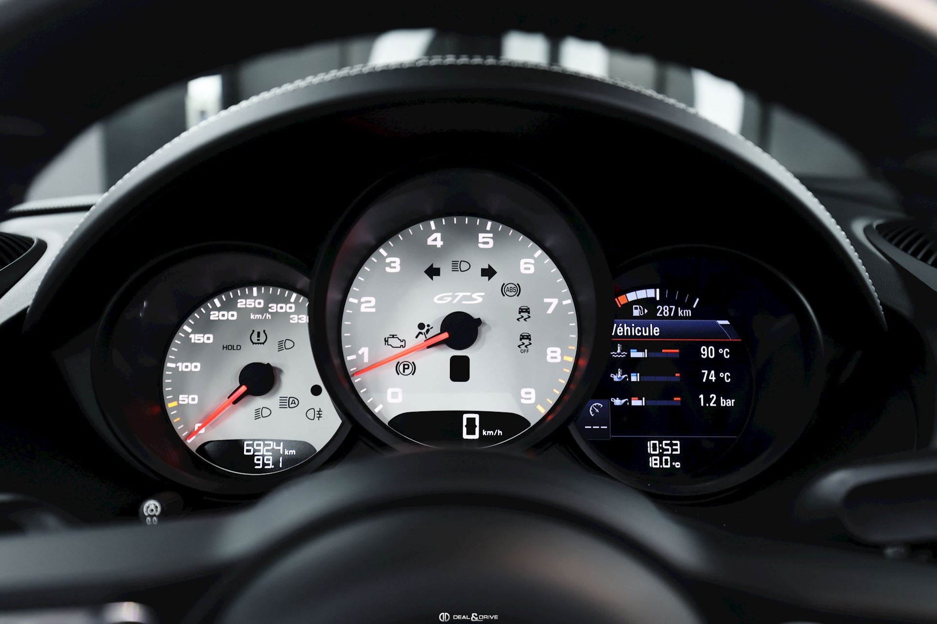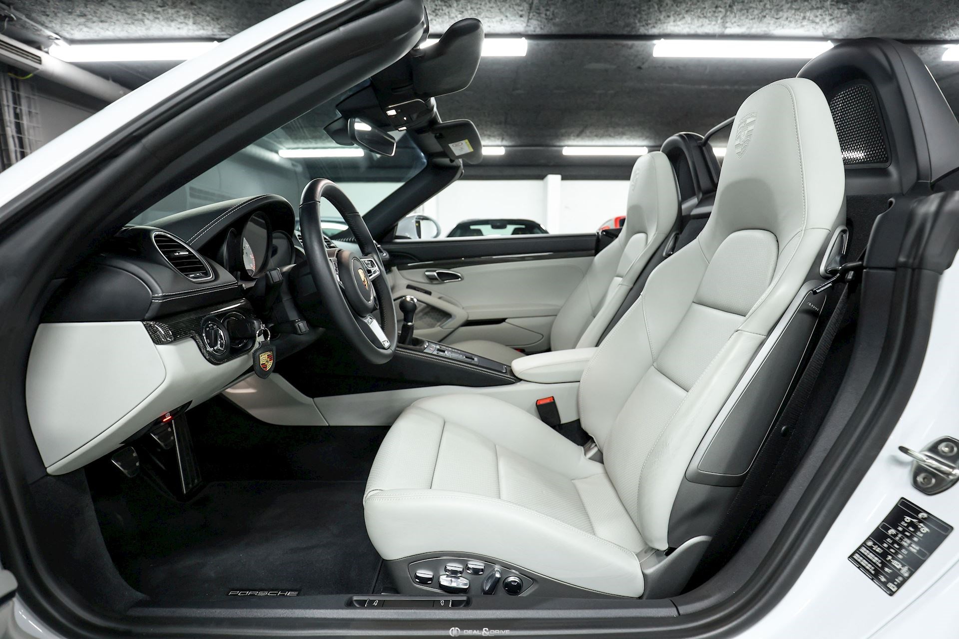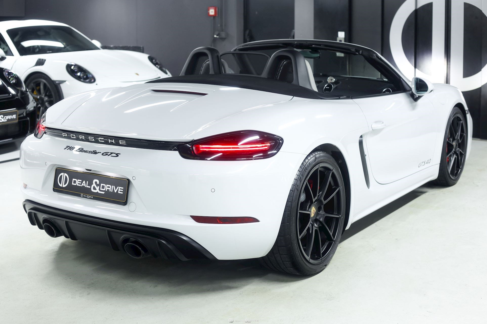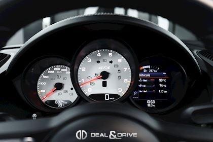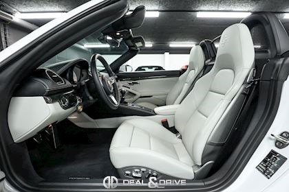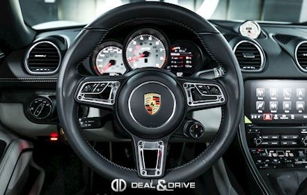 CO2 combiné : 247 g/km Accessoires : Déflecteur d’air Véhicule équipé d’un film de protection sur la face avant (pare-chocs avant, capot, montants de pare-brise, coques des rétroviseurs extérieurs) MOTEUR, TRANSMISSION ET CHÂSSIS Châssis et suspension Sport Porsche Active Suspension Management PASM Porsche Stability Management PSM Système d’échappement Sport Porsche Torque Vectoring PTV Direction assistée Plus, asservie à la vitesse Réservoir à carburant 64 litres EXTÉRIEUR Jantes alliage léger 20’’ 718 en Noir satiné Étriers de frein rouges Caches moyeux Porsche en couleur Rétroviseurs extérieurs électriques Rétroviseurs extérieurs et intérieur avec fonction anti-éblouissement Capote en couleur Noir Bandeau supérieur dégradé Caches des lave-phares peints en couleur carrosserie Désignation du modèle peinte en Noir satiné LUMIÈRE ET VISIBILITÉ Feux LED comprenant Porsche Dynamic Light Système Plus PDLS+ Réglage à distance des projecteurs Feux de croisement automatiques Feux de route automatiques Éclairage directionnel Éclairage diurne LED 4 points Lave-phares PACK Pack Sport Chrono Pack intérieur carbone Pack éclairage intérieur / Pack Design Lumière CONFORT, SYSTÈME D’ASSISTANCE Régulateur de vitesse Aides au stationnement avant et arrière Caméra de recul Système de contrôle de la pression des pneus TPM Système d’alarme antivol INTÉRIEUR Sellerie en cuir Bi-ton Sièges électriques réglables en18 voies avec pack mémoire pour le conducteur Sièges avant chauffants Volant GT Sport en Cuir, multifonctions Volant chauffant Volant réglable électriquement Appuie-têtes avec écusson Porsche Fond de compteur en Blanc Fond du chronomètre Sport Chrono en Blanc Climatisation automatique 2 zones Filet de rangement sur la console centrale Seuils de porte en carbone, éclairés avec désignation du modèle Tapis de sol MULTIMÉDIA Apple CarPlay Radio numérique DAB+ Porsche Communications Management PCM Système de navigation Porsche Car Connect Porsche Vehicle-Tracking-System Plus Système de commande vocale Sous réserve d’erreurs