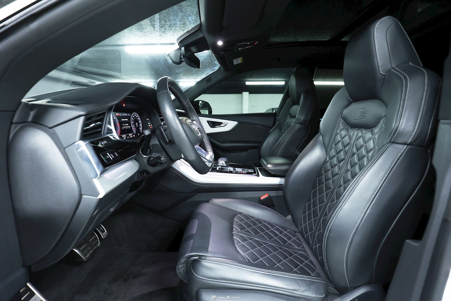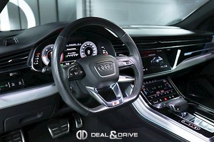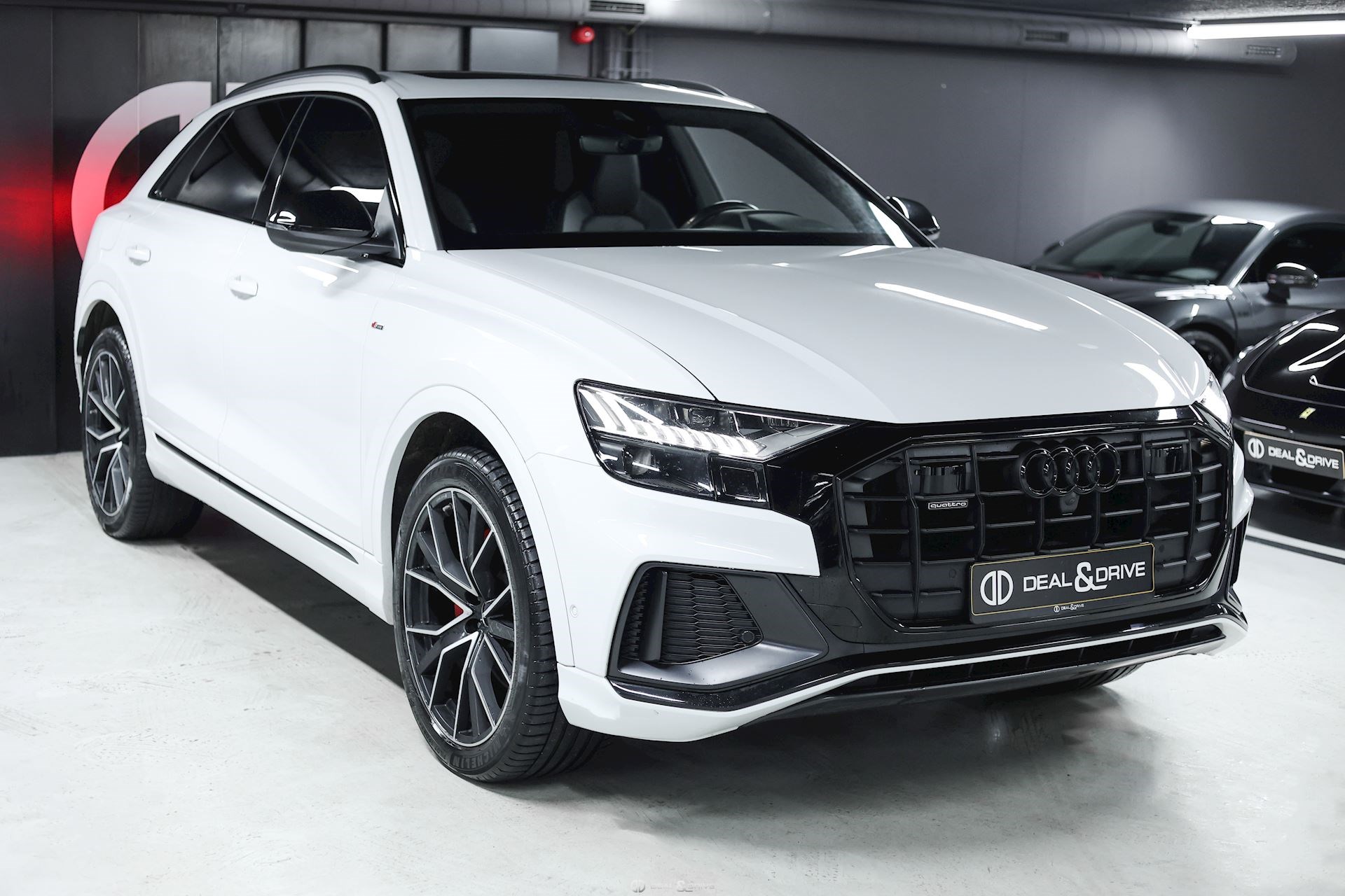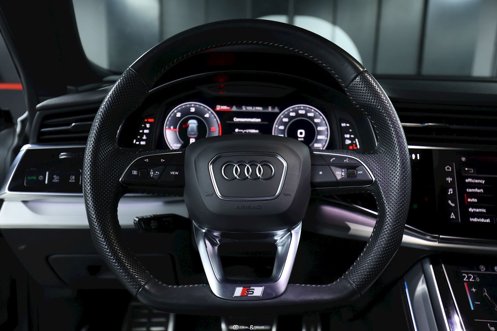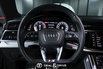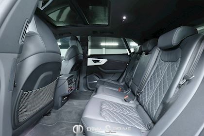 Sellerie en cuir Valcona avec piqûres en losange Système audio BANG & OLUFSEN Inserts de portes en Alcantara Feux Matrix LED HD Feux de croisement automatiques Feux de route automatiques Accoudoir central avant avec équipement Confort Audi Music Interface Audi Smartphone Interface Barres de toit en Noir Sélecteur des modes de conduite Audi Drive Select Suspension pneumatique Climatisation automatique 4 zones Clef confort Seuil de chargement en Inox Hayon électrique Volant en cuir, multifonctions Volant réglable électriquement Audi Virtual Cockpit Plus Système de contrôle de la pression des pneus Interface Bluetooth Système de commande vocale Ports USB Système de navigation Pare-soleils doubles Plafonnier Noir Jantes alliage léger 22'', 5 branches en V avec Design étoile, Anthracite Lave-phares Rideaux pare-soleils à l'arrière Coques des rétroviseurs extérieurs en Noir Sièges Sport Plus Sièges avant électriques Sièges avant avec fonction mémoire Appuie-lombaires électriques Aides au stationnement avant et arrière APS Plus Camréa 360° avec Top View Vitrage arrière surteinté Toit ouvrant panoramique Toutes roues directrices Audi Phone Box Etriers de frein en Rouge