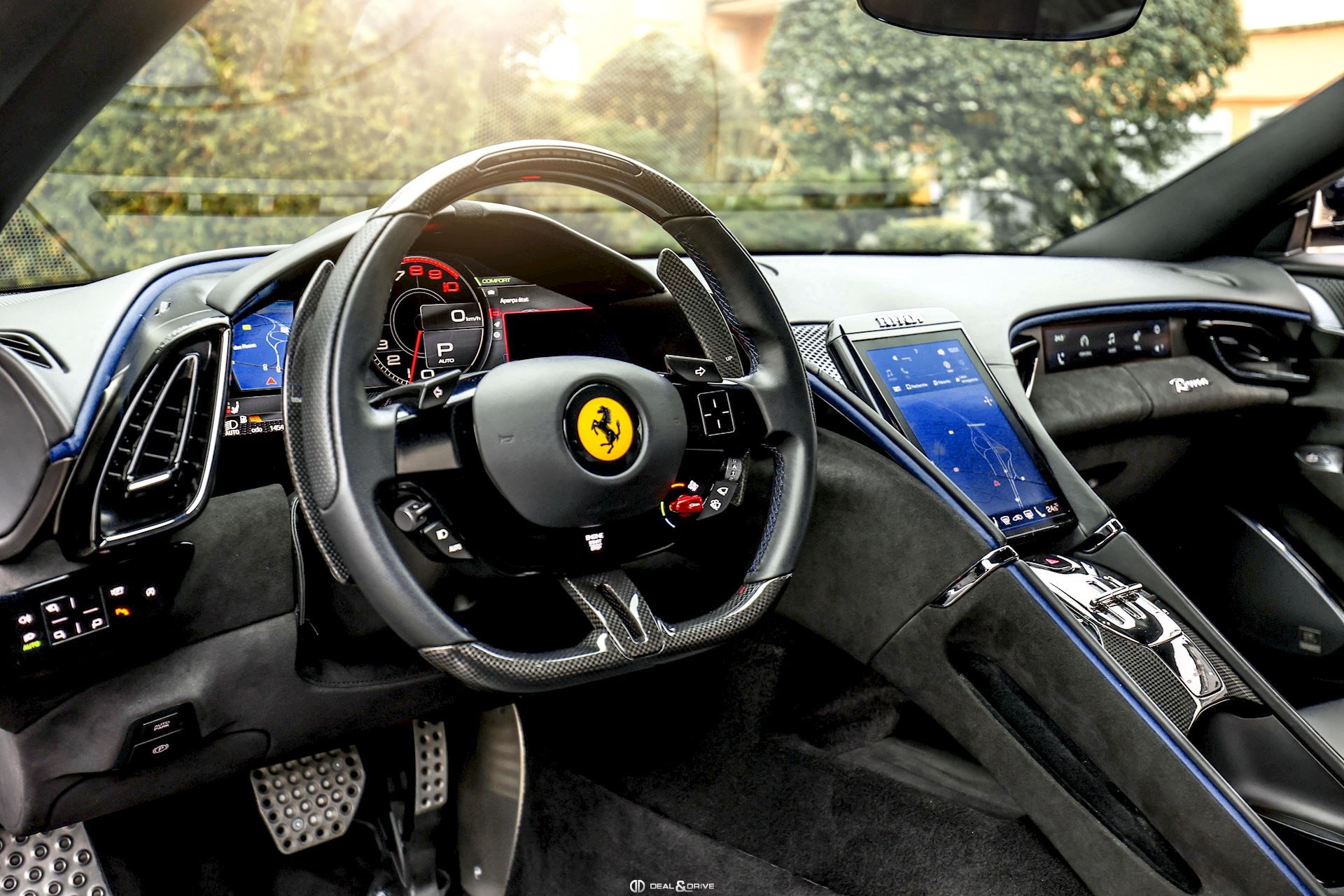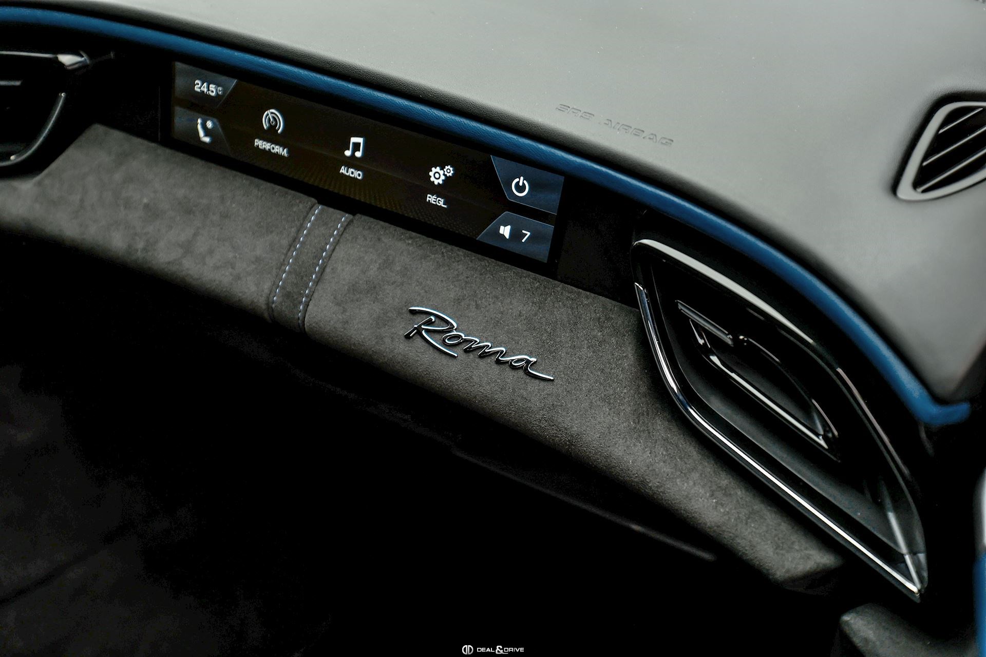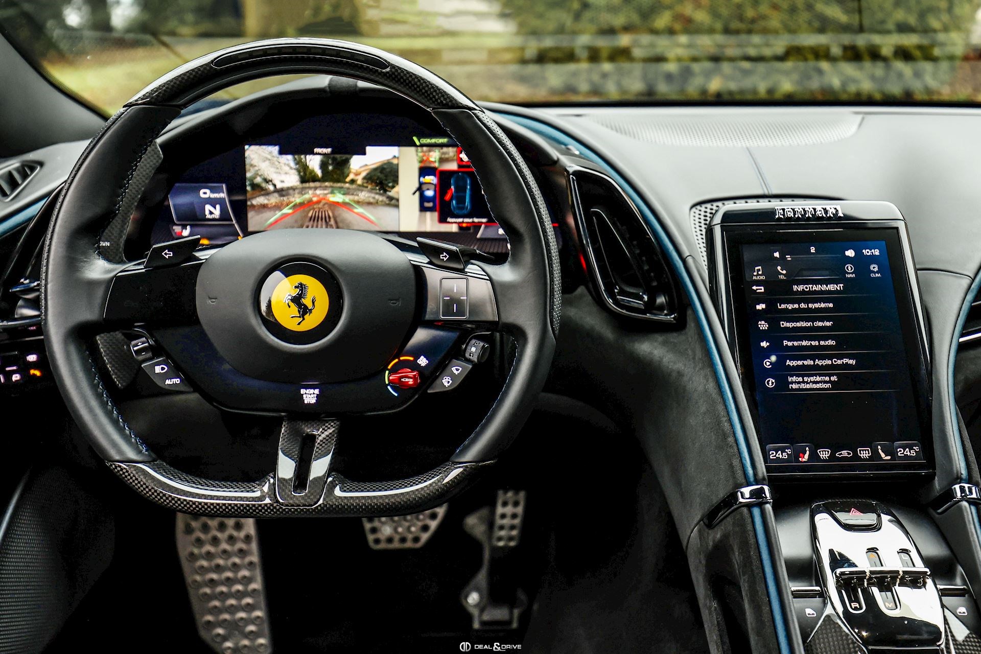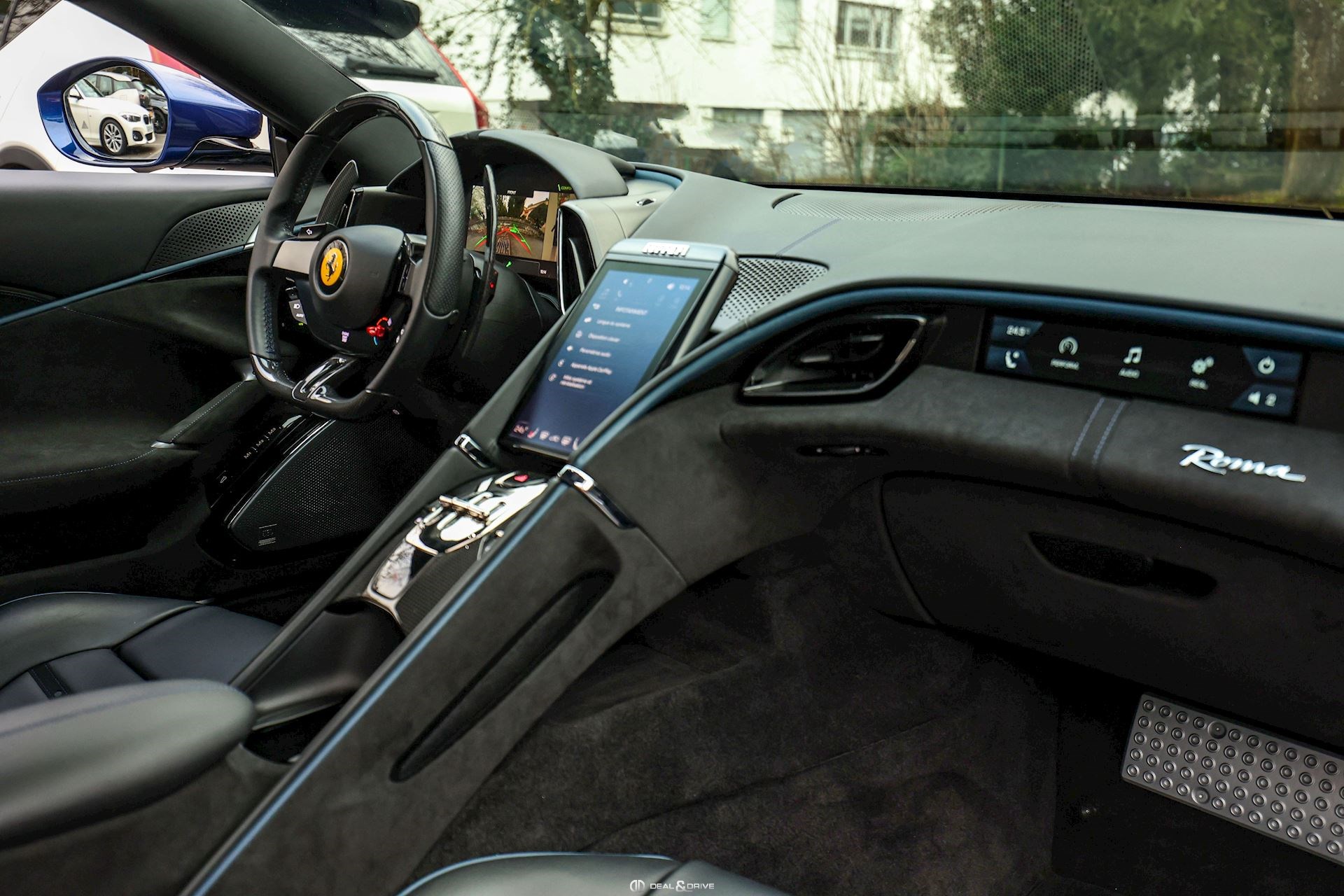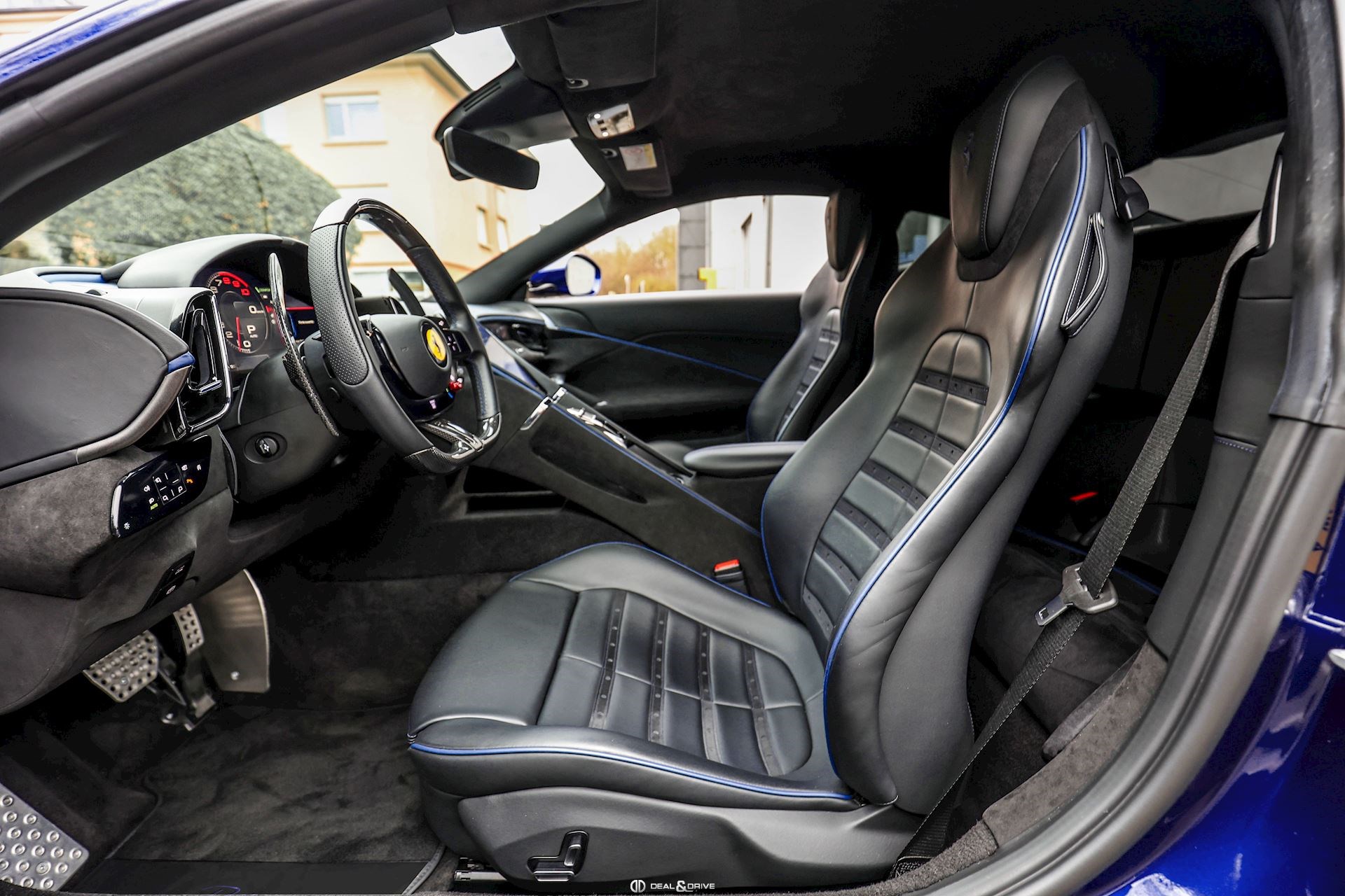 INTÉRIEUR DAYT Sièges Daytona RSFE Sièges entièrement électriques EMPH Cavallino brodé sur les appuie-têtes en Blu Medio 0827 CLDT Détails intérieurs colorés en Blu Medio 112807 PIP1 Passepoil en Blu Medio 112807, couleur sur demande STC2 Surpiqûres spéciales colorées O.R. en Blu Medio 0827 LEDS Volant en Carbone + LEDS SKPA Dossier des sièges arrière rabattables FLMA Tapis de sol avec désignation du modèle colorée ALIH Plafonnier en Alcantara Nero 9440 STP2 Inserts perforés en Alcantara Nero 9440 CITZ Partie supérieure de la console centrale en Carbone PLAL Repose-pieds conducteur et passager en Aluminium