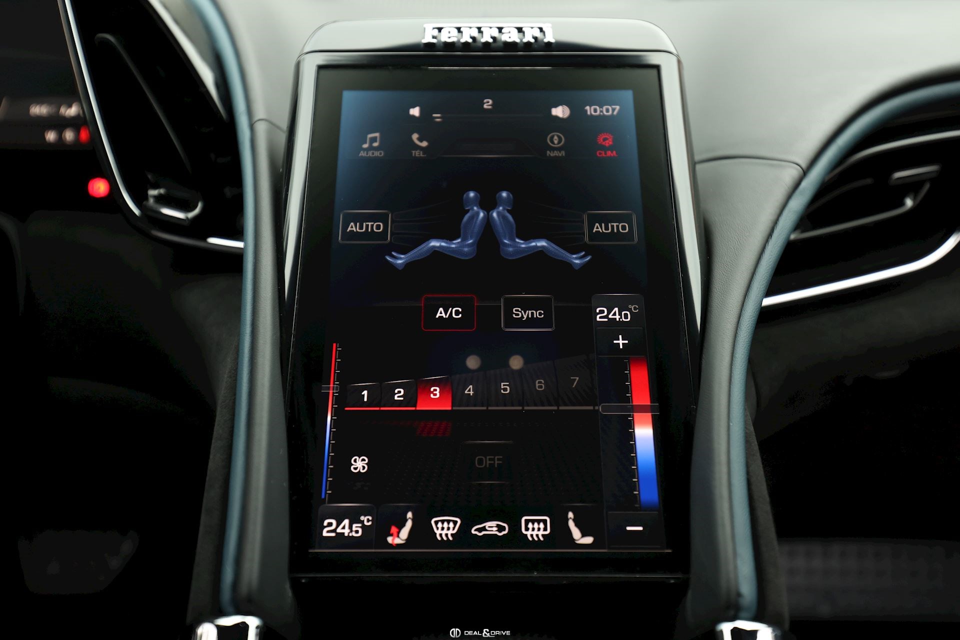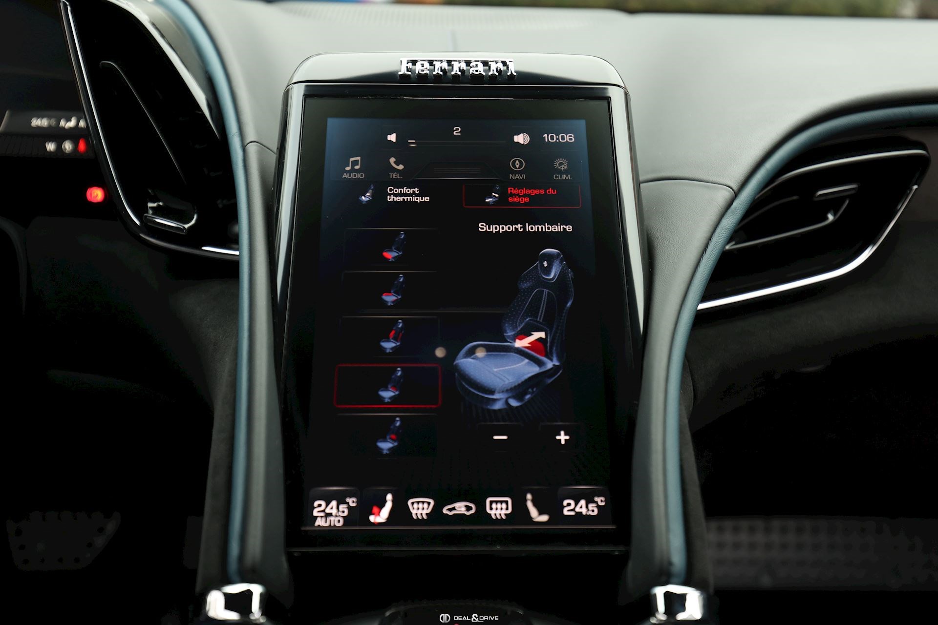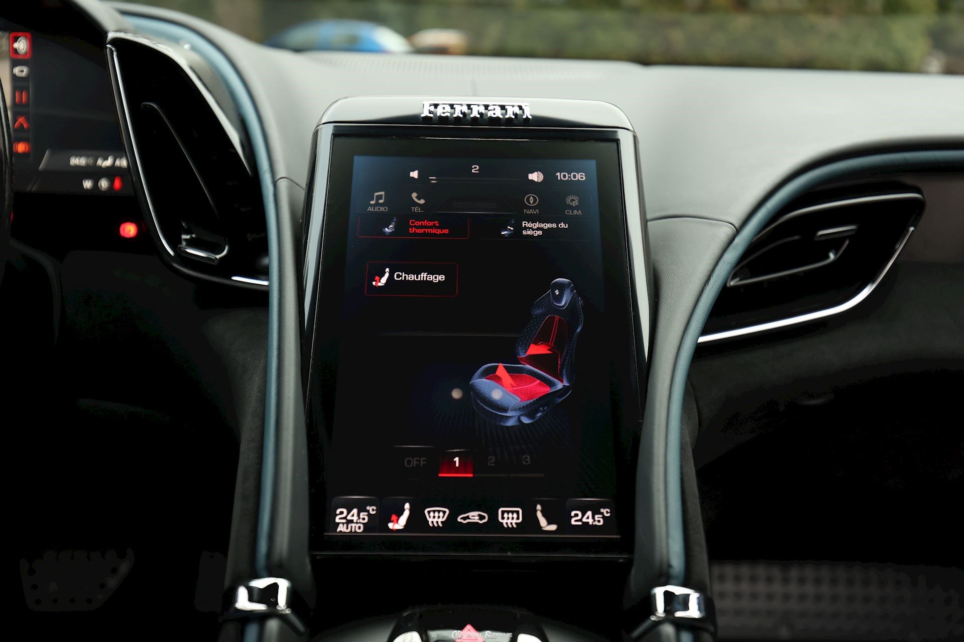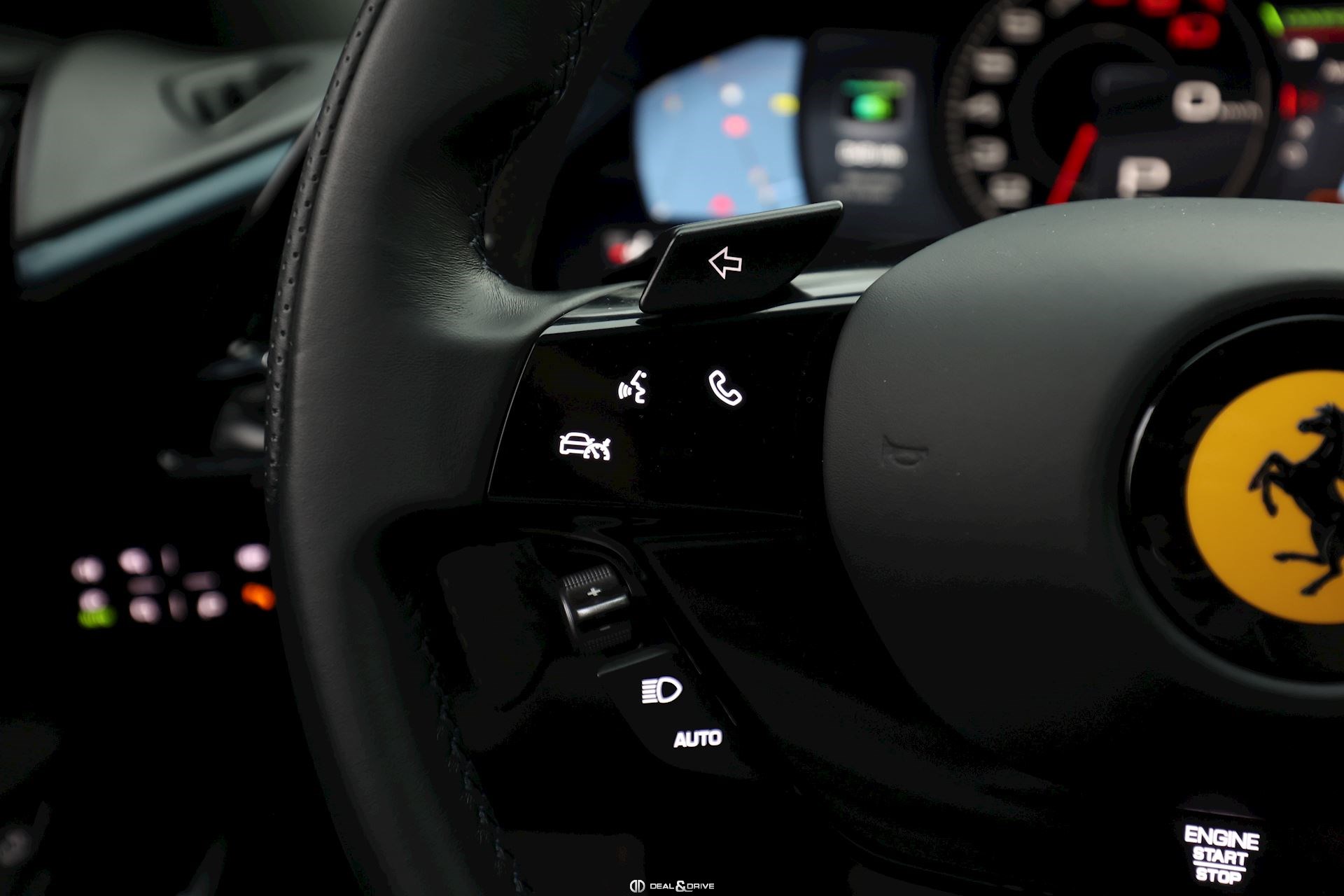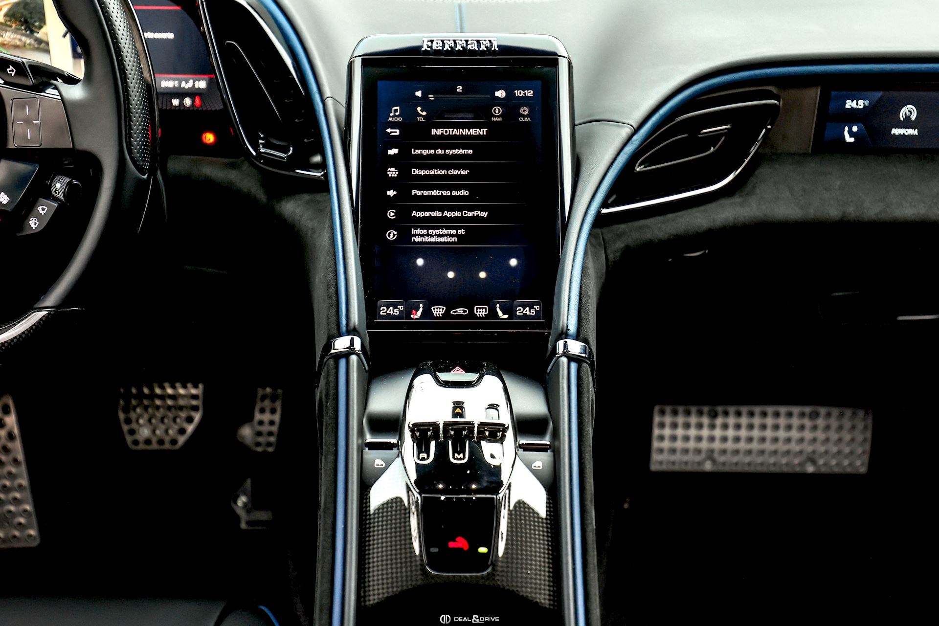 INTÉRIEUR DAYT Sièges Daytona RSFE Sièges entièrement électriques EMPH Cavallino brodé sur les appuie-têtes en Blu Medio 0827 CLDT Détails intérieurs colorés en Blu Medio 112807 PIP1 Passepoil en Blu Medio 112807, couleur sur demande STC2 Surpiqûres spéciales colorées O.R. en Blu Medio 0827 LEDS Volant en Carbone + LEDS SKPA Dossier des sièges arrière rabattables FLMA Tapis de sol avec désignation du modèle colorée ALIH Plafonnier en Alcantara Nero 9440 STP2 Inserts perforés en Alcantara Nero 9440 CITZ Partie supérieure de la console centrale en Carbone PLAL Repose-pieds conducteur et passager en Aluminium
