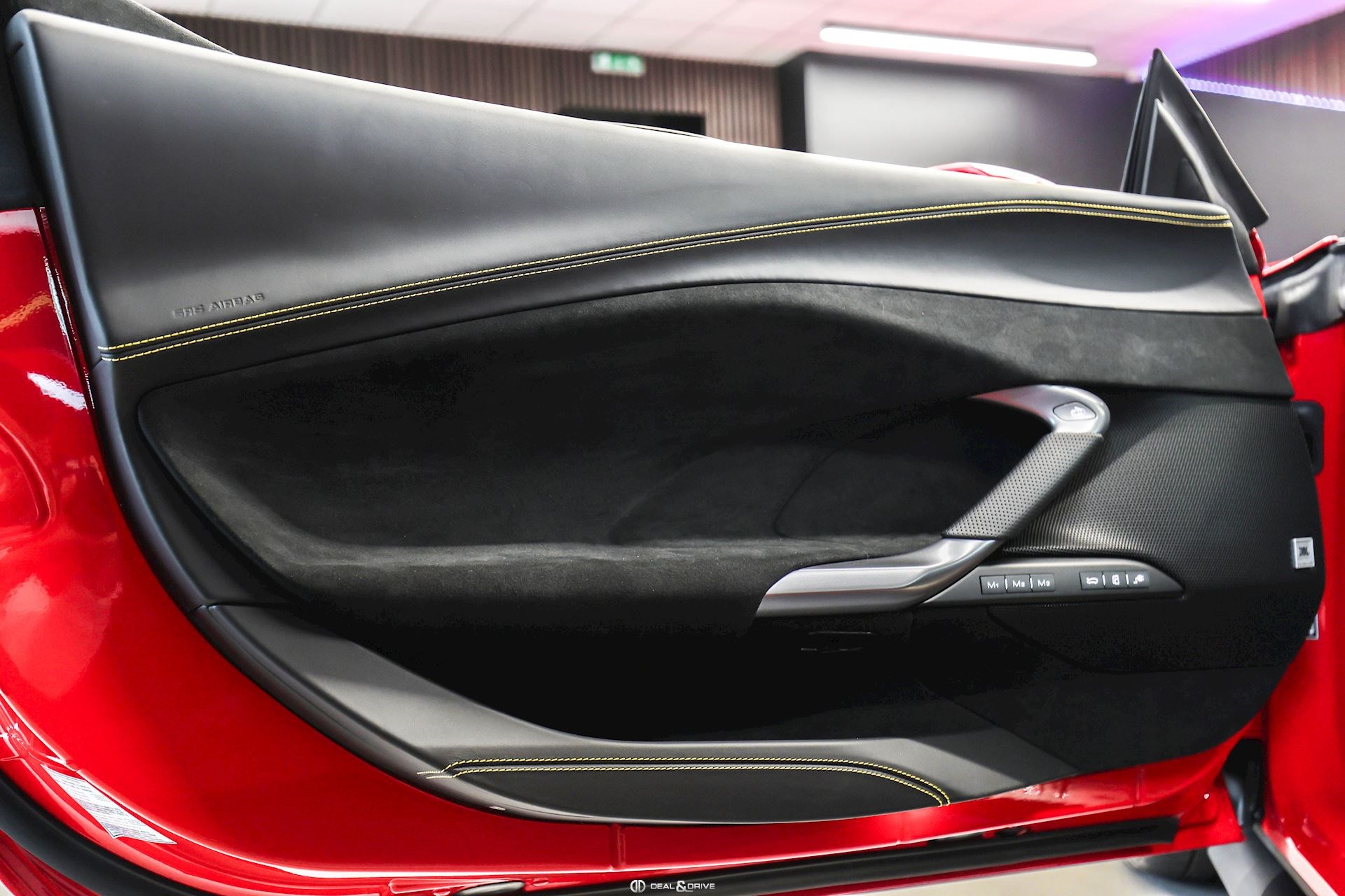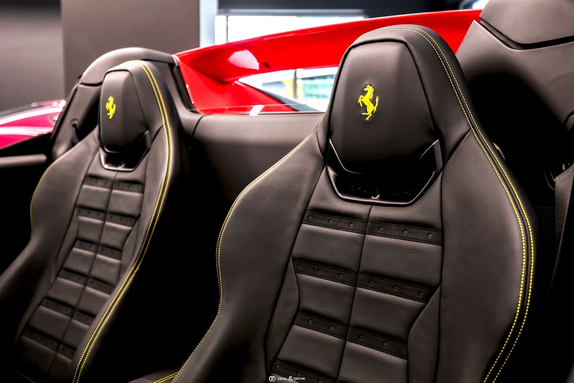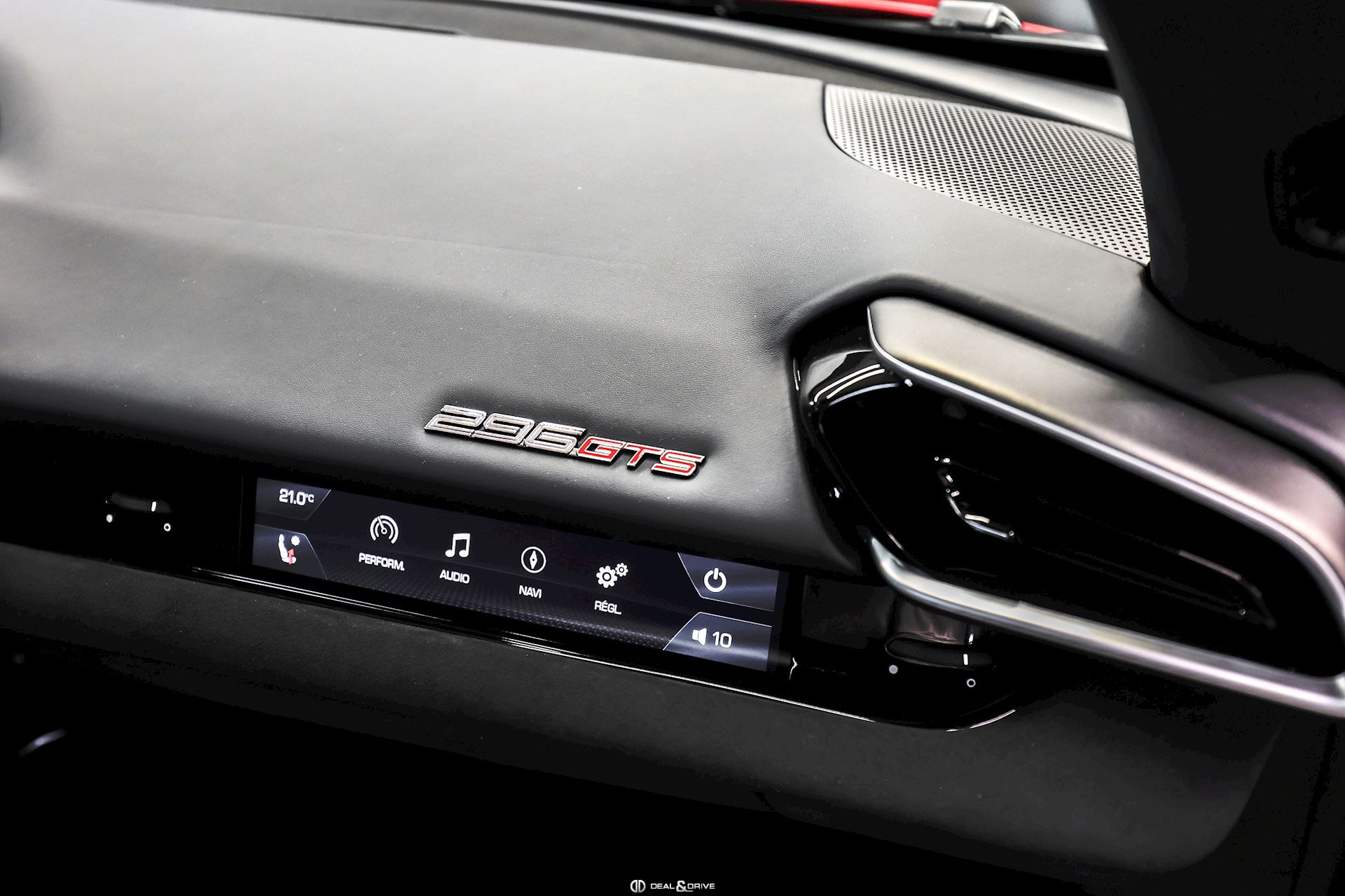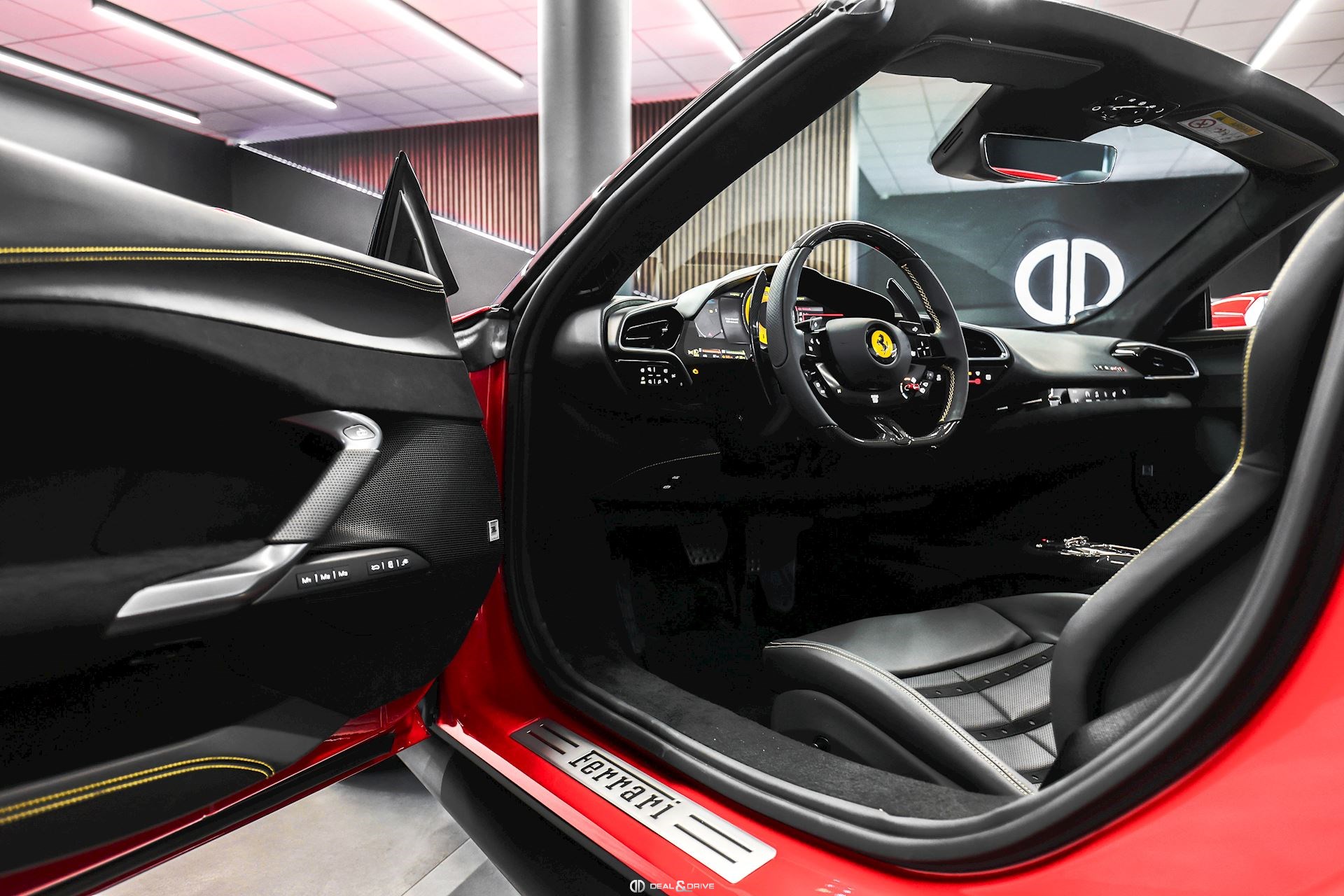INTÉRIEUR MATS Nero 152 EMPH Cavallino brodé sur les appuie-têtes en couleur Giallo 0113 RSFV Sièges électriques et ventilés STC2 Surpiqûres spéciales en couleur Giallo 0113 CITZ Partie supérieure de la console centrale en Carbone DAYT Sièges style Daytona STP2 Inserts perforés en Alcantara Nero 9440 LEDS Volant en Carbone, multifonctions + LED
