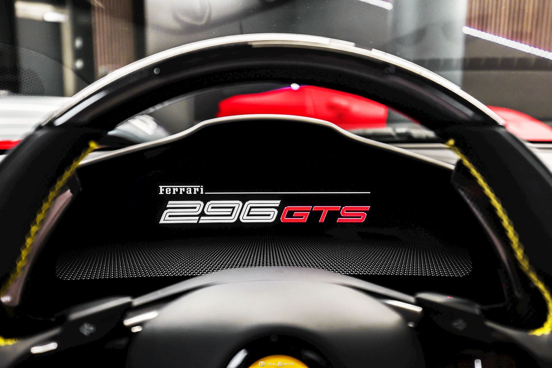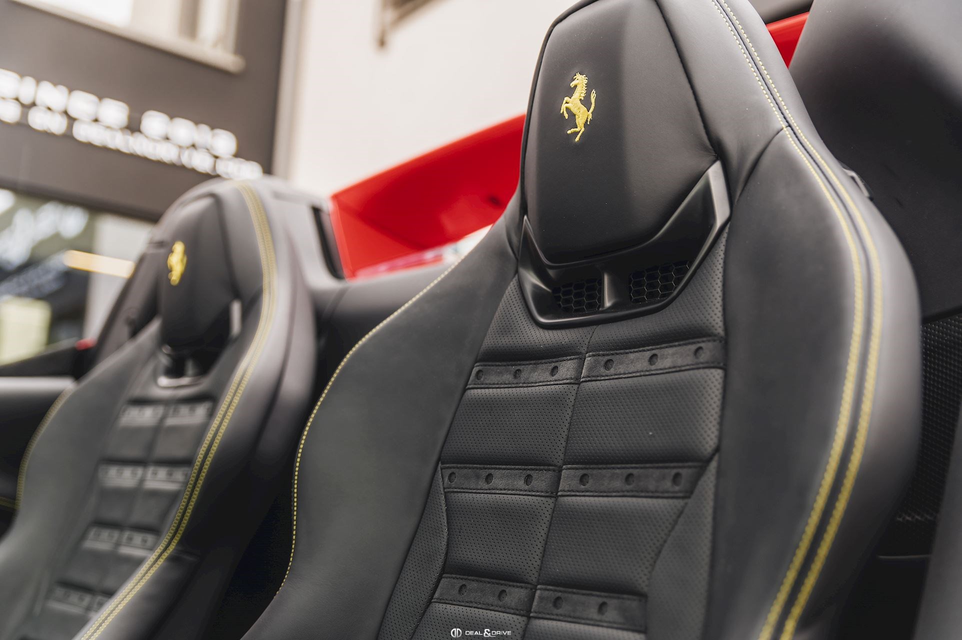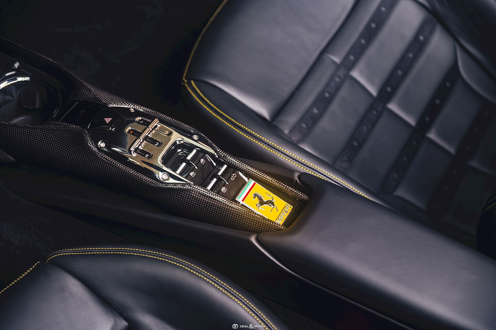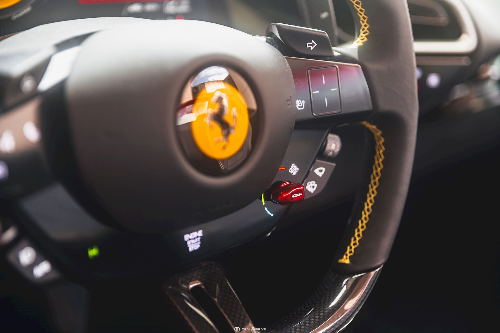 INTÉRIEUR MATS Nero 152 EMPH Cavallino brodé sur les appuie-têtes en couleur Giallo 0113 RSFV Sièges électriques et ventilés STC2 Surpiqûres spéciales en couleur Giallo 0113 CITZ Partie supérieure de la console centrale en Carbone DAYT Sièges style Daytona STP2 Inserts perforés en Alcantara Nero 9440 LEDS Volant en Carbone, multifonctions + LED
