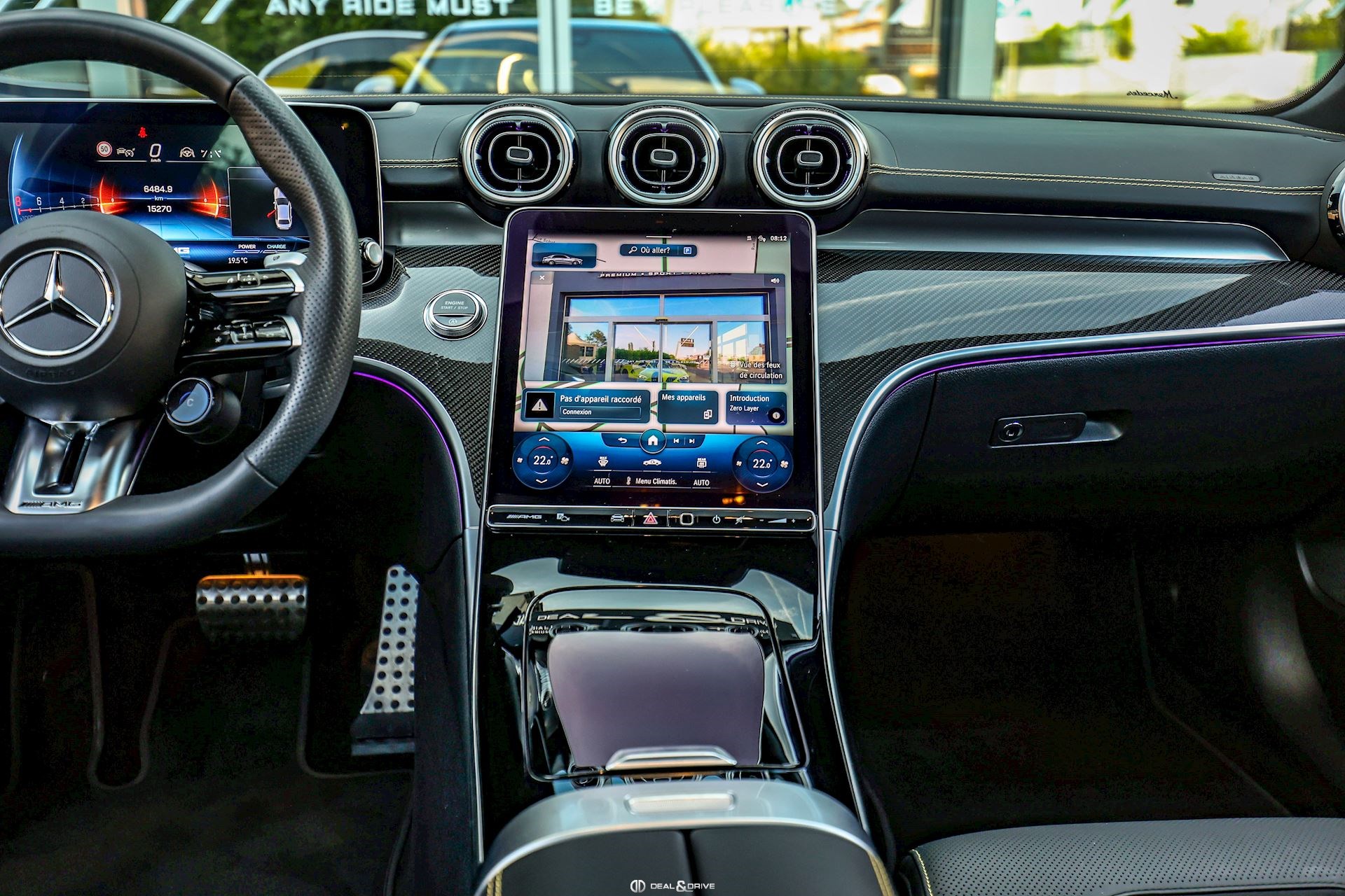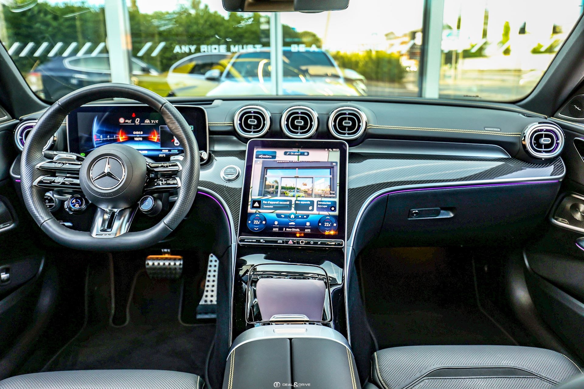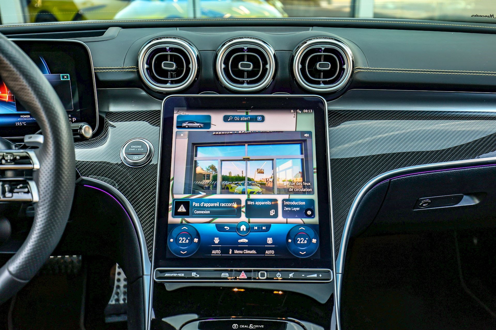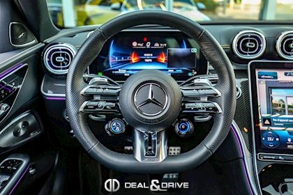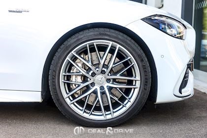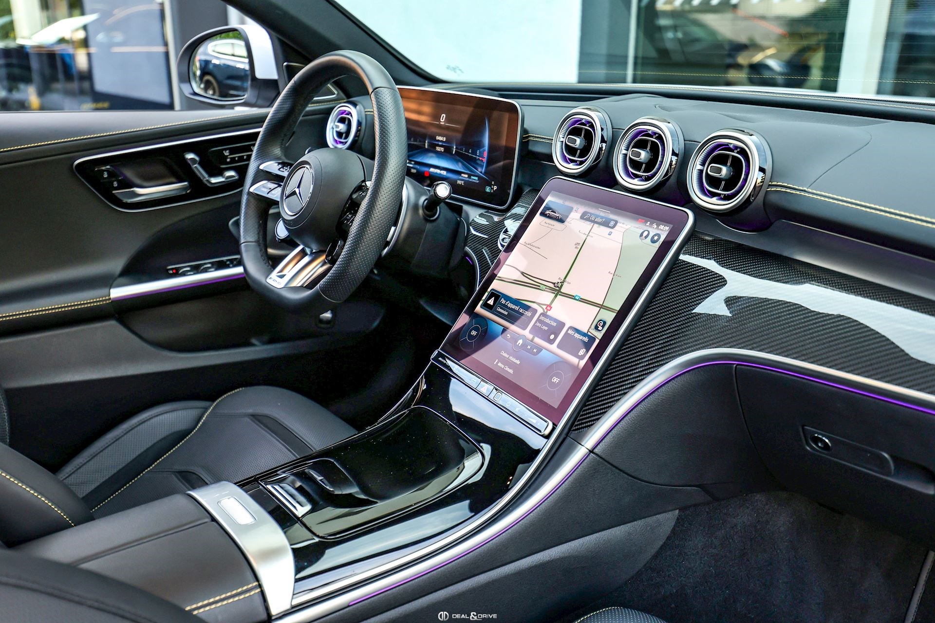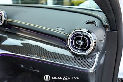 INTÉRIEUR Inserts en Carbone AMG Sellerie en cuir Nappa Noir Surpiqûres jaunes Sièges avant Sport Sièges avant électriques Sièges avant avec fonction mémoire Sièges avant chauffants Sièges avant ventilés Appuie-lombaires électriques Plafonnier Noir Planche de bord au simili-cuir Artico Seuils de porte en Aluminium, éclairés Tapis de sol AMG Pédalier en Acier inox Design Sport Volant AMG Performance en cuir, Nappa, multifonctions Volant réglable électriquement Climatisation automatique 4 zones
