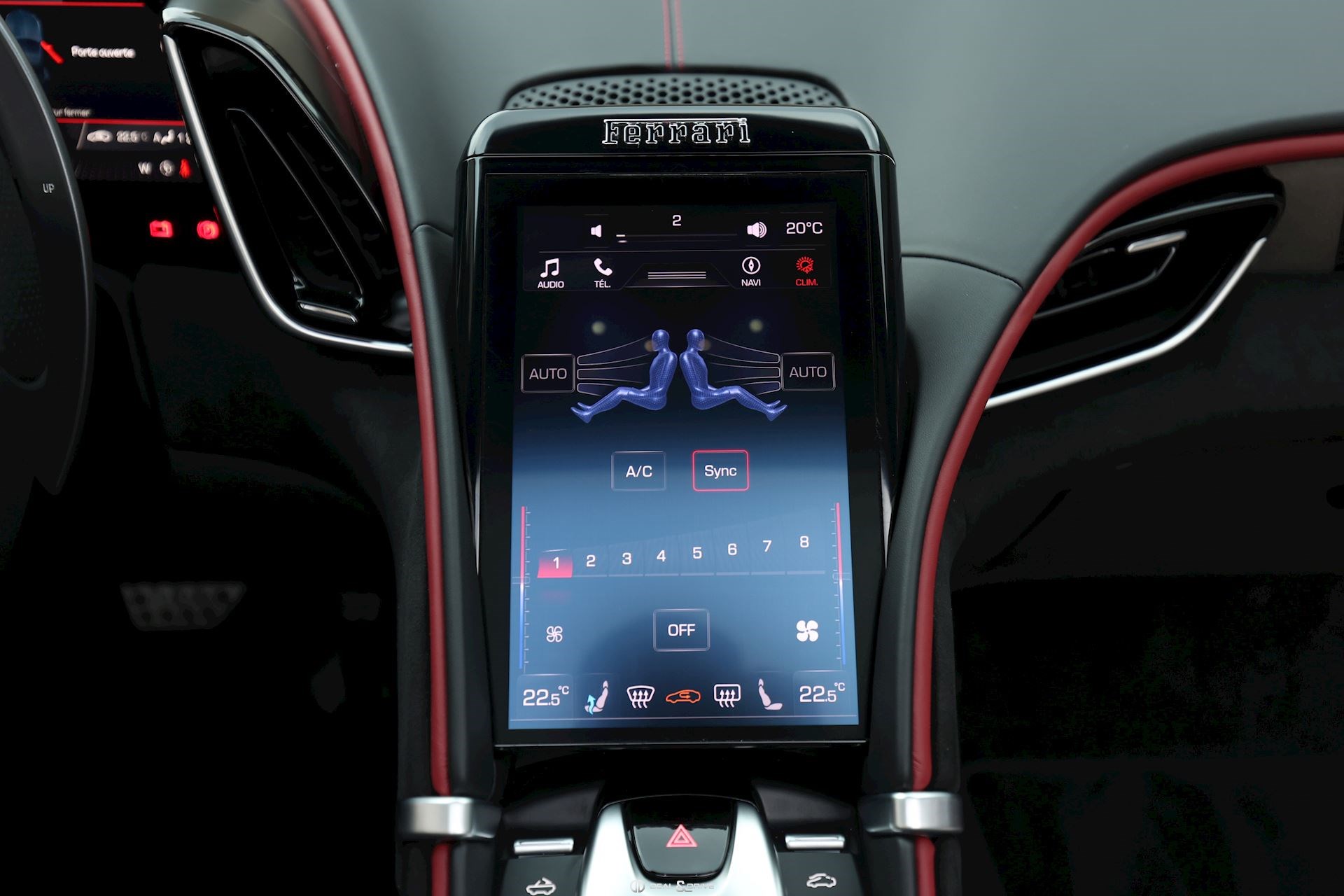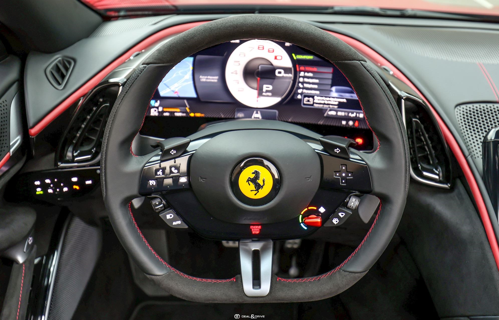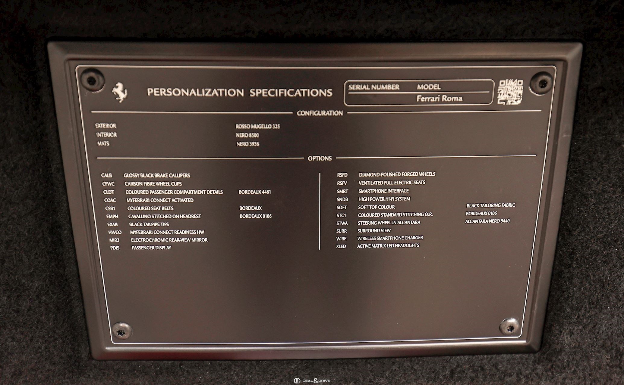 INTÉRIEUR CLDT Détails à l'intérieur colorés en couleur BORDEAUX 4481 RSFV Sièges électriques et ventilésCLDT Détails intérieurs en BORDEAUX 4481 CSB1 Ceintures de sécurité en BORDEAUX EMPH Cavallino brodé sur les appuie-têtes en BORDEAUX 0106 STC1 Surpiqûres standard en BORDEAUX 0106 STWA Volant en cuir et Alcantara Nero 9440 MATS Tapis de sol Nero 3936