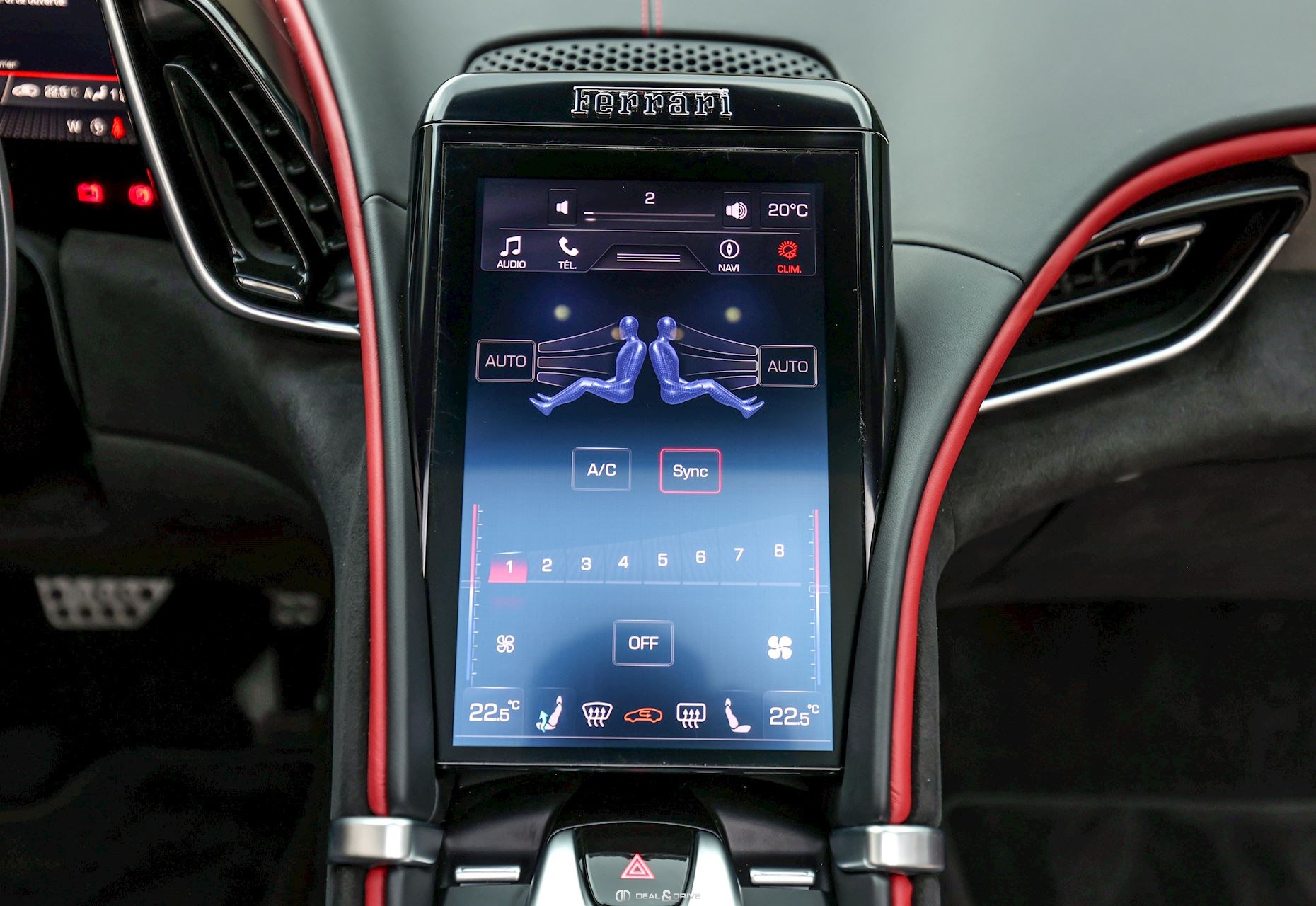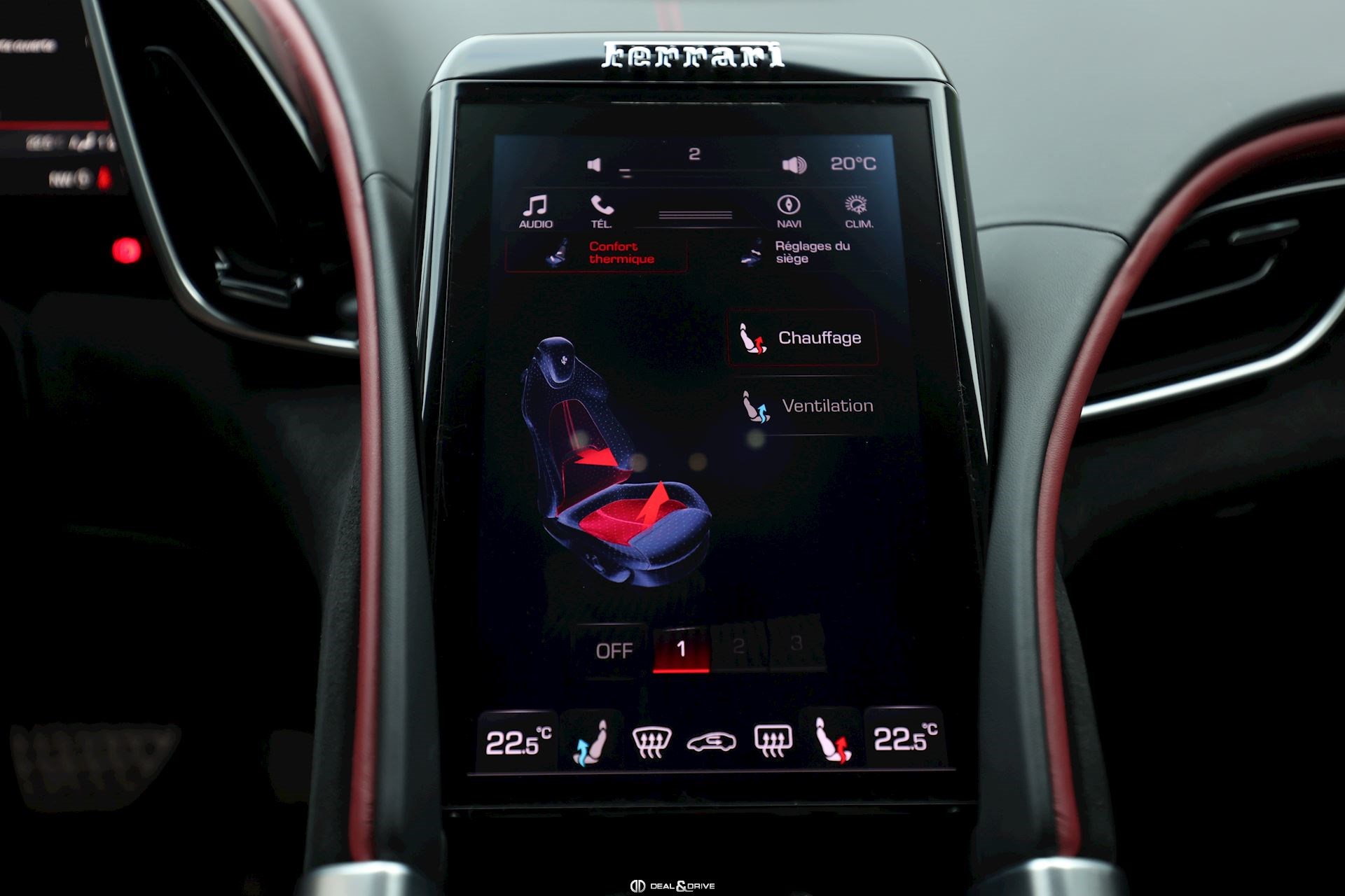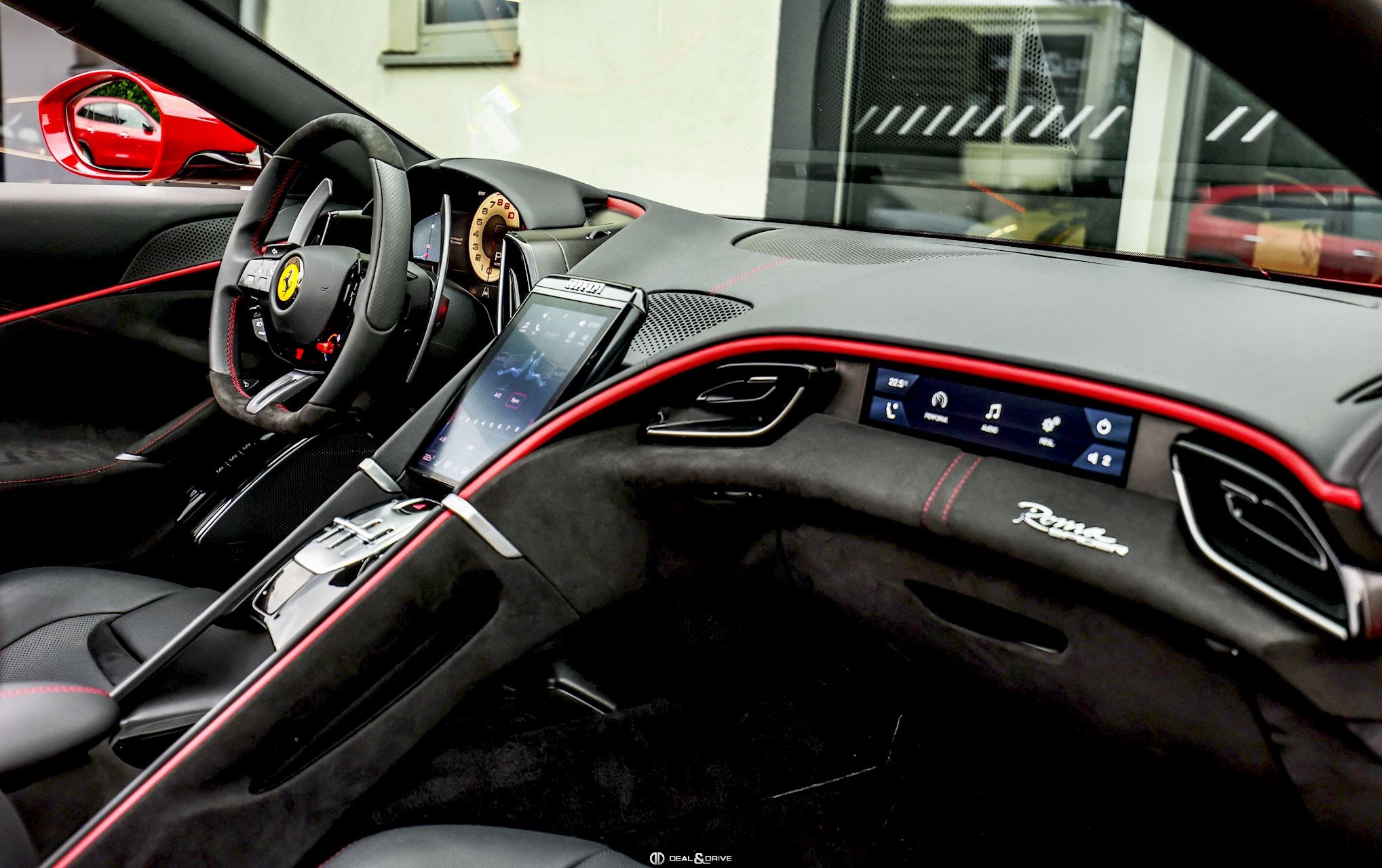 INTÉRIEUR CLDT Détails à l'intérieur colorés en couleur BORDEAUX 4481 RSFV Sièges électriques et ventilésCLDT Détails intérieurs en BORDEAUX 4481 CSB1 Ceintures de sécurité en BORDEAUX EMPH Cavallino brodé sur les appuie-têtes en BORDEAUX 0106 STC1 Surpiqûres standard en BORDEAUX 0106 STWA Volant en cuir et Alcantara Nero 9440 MATS Tapis de sol Nero 3936