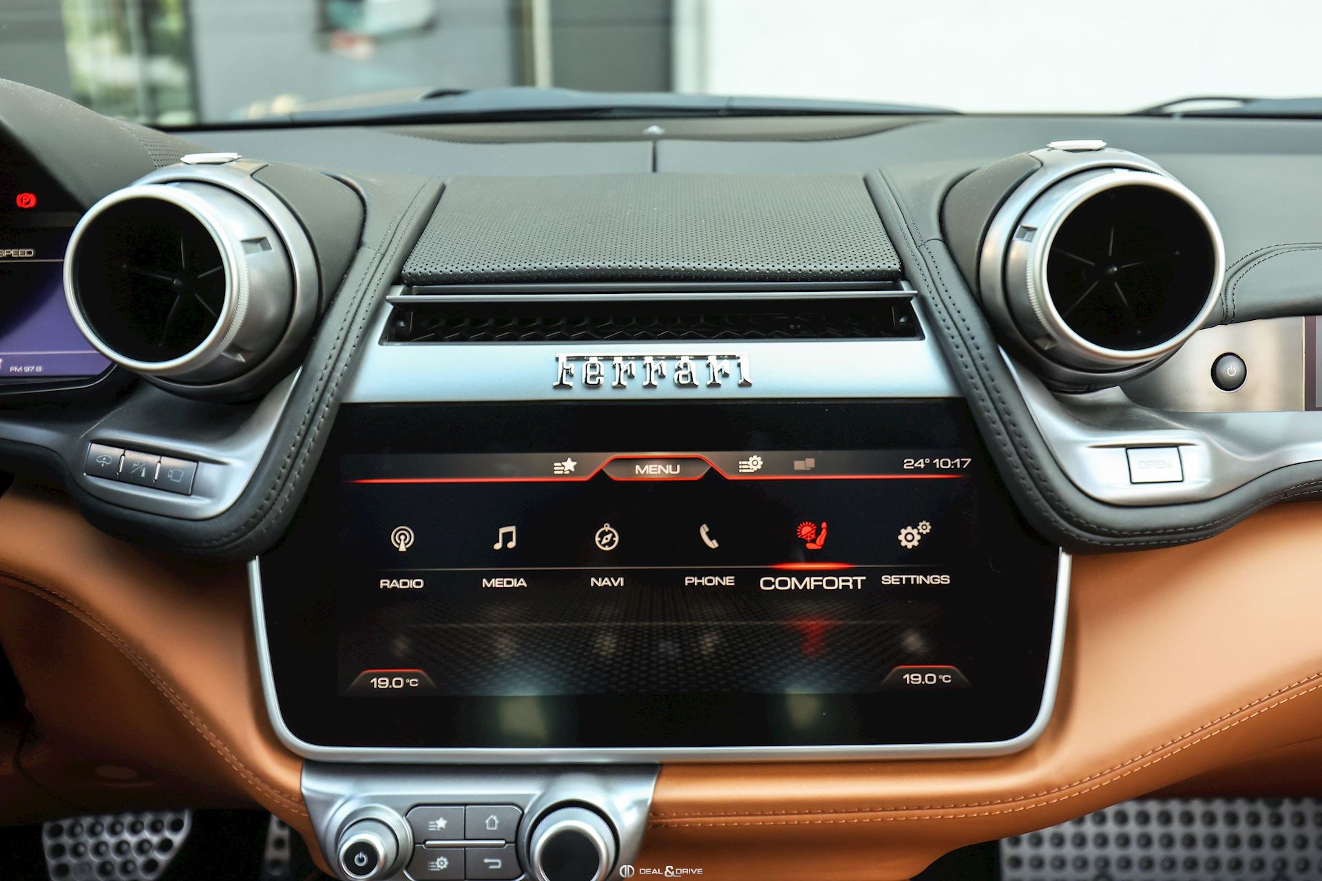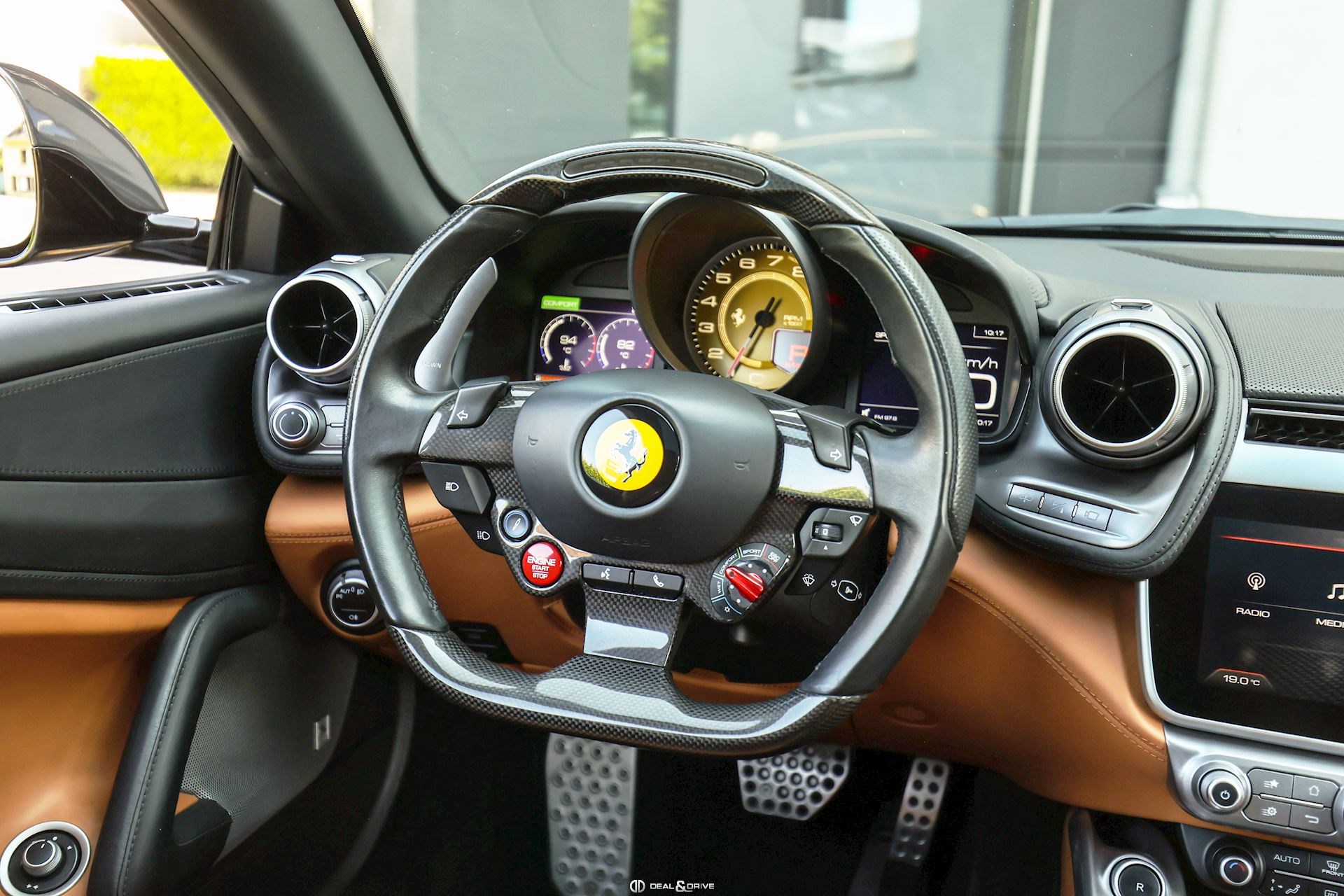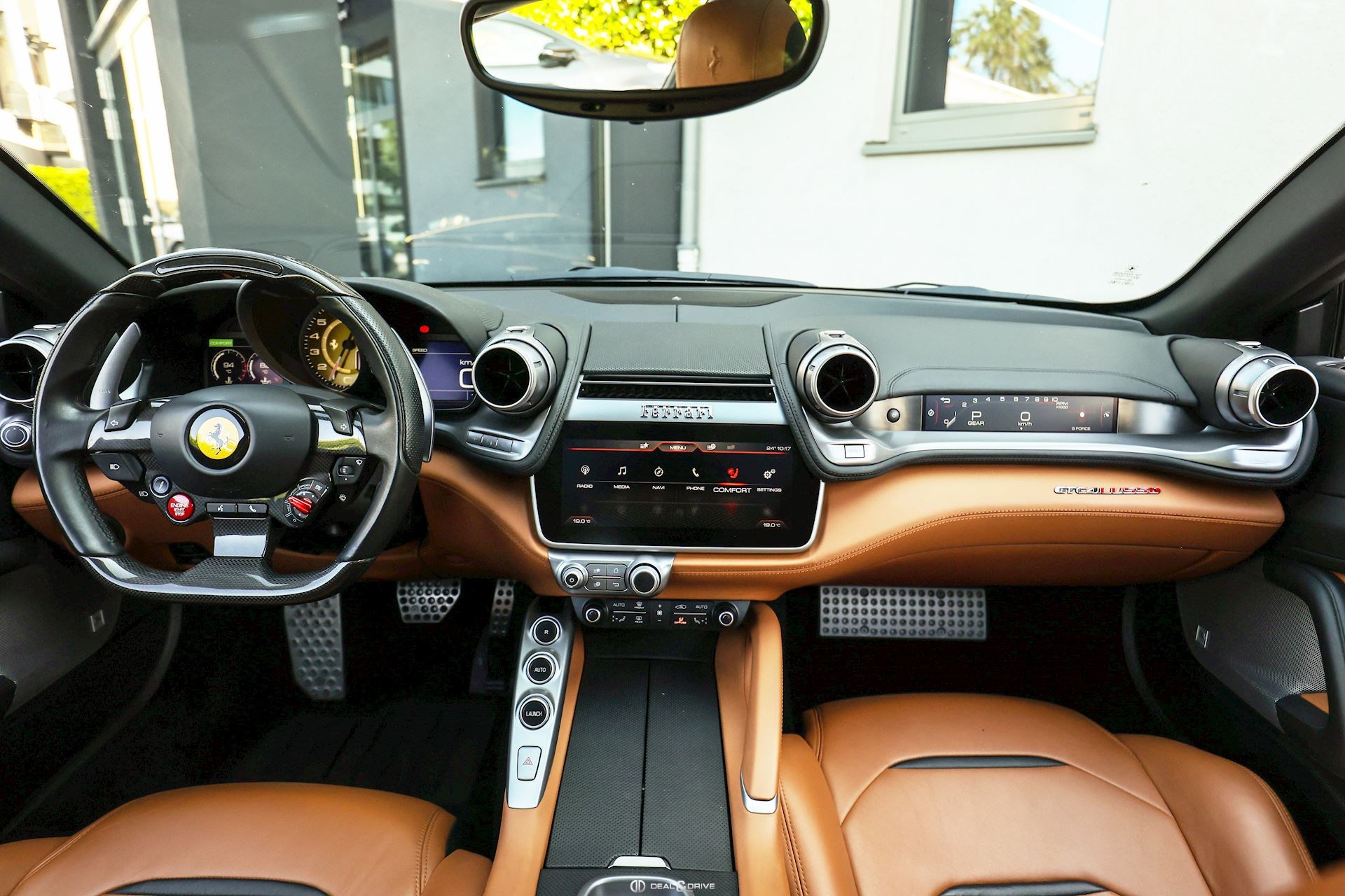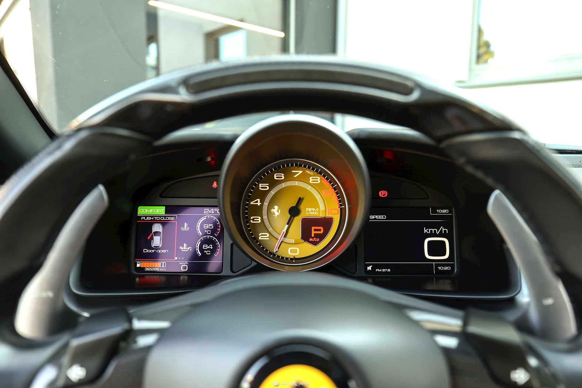 EXTÉRIEUR CALY Étriers de frein en Jaune CFG1 Grille frontale avec bords chromés CHIP Film de protection sur pare-chocs avant ECRF Toit panoramique LOGO Emblèmes « SCUDERIA FERRARI » sur les ailes avant RMSV Jantes forgées 20’’ peintes RSPA Spoiler du toit panoramique en Nero DS