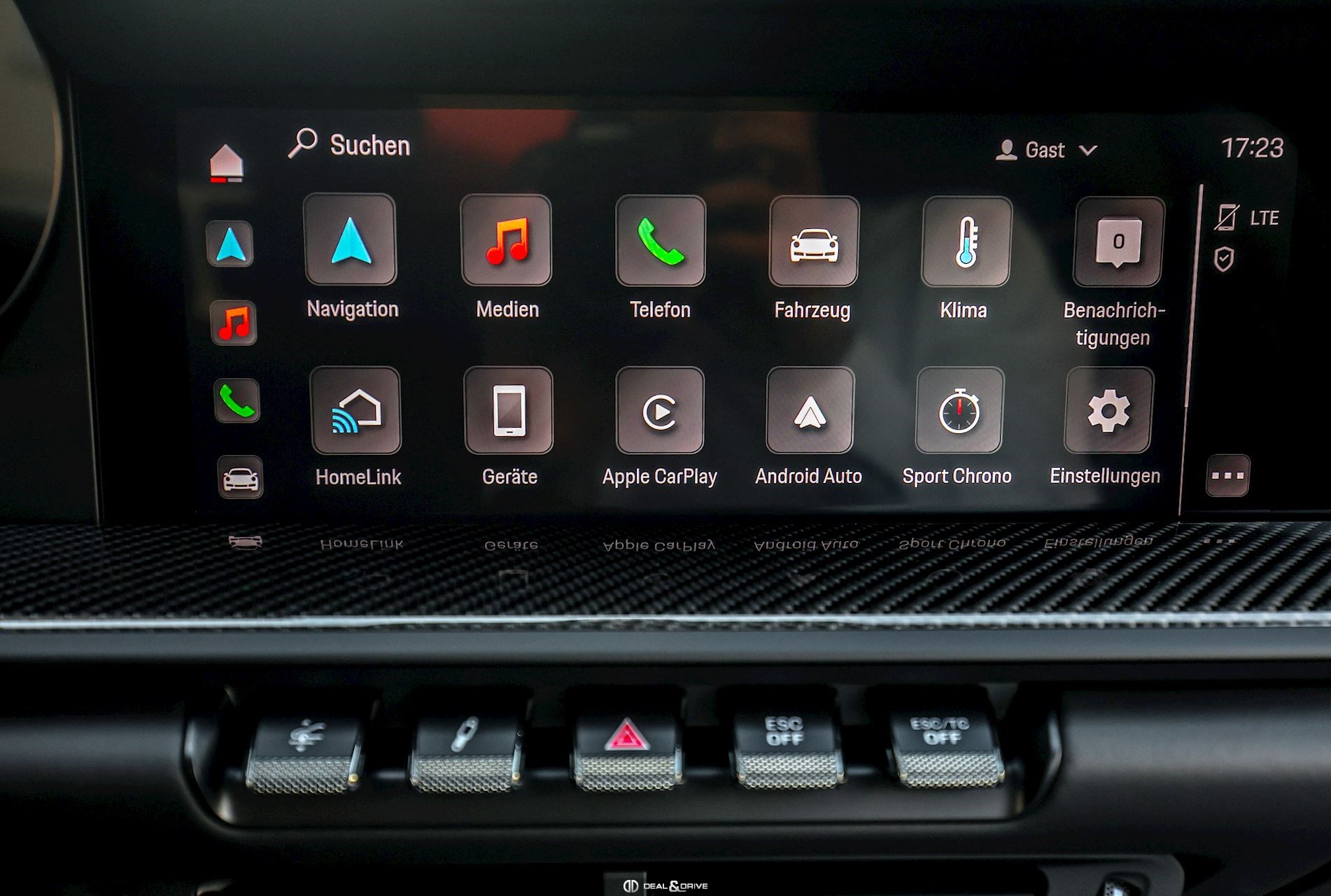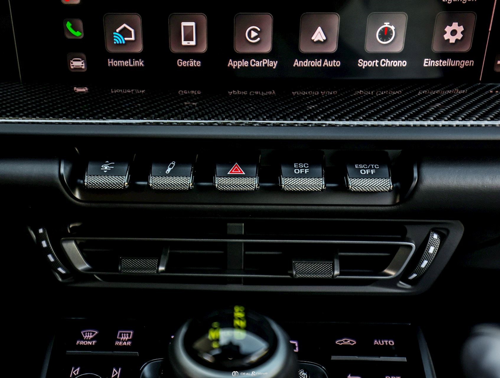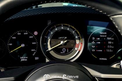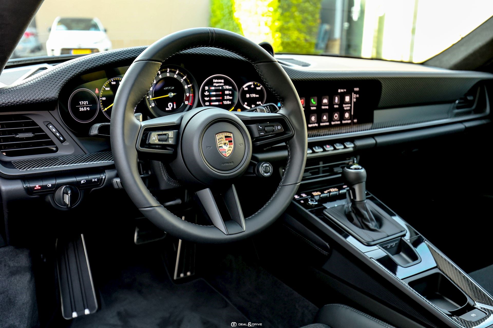 INTÉRIEUR Sièges baquets intégraux en Carbone Accoudoir central en cuir avec inscription « GT3 TOURING » Volant GT Sport en cuir, multifonctions Habillage de colonne de direction en cuir Plafonnier en Race-Tex Emblème Porsche sur les appuie-têtes Climatisation automatique 2 zones Seuils de porte en Carbone avec inscription GT3