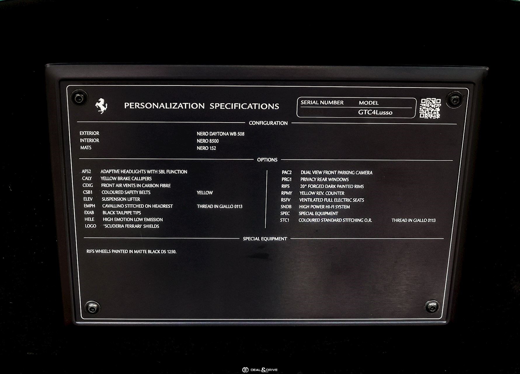 AFS2 Feux avant adaptatifs avec fonction SBL CALY Étriers de frein en Jaune CEXG Sorties d’air latérales en Carbone CSB1 Ceintures de sécurité en couleur Jaune ELEV Système de levage de l’essieu avant Lift System EMPH CAVALLINO brodé sur les appuie-têtes en couleur GIALLO 0113 EXAB Sorties d’échappement en Noir HELE High Emotion Low Emission LOGO Écussons ‘SCUDERIA FERRARI’ sur les ailes avant PAC2 Caméra de stationnement avant double PRG1 Vitrage arrière surteinté RIFS Jantes 20'' forgées RPMY REV compteur en Jaune RSFV Sièges électriques et ventilés SNDB Système audio High Power Hi-Fi JBL SPEC Special Equipment – Jantes peintes en Noir Mat DS1250 STC1 Surpiqûres Standard O.R. en GIALLO 0113