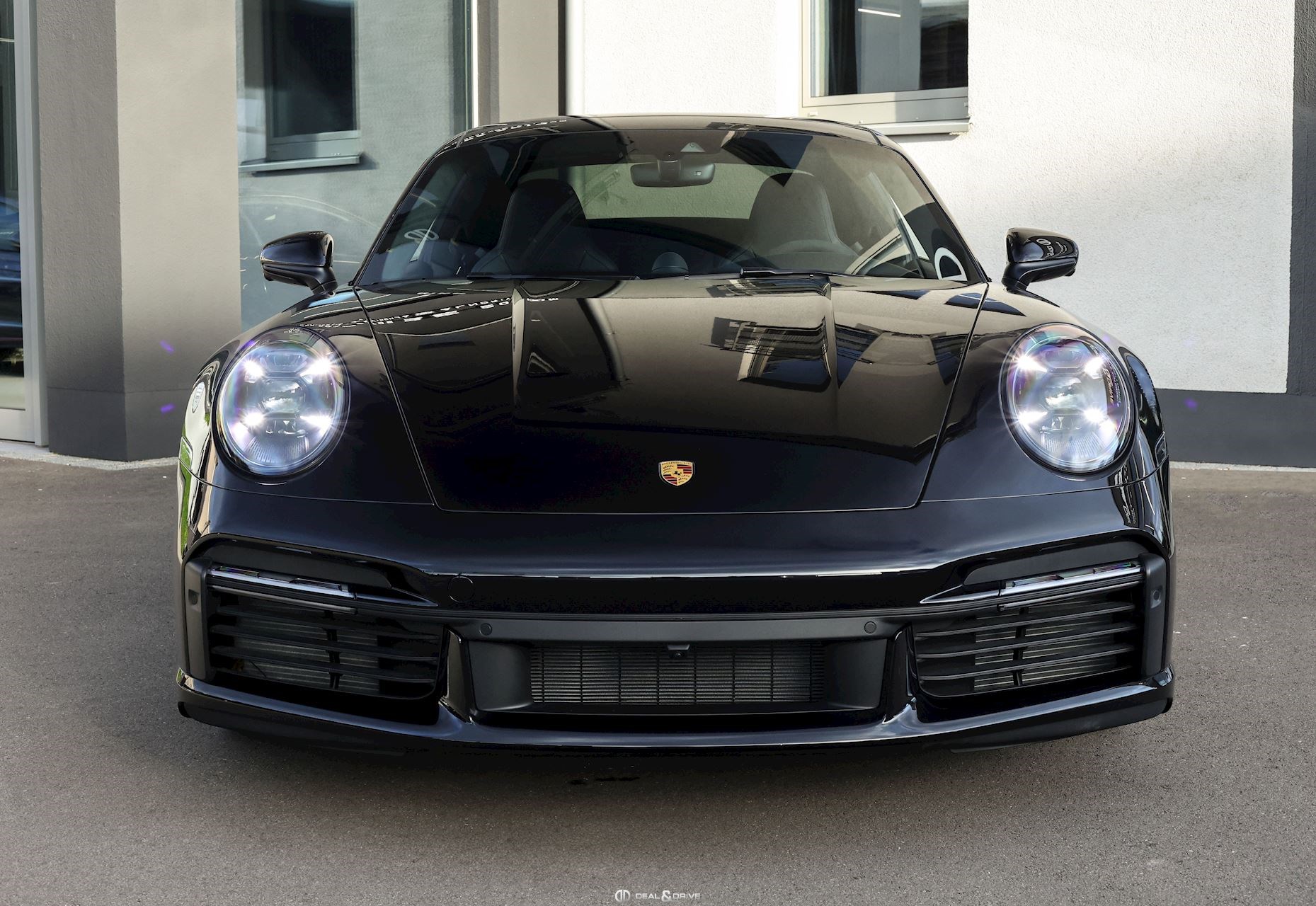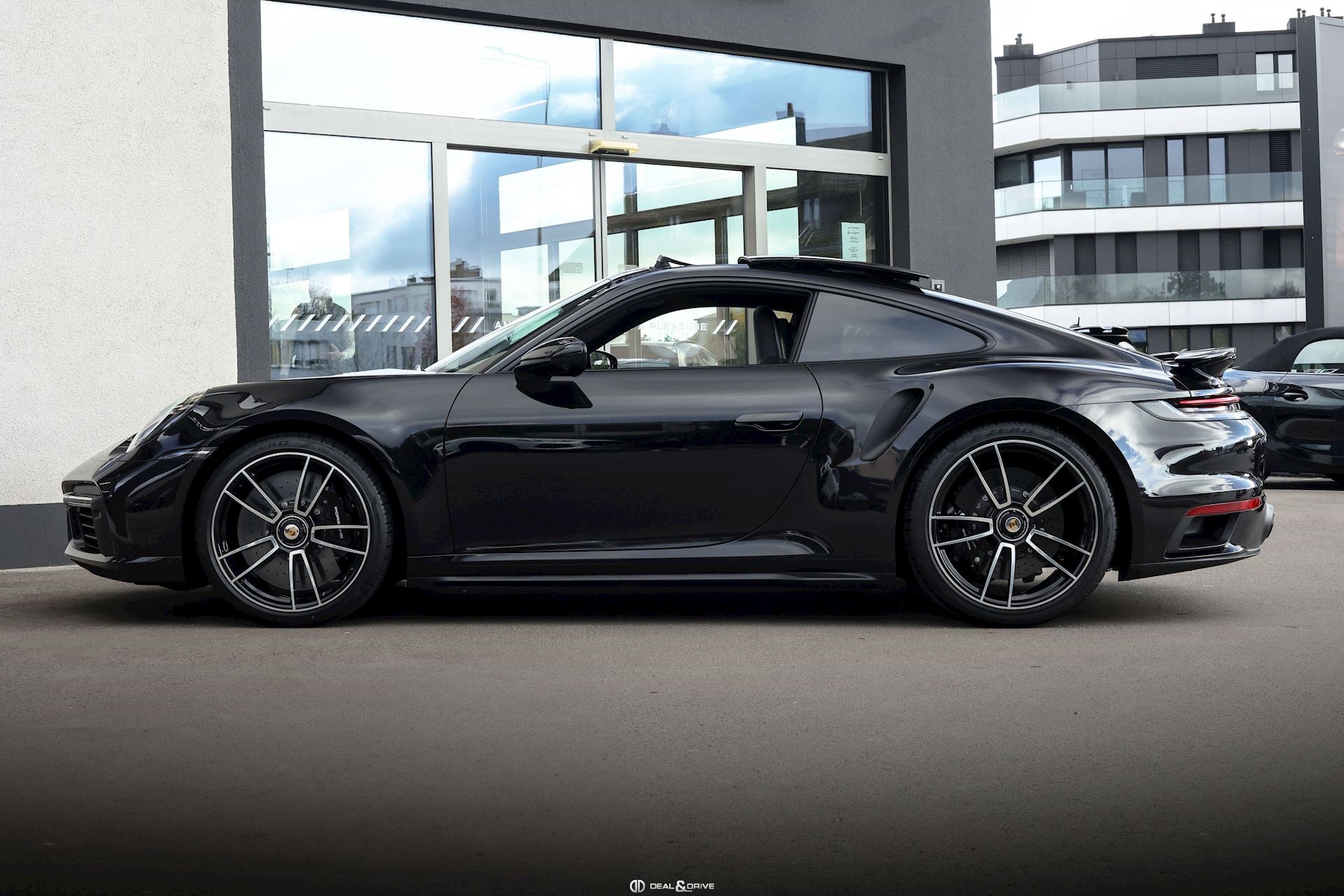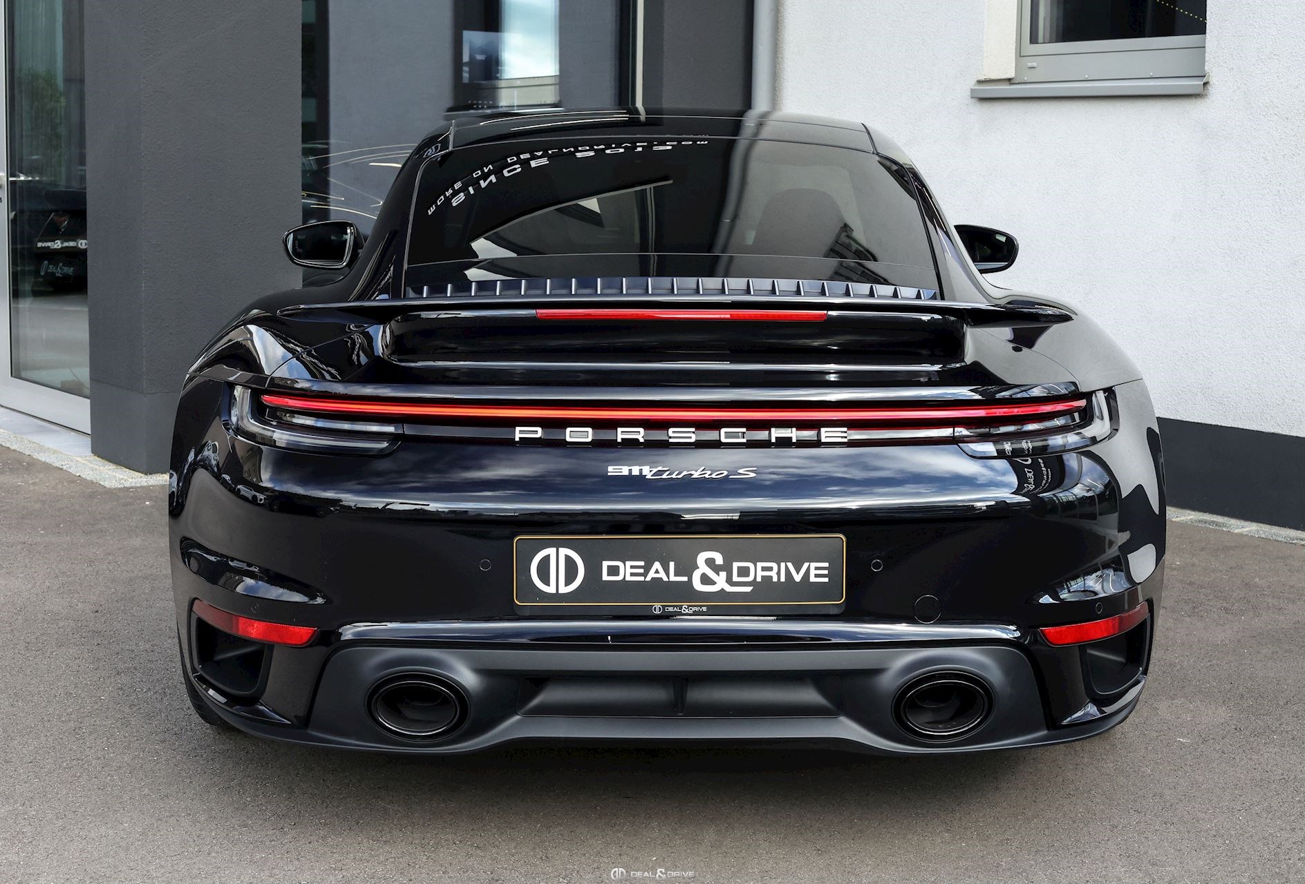 Caches moyeux Porsche en couleur Contour des vitres latérales en Noir Désignation du modèle en argent sur le pare-chocs arrière Pare-brise avec bandeau supérieur teinté dégradé