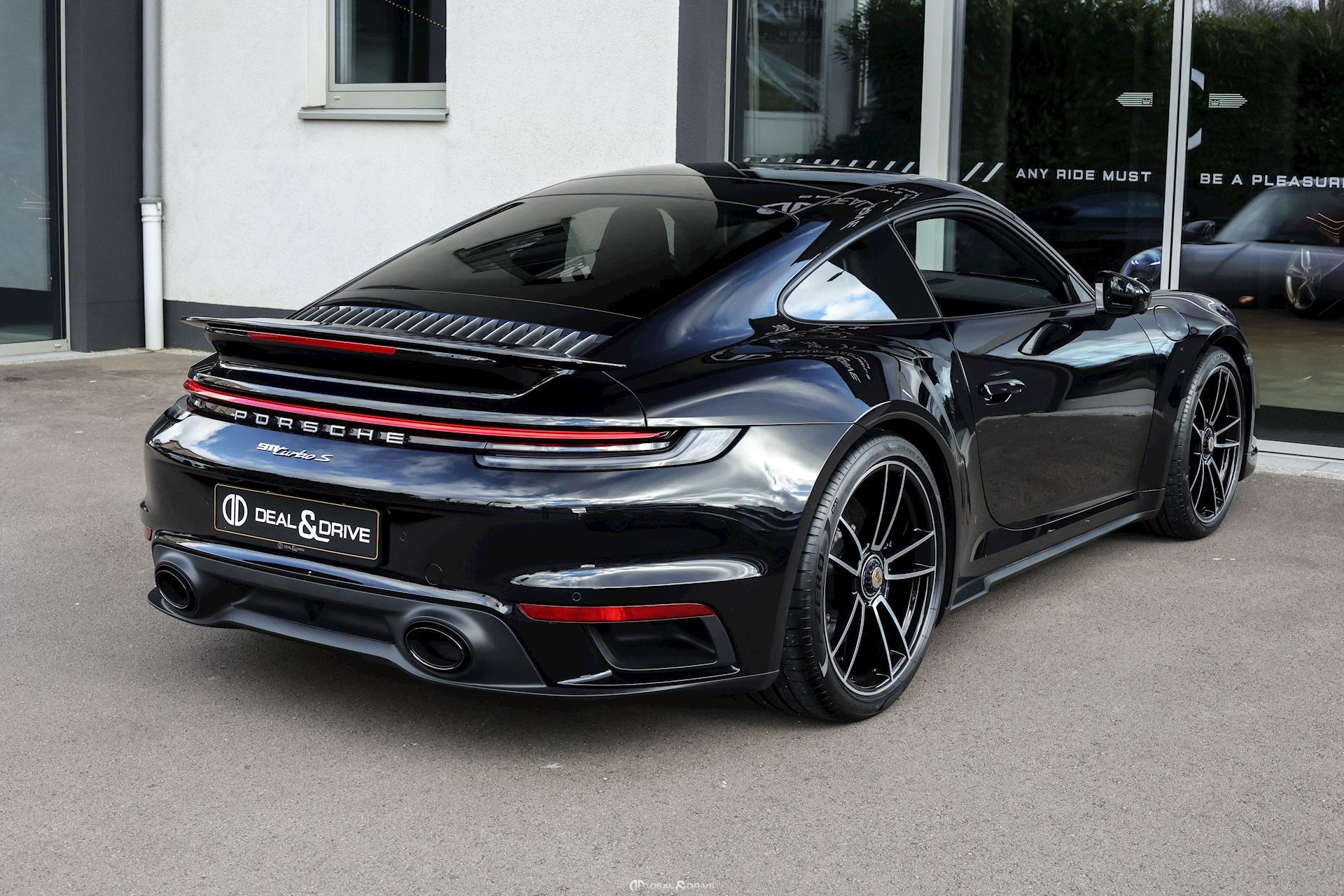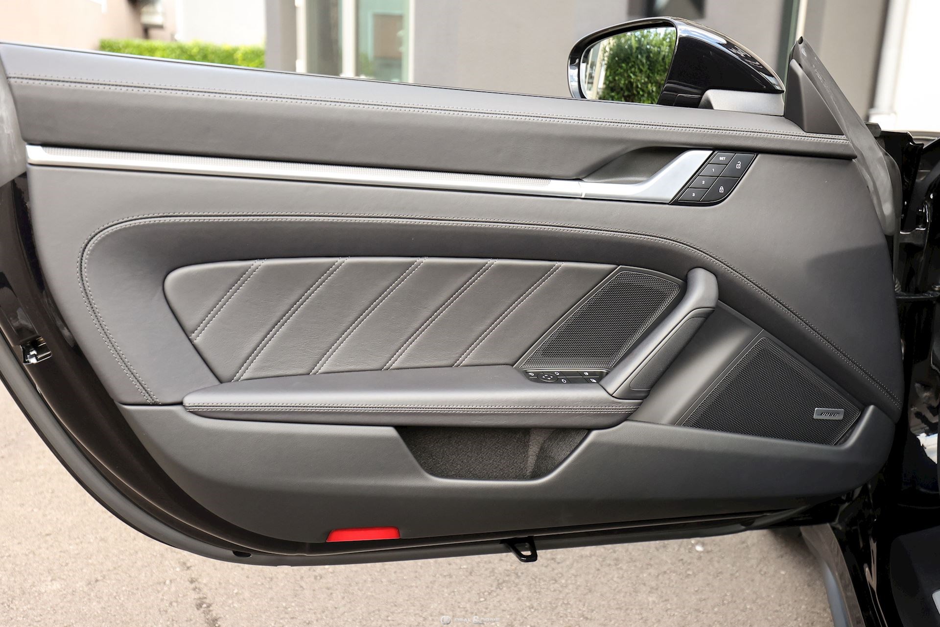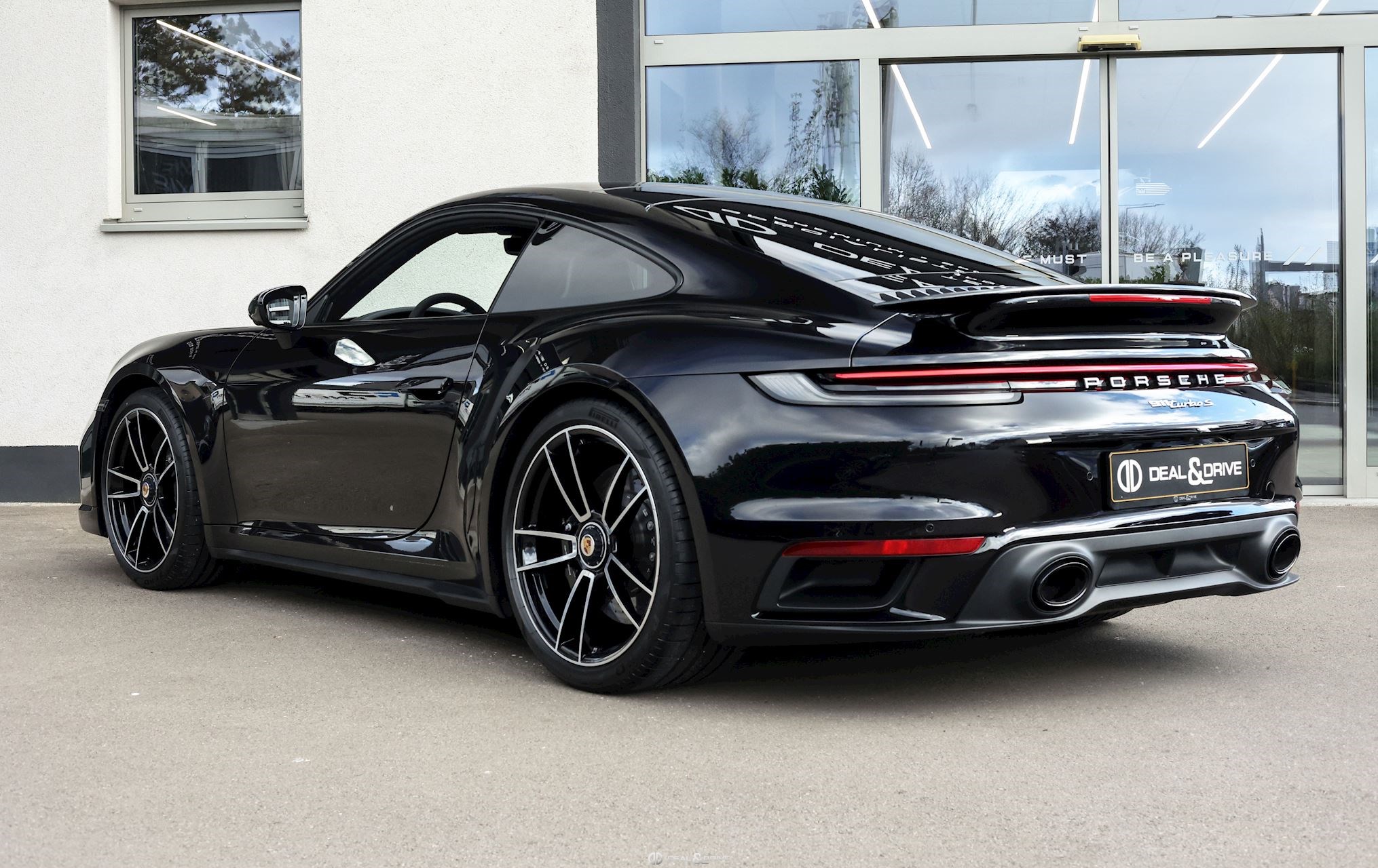 Caches moyeux Porsche en couleur Contour des vitres latérales en Noir Désignation du modèle en argent sur le pare-chocs arrière Pare-brise avec bandeau supérieur teinté dégradé