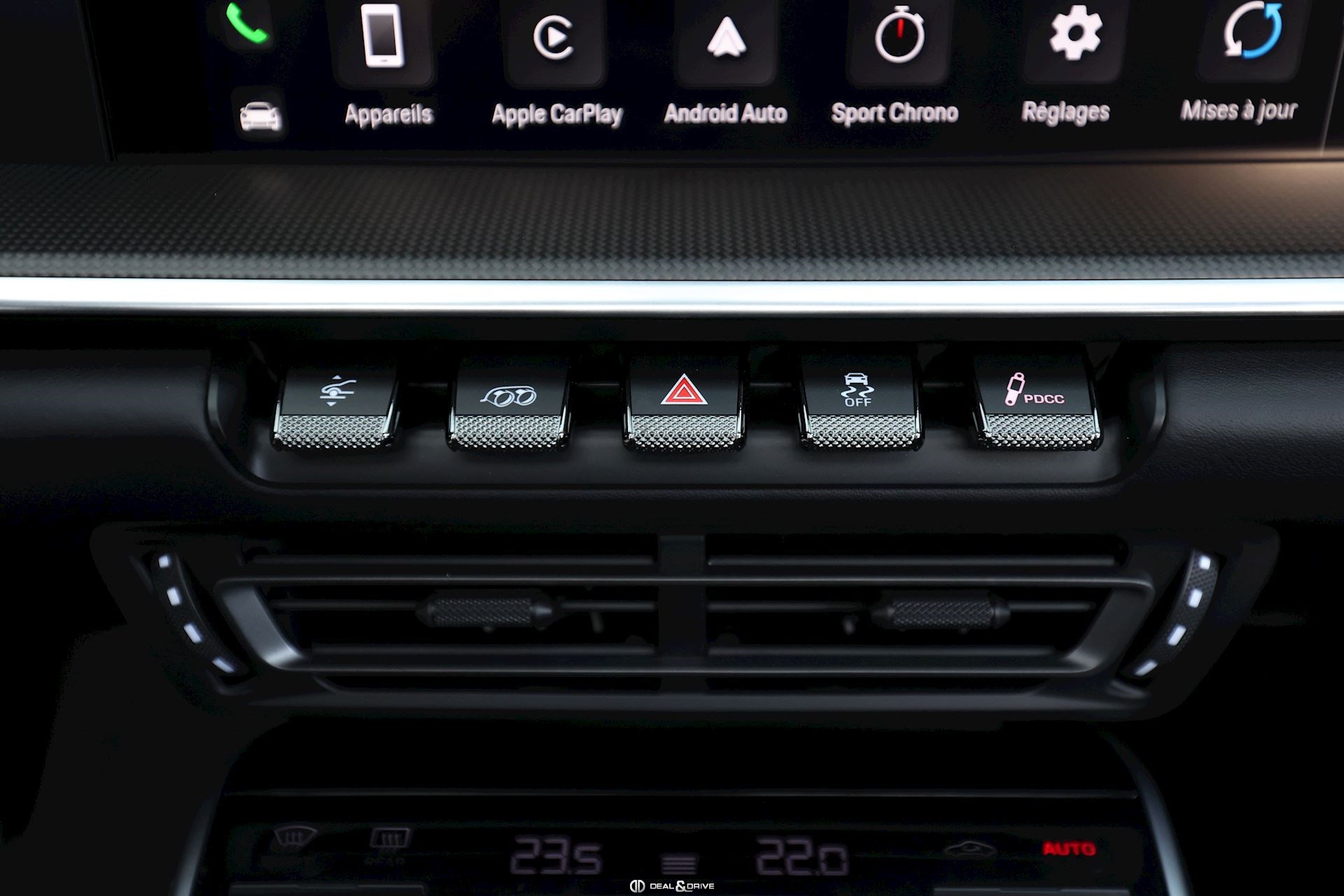 MOTEUR, TRANSMISSION ET CHÂSSIS 0P9 Système d’échappement Sport avec sorties en Noir – Exclusive Manufaktur 1LX Freins céramiques, Porsche Ceramic Composite Brake PCCB avec étriers de frein peints en Noir – Exclusive Manufaktur 1N3 Direction assistée Pus, asservie à la vitesse Servotronic Plus 2UH Système de levage de l’essieu avant Lift System 7I2 Porsche Vehicle Tracking System PVTS