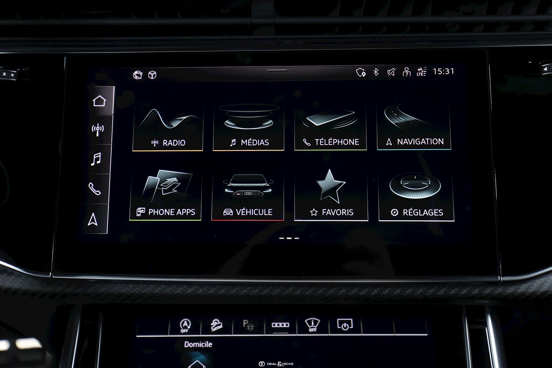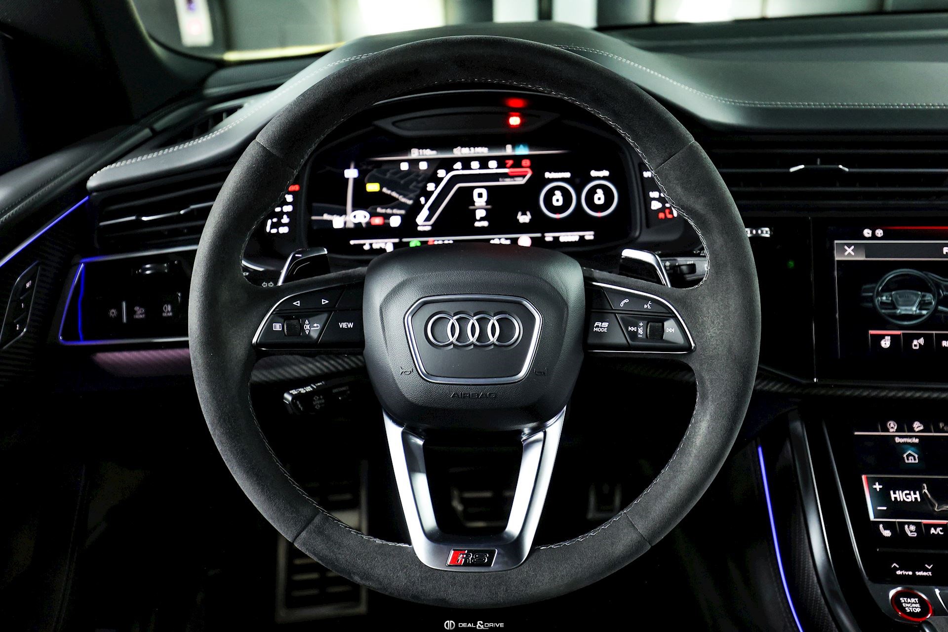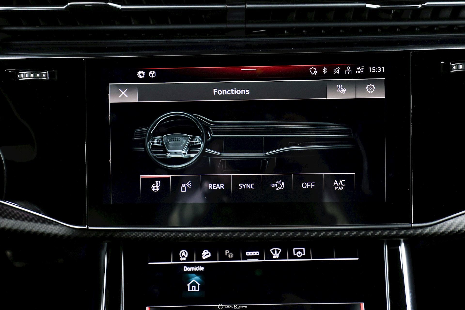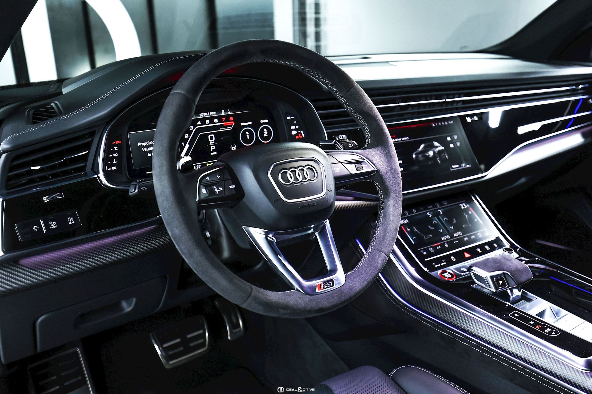 INTÉRIEUR Inserts en Carbone Sergé Sellerie en cuir Valcona, perforé, alvéolé Sièges avant Sport Plus RS Sièges avant électriques Sièges avant avec fonction mémoire Sièges avant ventilés Sièges avant chauffants Sièges avant avec fonction massage Appuie-lombaires électriques Isofix sur siège passager Volant en Alcantara, multifonctions Volant chauffant Volant réglable électriquement Rideaux pare-soleil sur les vitres à l’arrière Plafonnier Noir Climatisation automatique 4 zones Seuils de porte en Aluminium, éclairés avec monogramme « RSQ8 » Accoudoir central avant Ionisateur d’intérieur Seuil de chargement en Inox
