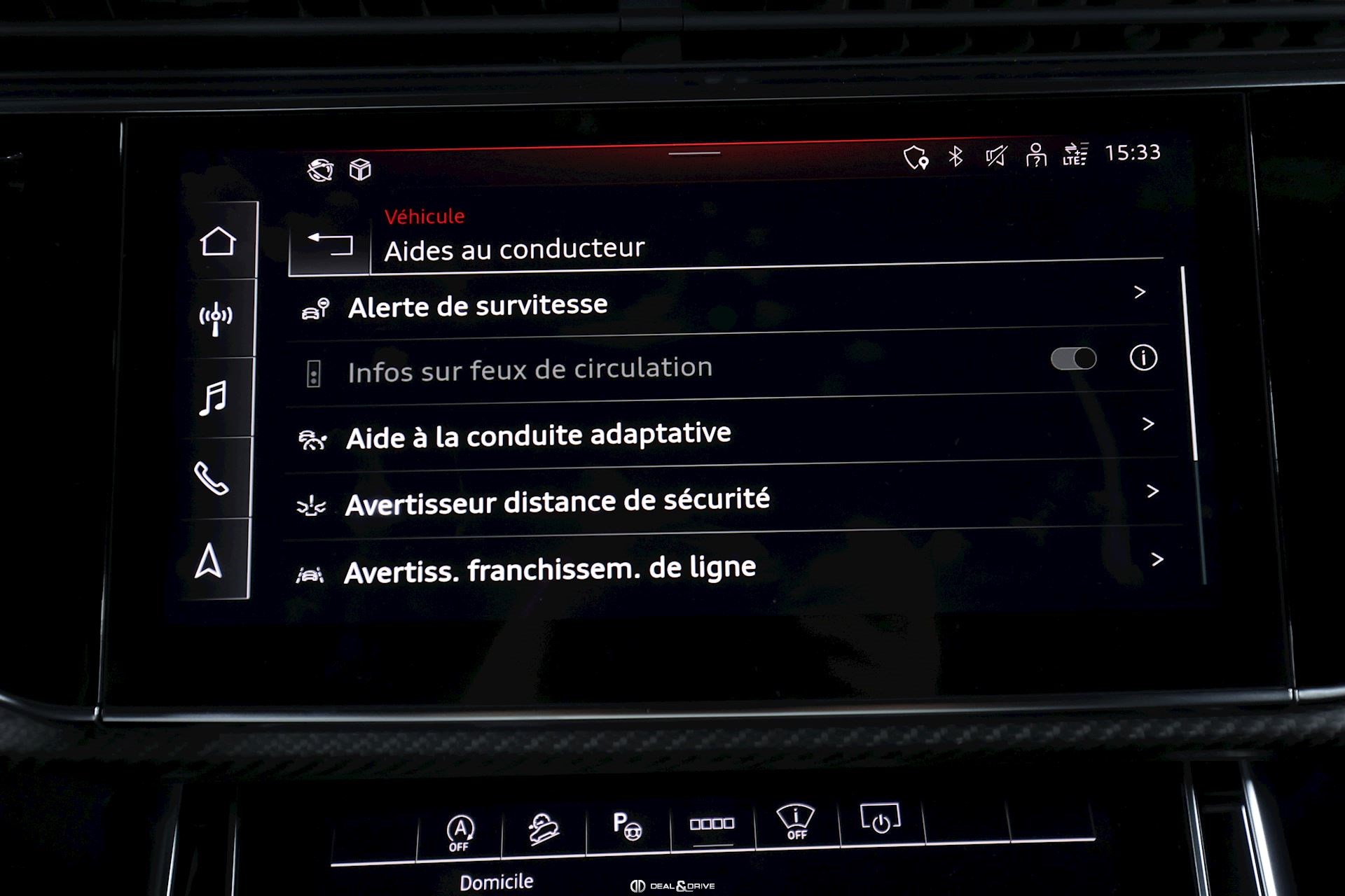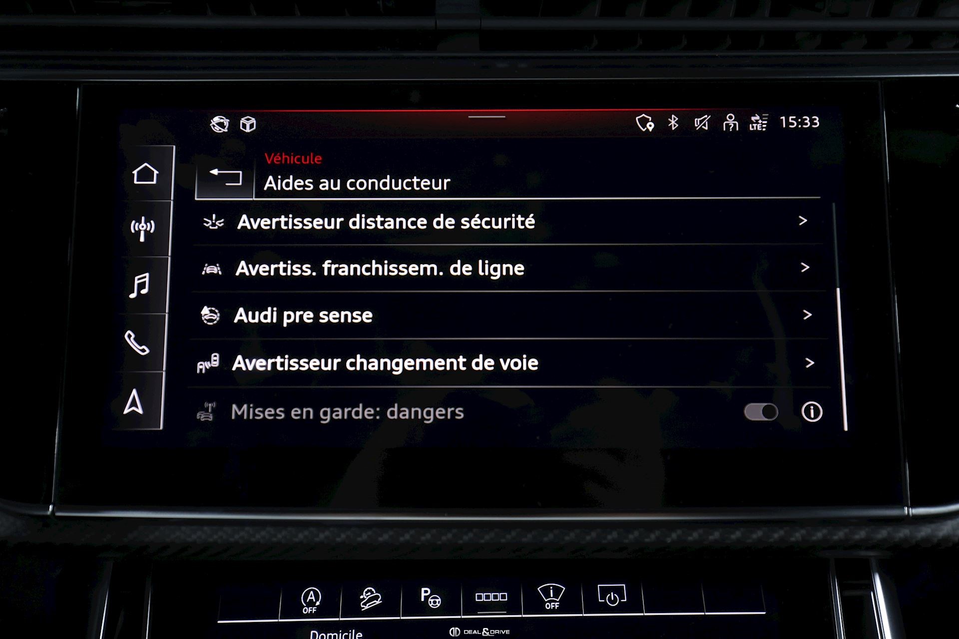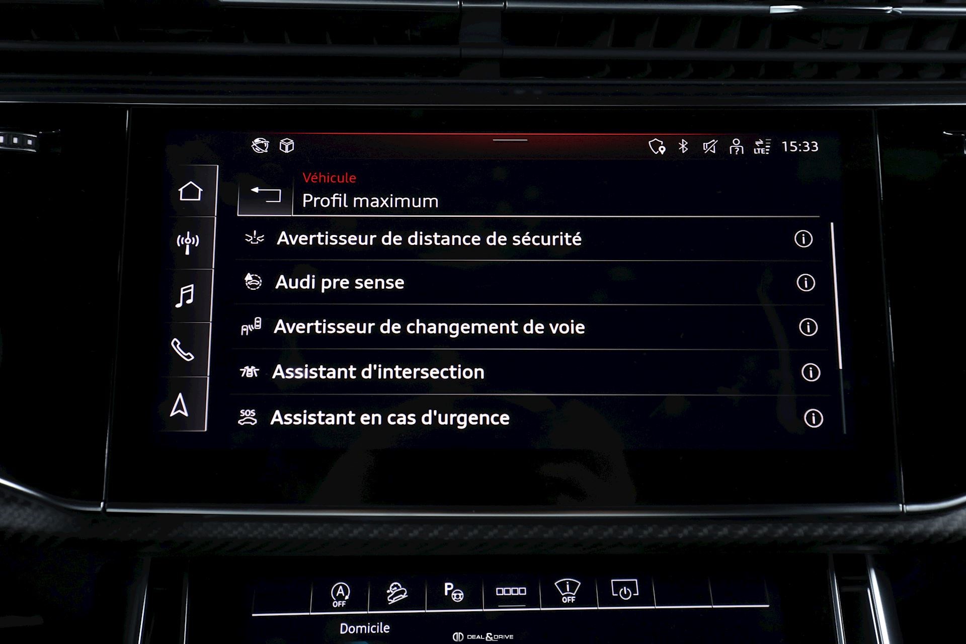 Pack Assistance Tour Système de reconnaissance des panneaux de signalisation Régulateur de vitesse adaptatif ACC avec fonction Stop & Go comprenant Audi Pre Sense Front Limiteur de vitesse Aide à l’évitement de collision Assistant de changement de direction gauche Système d’appel d'urgence Avertissement de franchissement involontaire de ligne comprenant Assistant détresse Aide à la conduite adaptative
