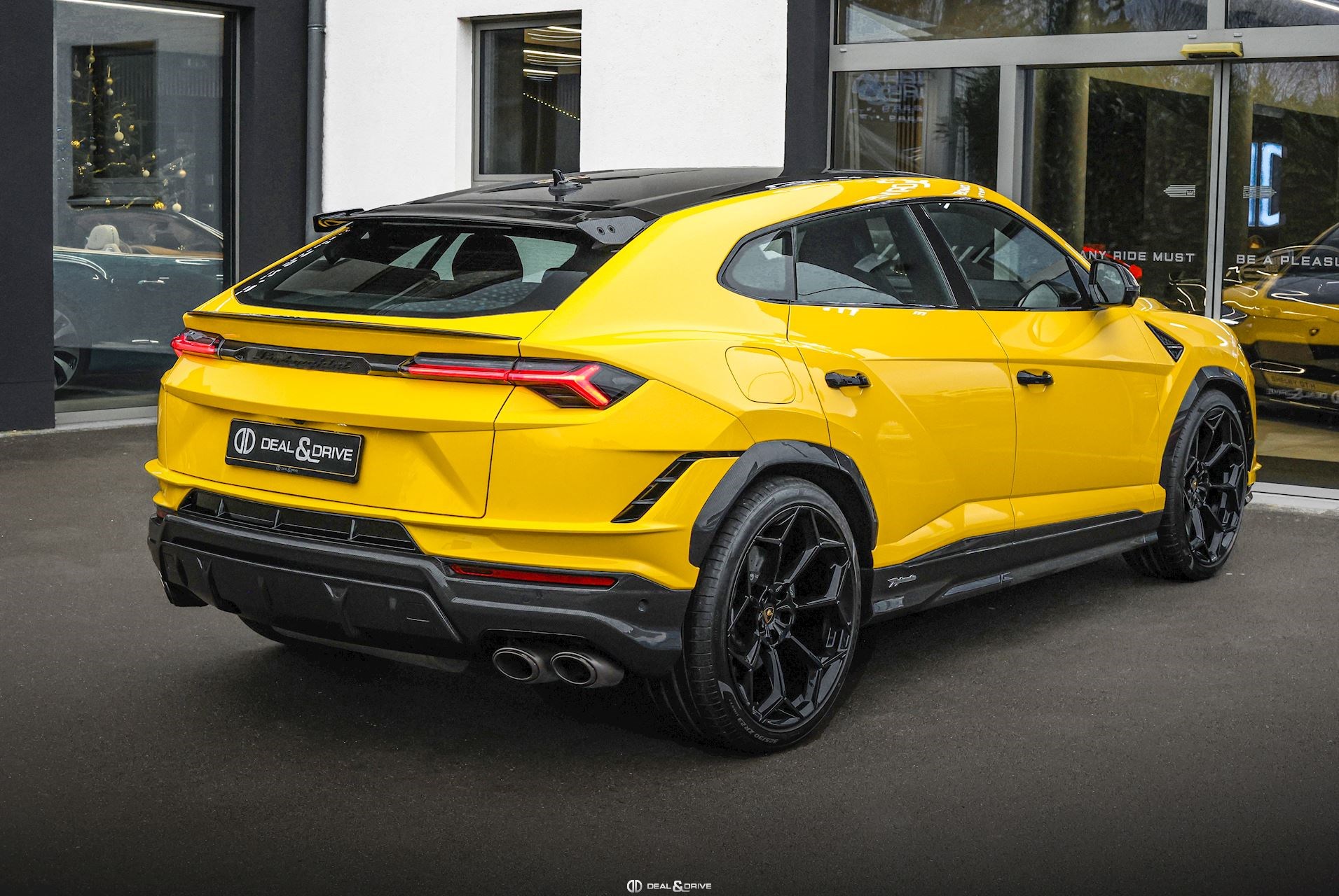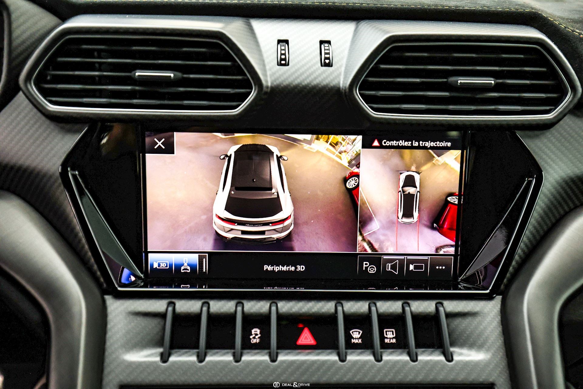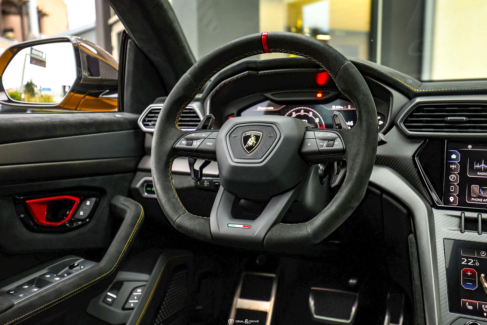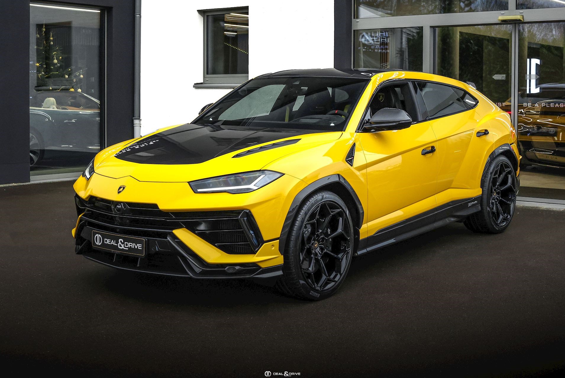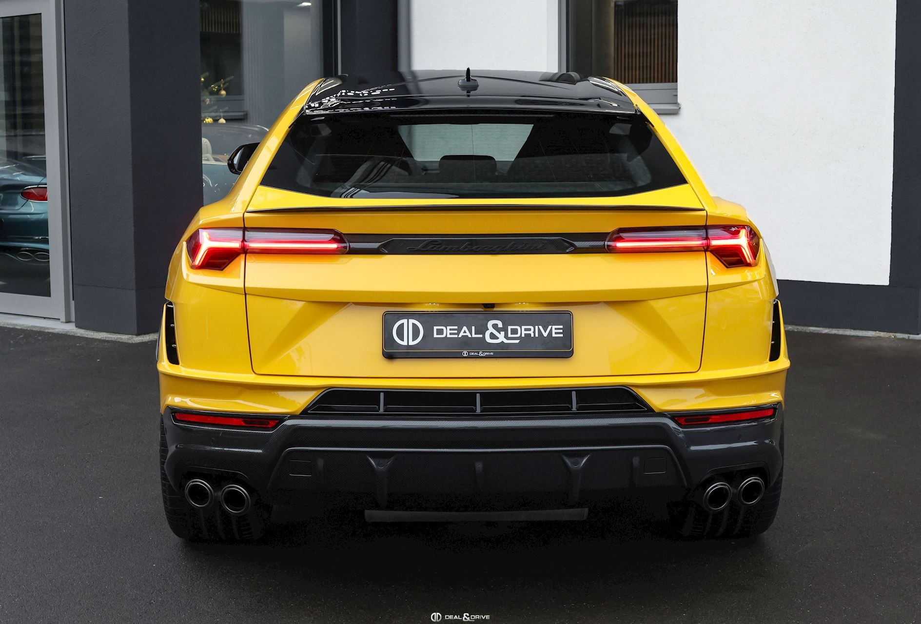 EXTÉRIEUR Toit en Carbone brillant apparent Capot en Carbone brillant apparent Jantes 23’’ type Pelope en Noir brillant avec boulons en Titane Étriers de frein en Noir Encadrement des vitres latérales en Noir brillant Poignées de porte en Noir Hayon électrique Logo Lamborghini arrière en Noir Mat Rétroviseurs extérieurs électriques Rétroviseurs extérieurs rabattables électriquement Rétroviseurs extérieurs chauffants