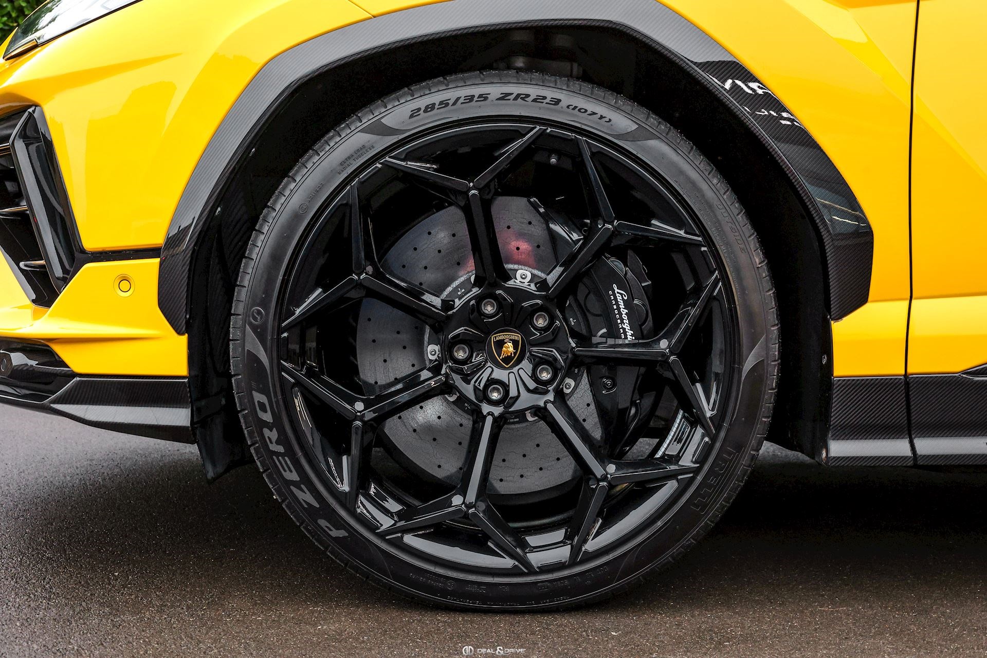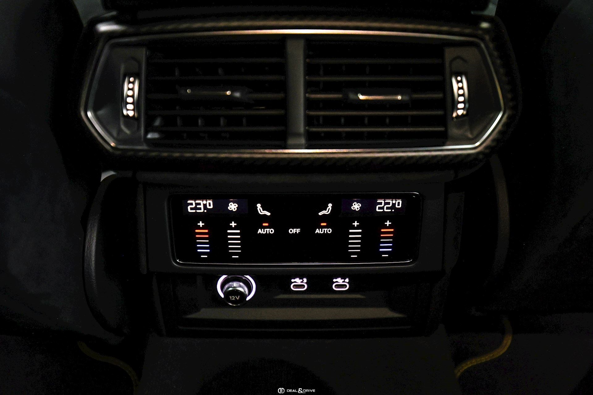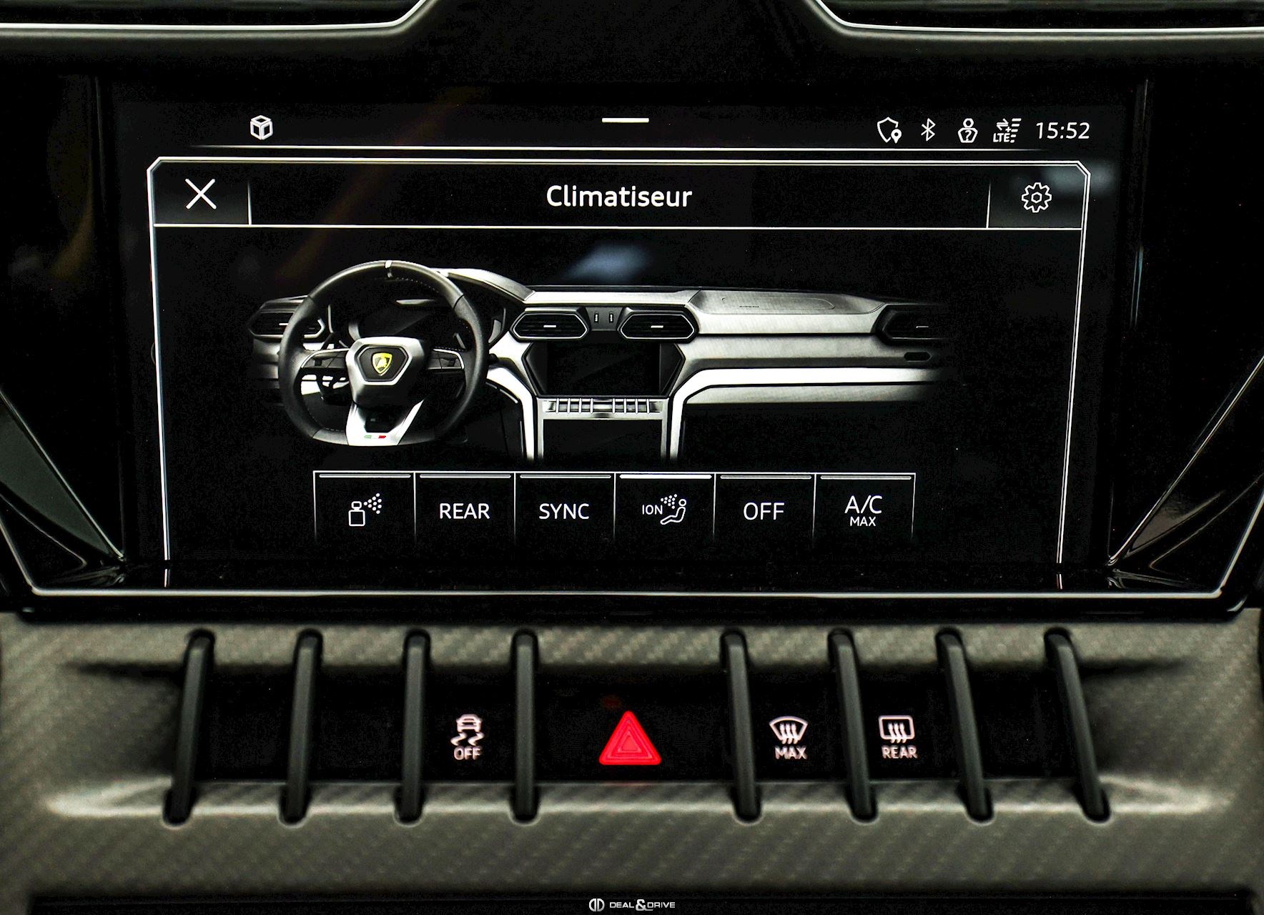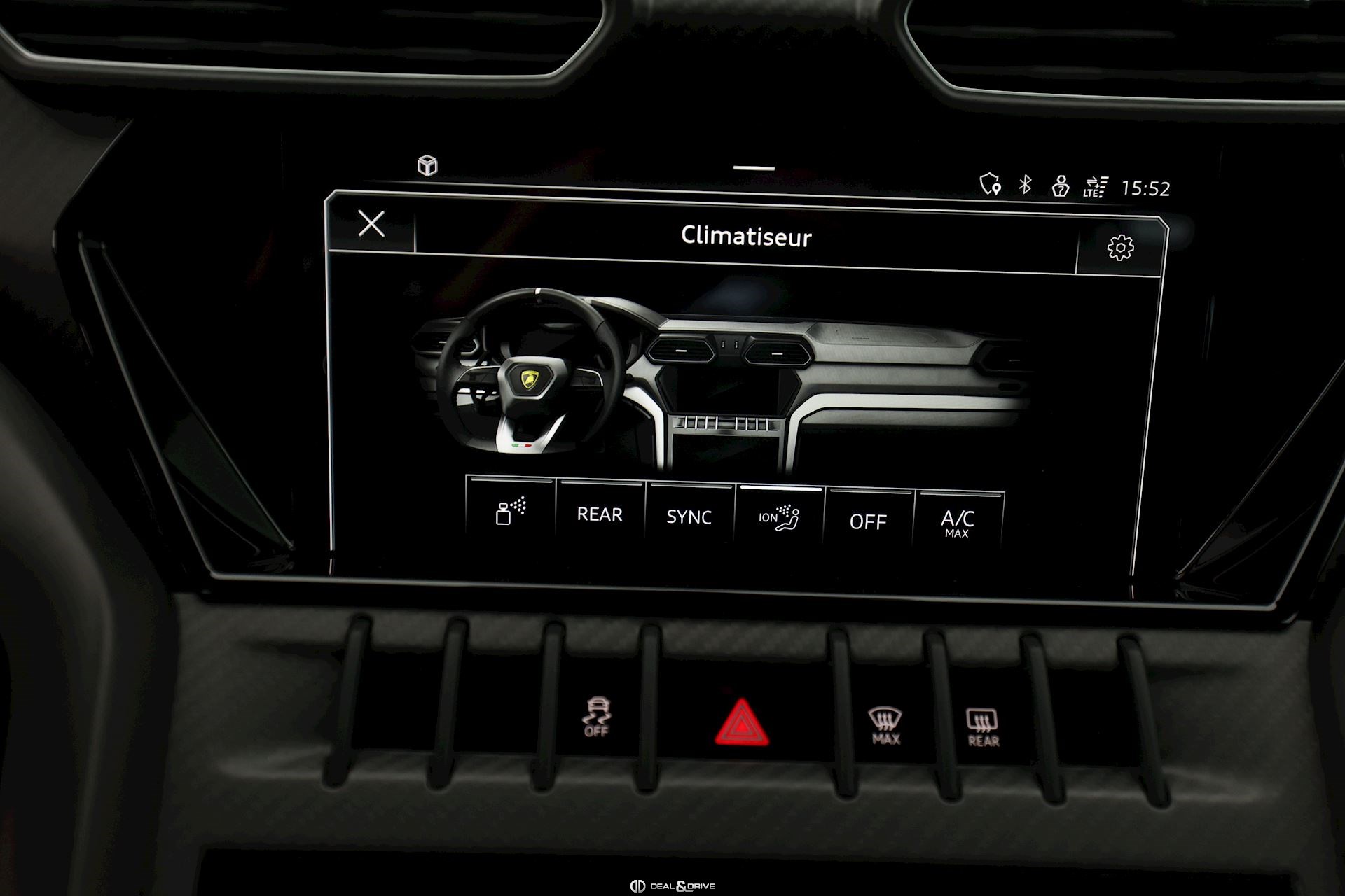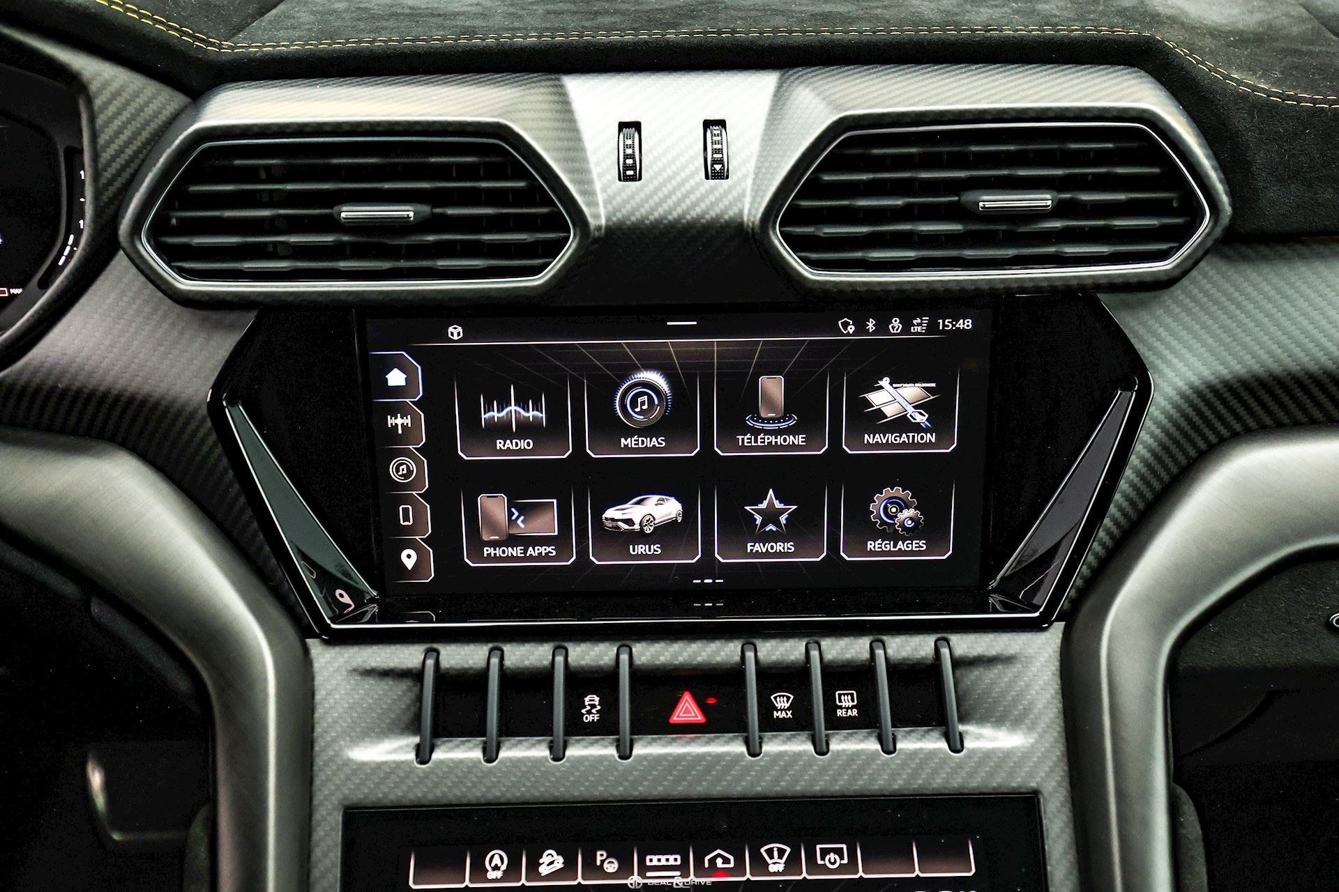 EXTÉRIEUR Toit en Carbone brillant apparent Capot en Carbone brillant apparent Jantes 23’’ type Pelope en Noir brillant avec boulons en Titane Étriers de frein en Noir Encadrement des vitres latérales en Noir brillant Poignées de porte en Noir Hayon électrique Logo Lamborghini arrière en Noir Mat Rétroviseurs extérieurs électriques Rétroviseurs extérieurs rabattables électriquement Rétroviseurs extérieurs chauffants