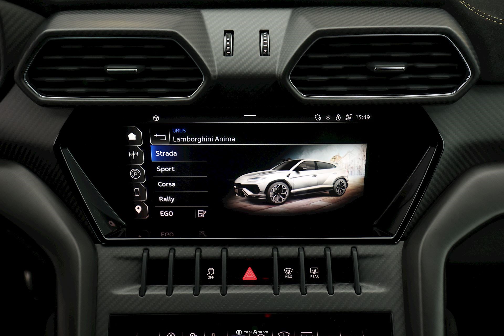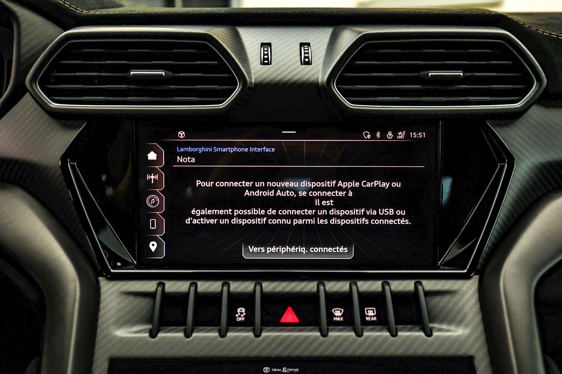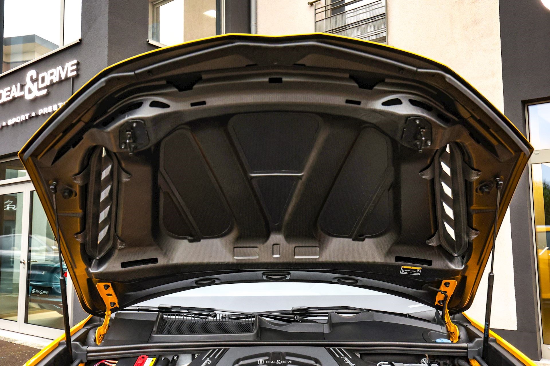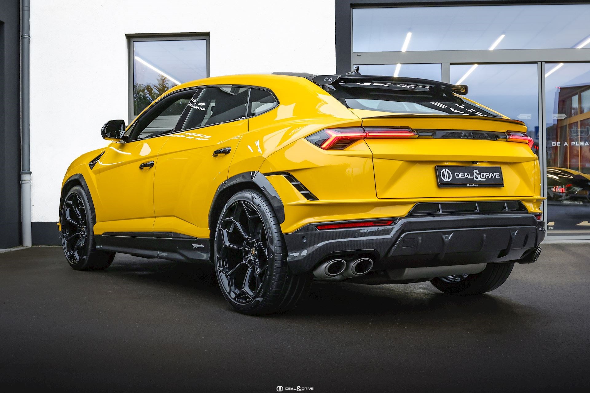 EXTÉRIEUR Toit en Carbone brillant apparent Capot en Carbone brillant apparent Jantes 23’’ type Pelope en Noir brillant avec boulons en Titane Étriers de frein en Noir Encadrement des vitres latérales en Noir brillant Poignées de porte en Noir Hayon électrique Logo Lamborghini arrière en Noir Mat Rétroviseurs extérieurs électriques Rétroviseurs extérieurs rabattables électriquement Rétroviseurs extérieurs chauffants