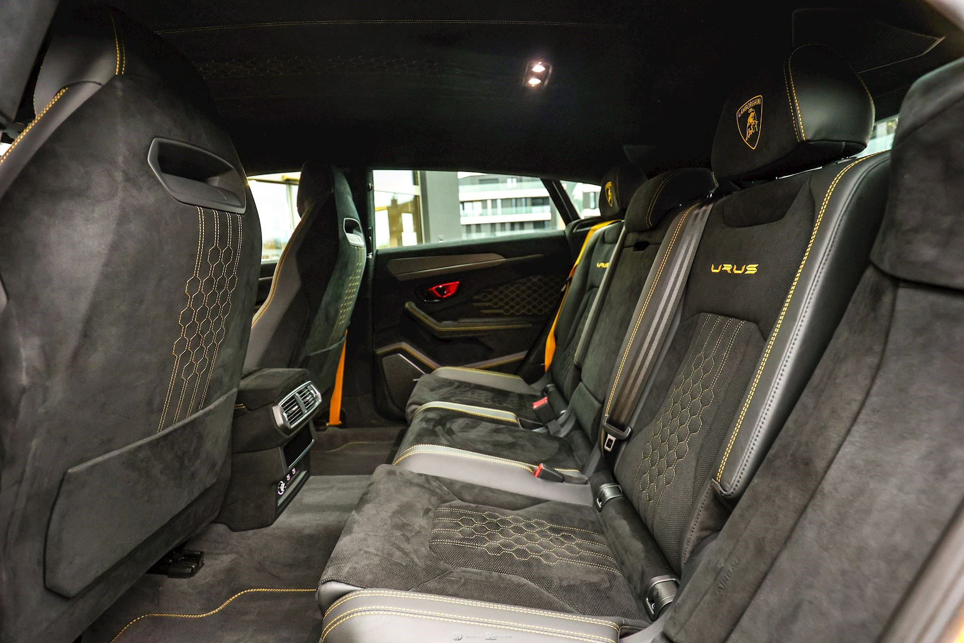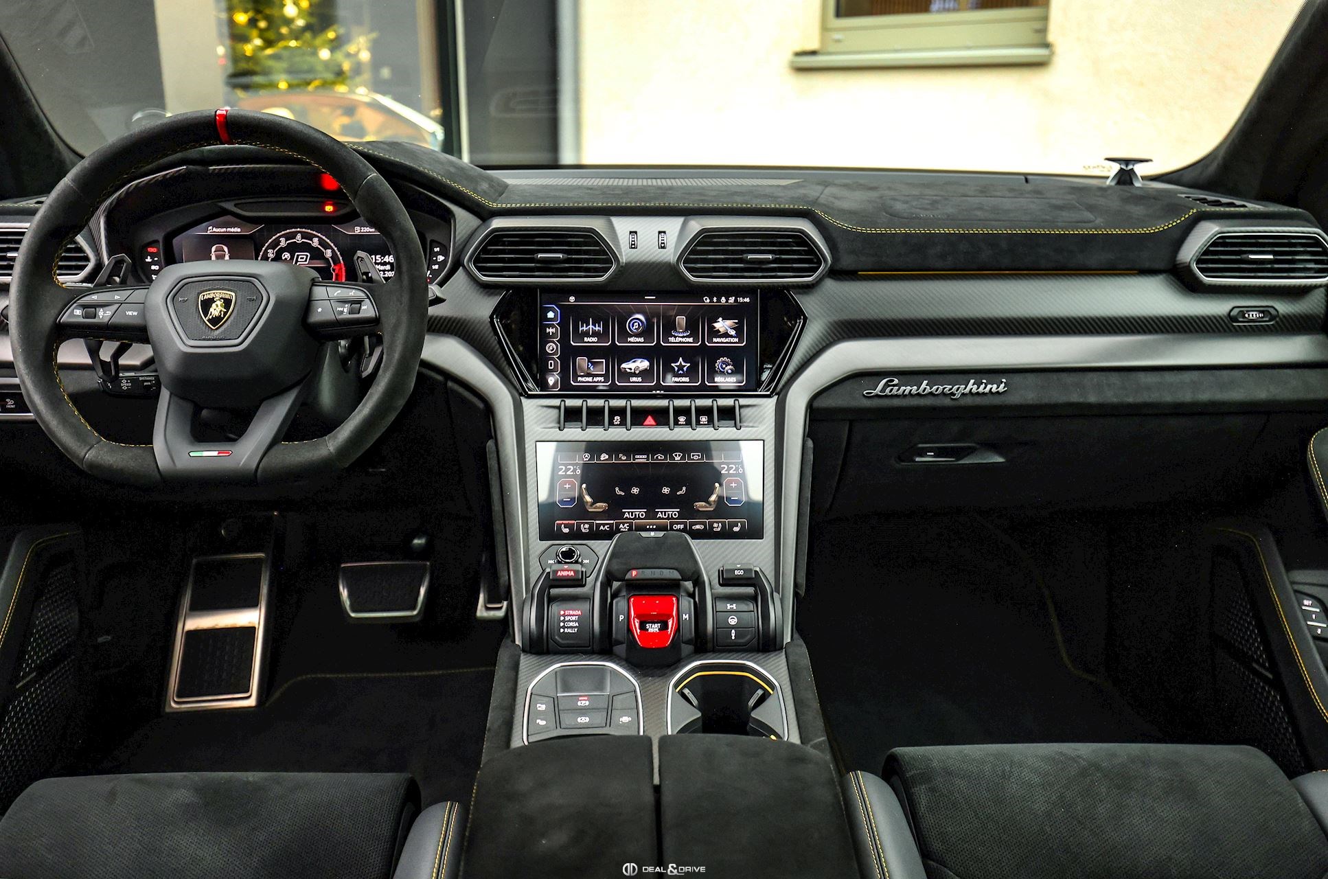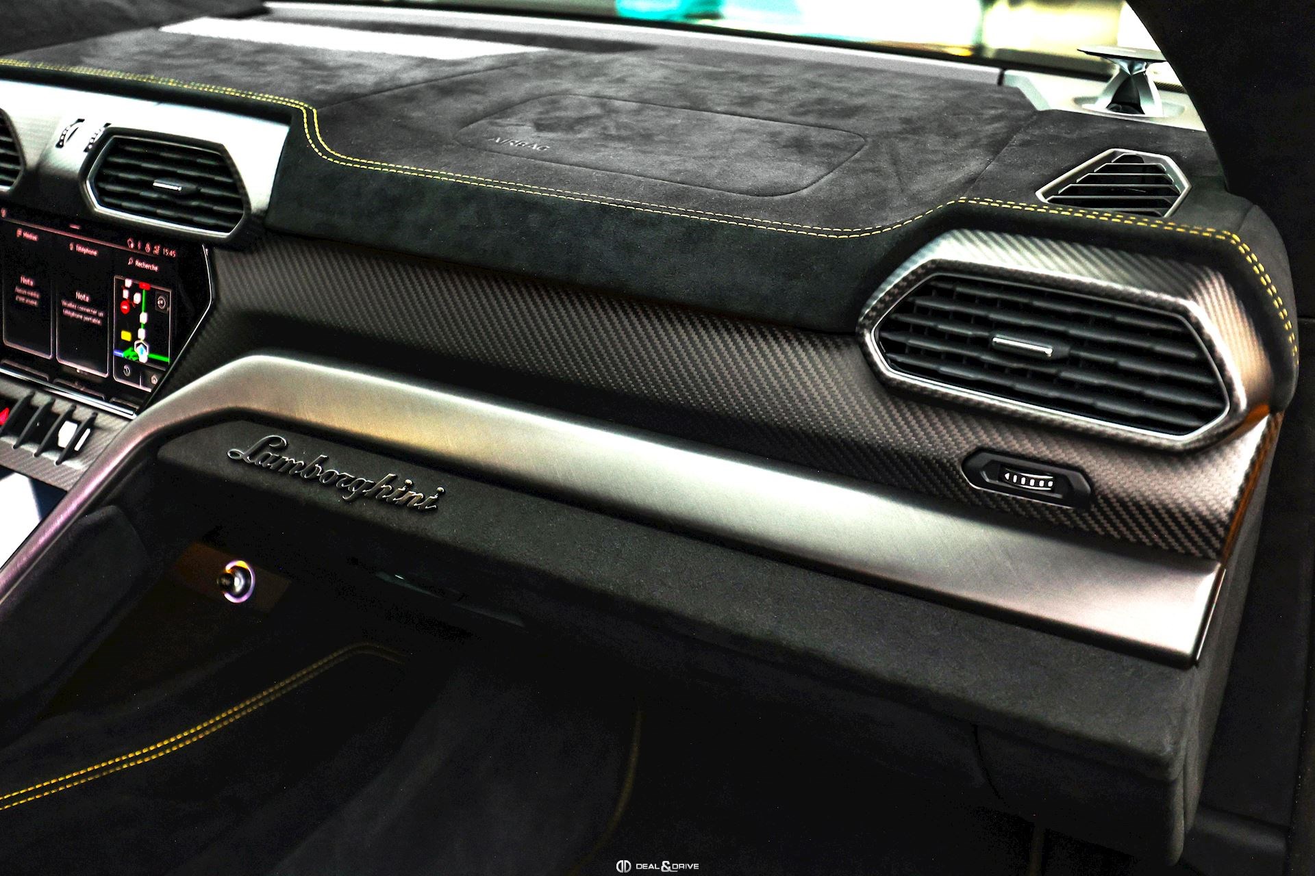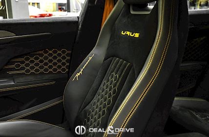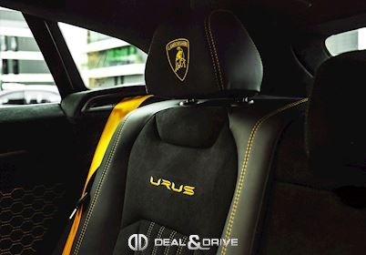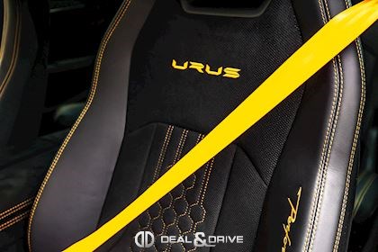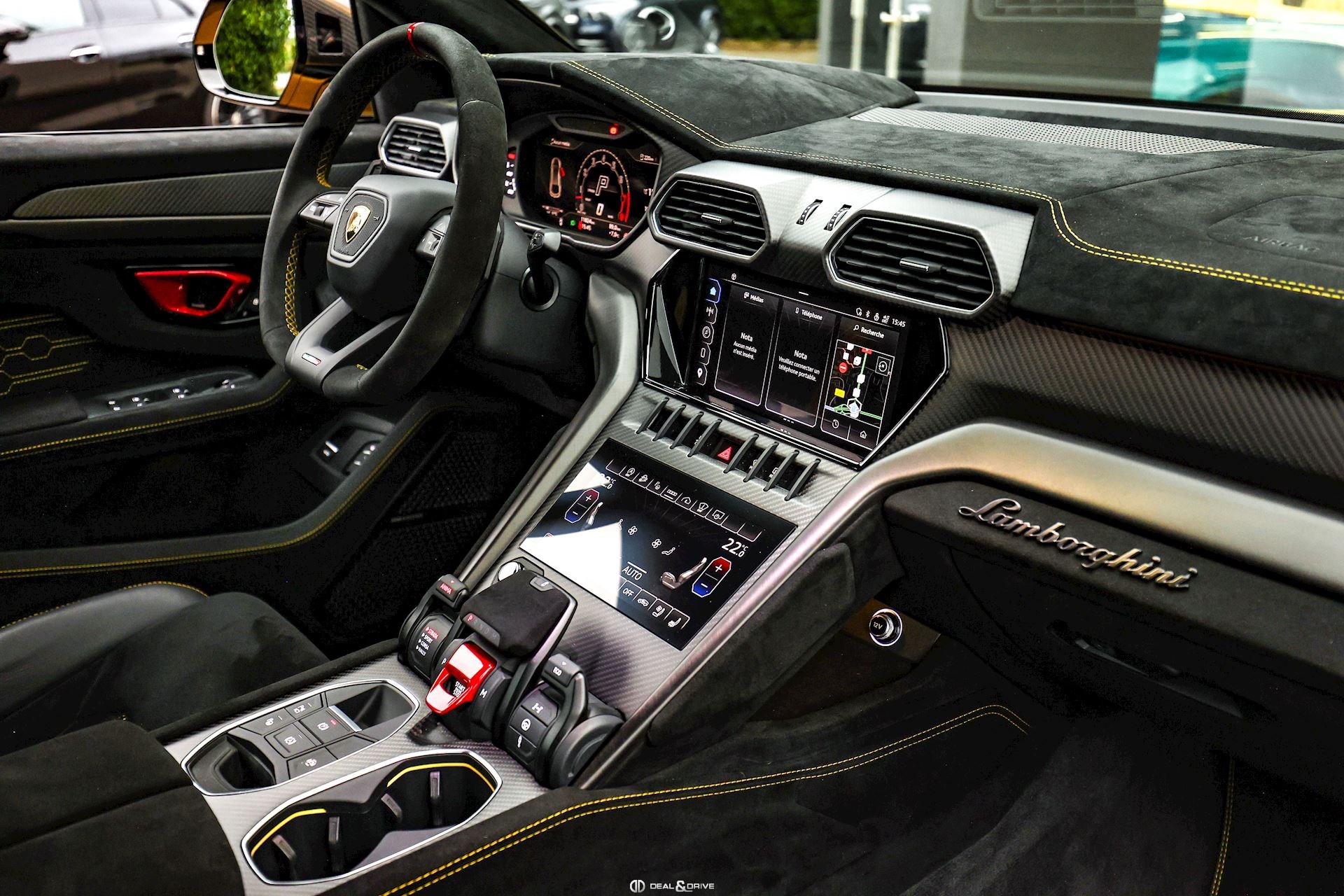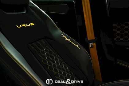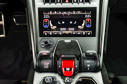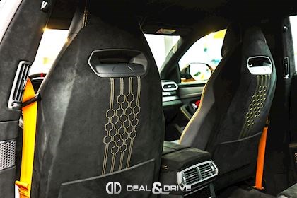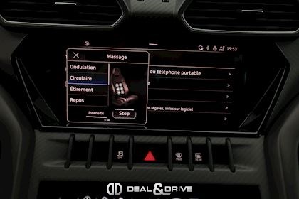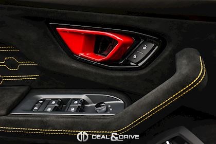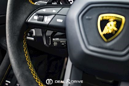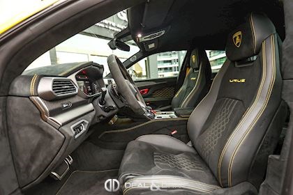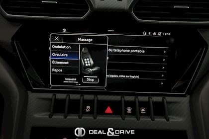 INTÉRIEUR Sellerie en cuir et Alcantara avec surpiqûres jaunes Ceintures de sécurité en Jaune Sièges avant électriques Sièges avant à mémoire Sièges avant avec fonction massage Sièges avant chauffants Sièges avant ventilés Appuie-lombaires électriques Tapis de sol en Noir avec joints en cuir et surpiqûres doubles en Jaune Volant Sport en Alcantara, multifonctions avec marquage en Rouge Surpiqûres optionnelles sur le volant Volant réglable électriquement Plafonnier en Alcantara avec surpiqûres en Jaune Emblème Lamborghini brodé sur les appuie-têtes en Jaune Système de qualité de l’air Premium avec ioniser et aromatiser Seuils de porte en Carbon Mat, illuminés Finition Performante étendue sur le dossier des sièges avant Poignées de porte intérieures en Rouge Climatisation automatique 4 zones Isofix sur siège passager