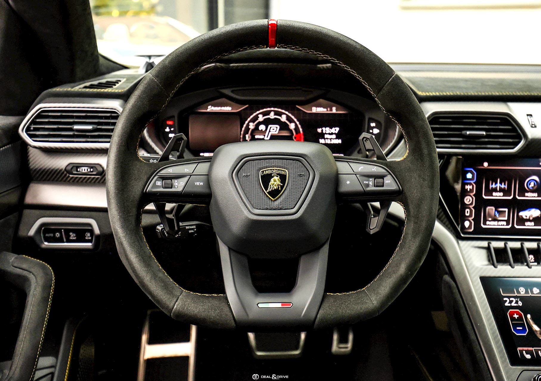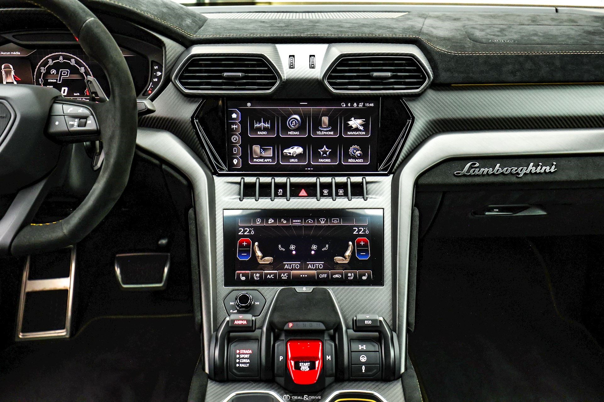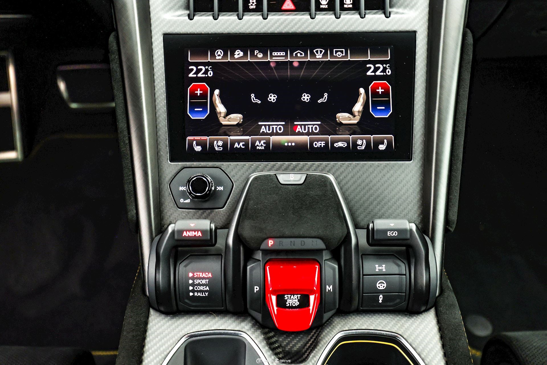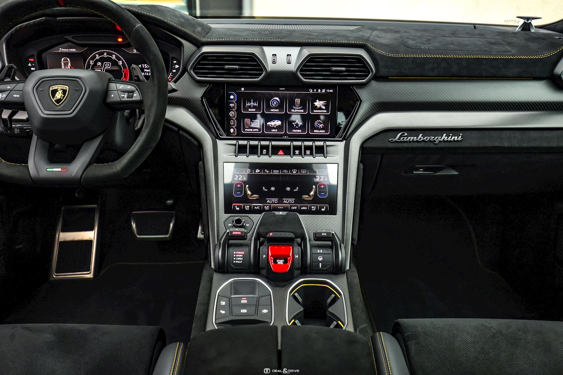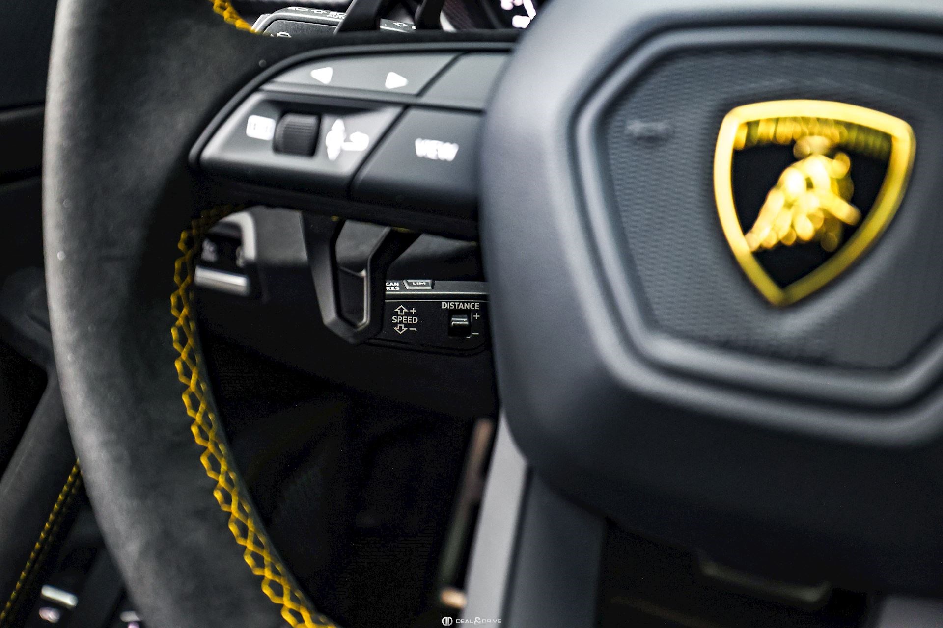 INTÉRIEUR Sellerie en cuir et Alcantara avec surpiqûres jaunes Ceintures de sécurité en Jaune Sièges avant électriques Sièges avant à mémoire Sièges avant avec fonction massage Sièges avant chauffants Sièges avant ventilés Appuie-lombaires électriques Tapis de sol en Noir avec joints en cuir et surpiqûres doubles en Jaune Volant Sport en Alcantara, multifonctions avec marquage en Rouge Surpiqûres optionnelles sur le volant Volant réglable électriquement Plafonnier en Alcantara avec surpiqûres en Jaune Emblème Lamborghini brodé sur les appuie-têtes en Jaune Système de qualité de l’air Premium avec ioniser et aromatiser Seuils de porte en Carbon Mat, illuminés Finition Performante étendue sur le dossier des sièges avant Poignées de porte intérieures en Rouge Climatisation automatique 4 zones Isofix sur siège passager