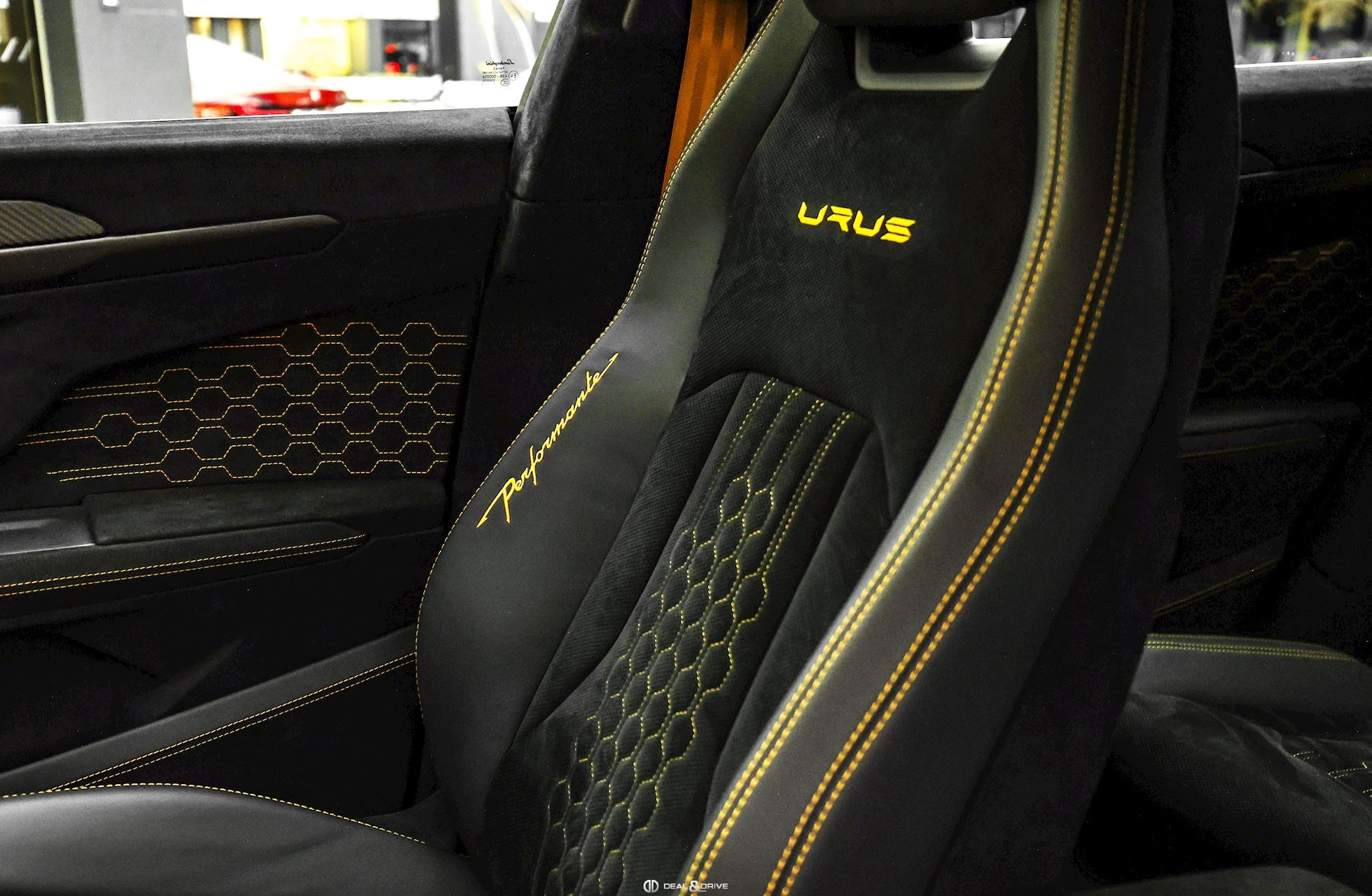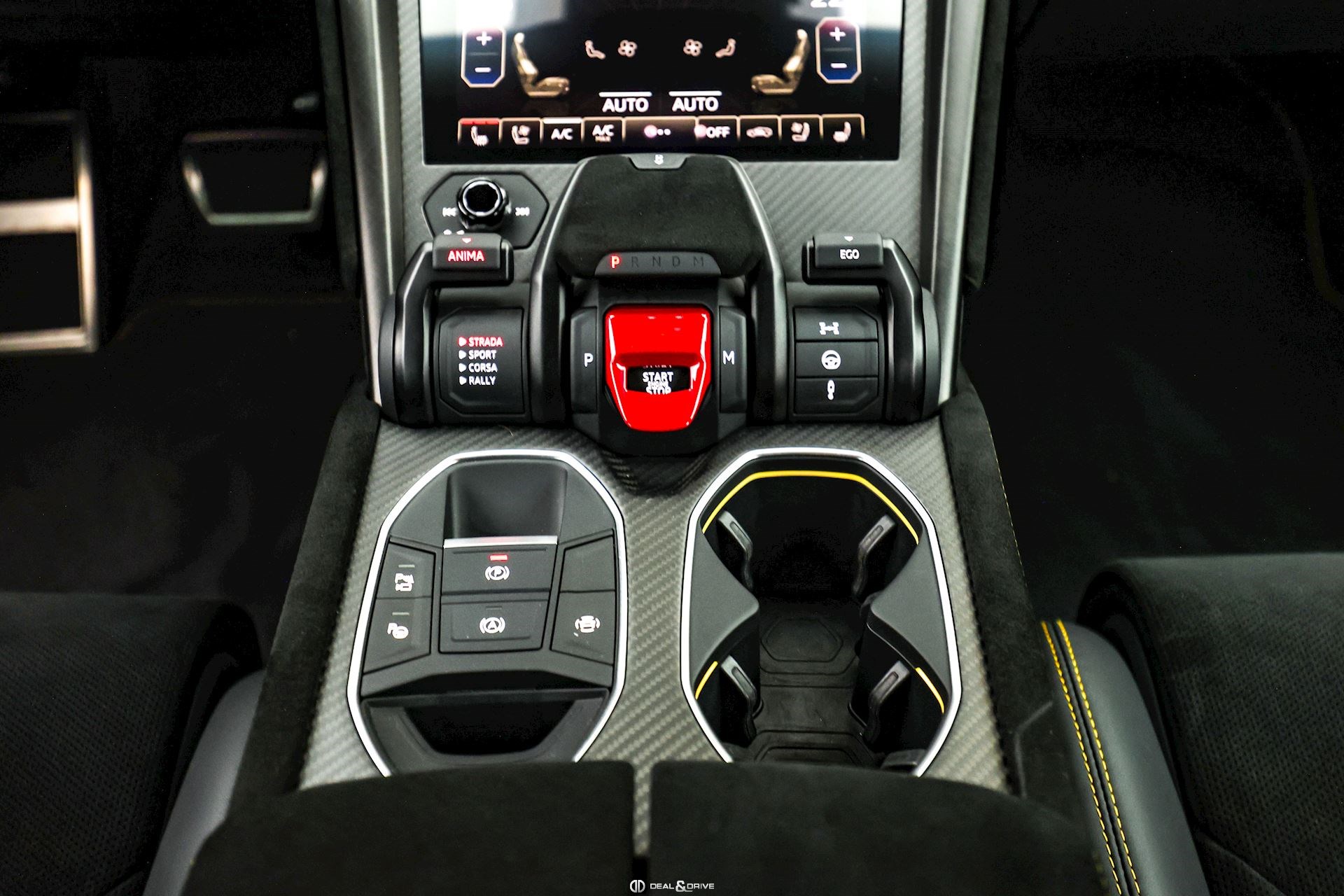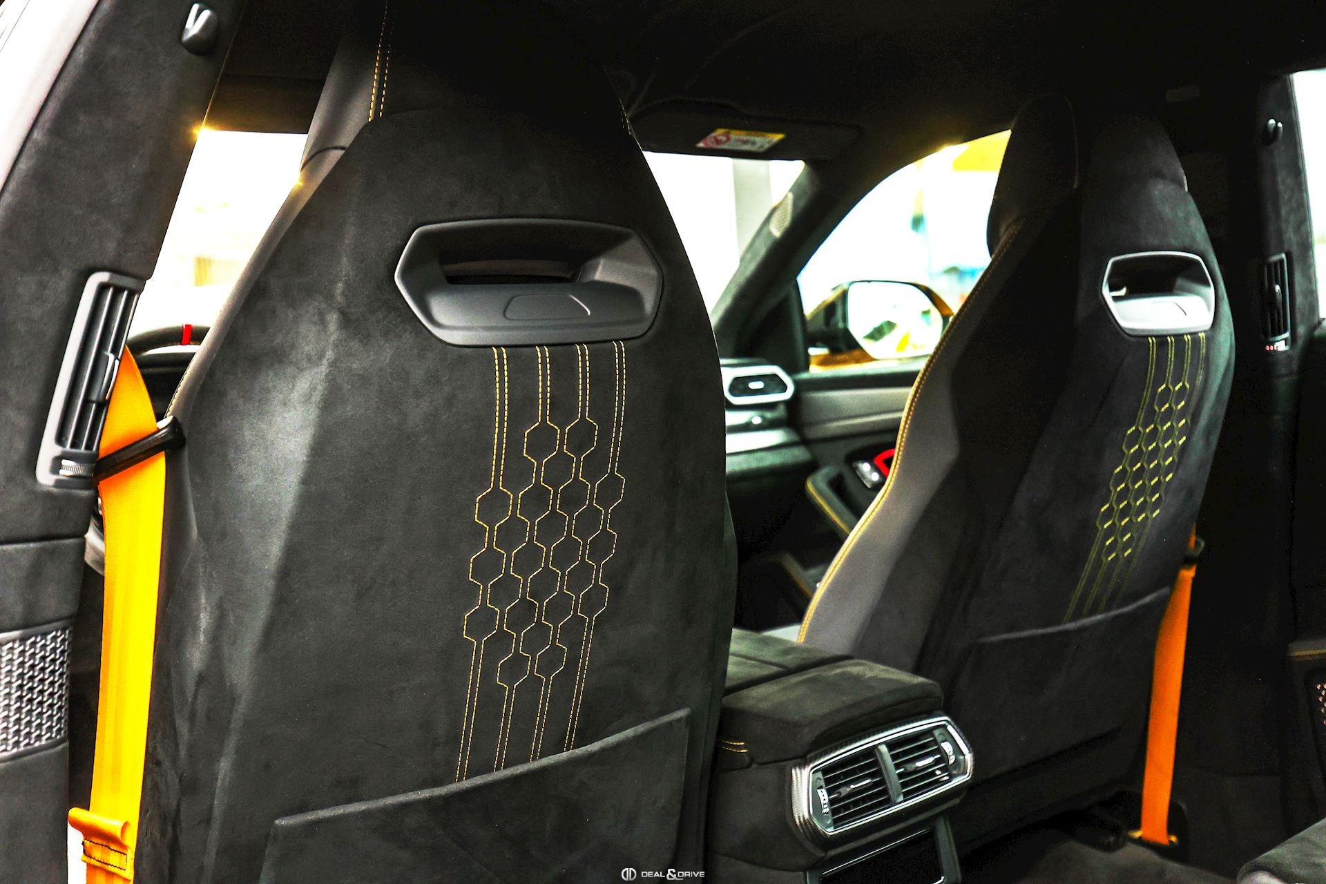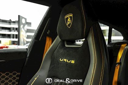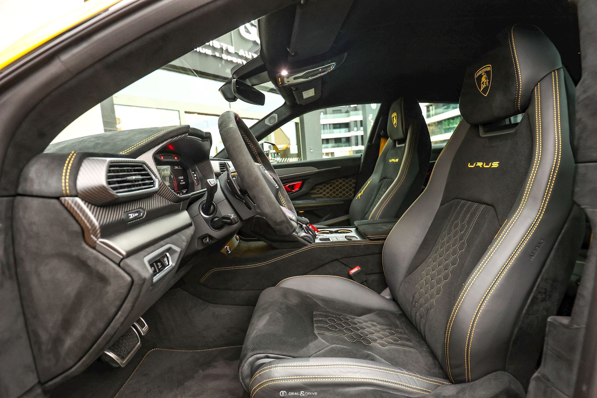 INTÉRIEUR Sellerie en cuir et Alcantara avec surpiqûres jaunes Ceintures de sécurité en Jaune Sièges avant électriques Sièges avant à mémoire Sièges avant avec fonction massage Sièges avant chauffants Sièges avant ventilés Appuie-lombaires électriques Tapis de sol en Noir avec joints en cuir et surpiqûres doubles en Jaune Volant Sport en Alcantara, multifonctions avec marquage en Rouge Surpiqûres optionnelles sur le volant Volant réglable électriquement Plafonnier en Alcantara avec surpiqûres en Jaune Emblème Lamborghini brodé sur les appuie-têtes en Jaune Système de qualité de l’air Premium avec ioniser et aromatiser Seuils de porte en Carbon Mat, illuminés Finition Performante étendue sur le dossier des sièges avant Poignées de porte intérieures en Rouge Climatisation automatique 4 zones Isofix sur siège passager
