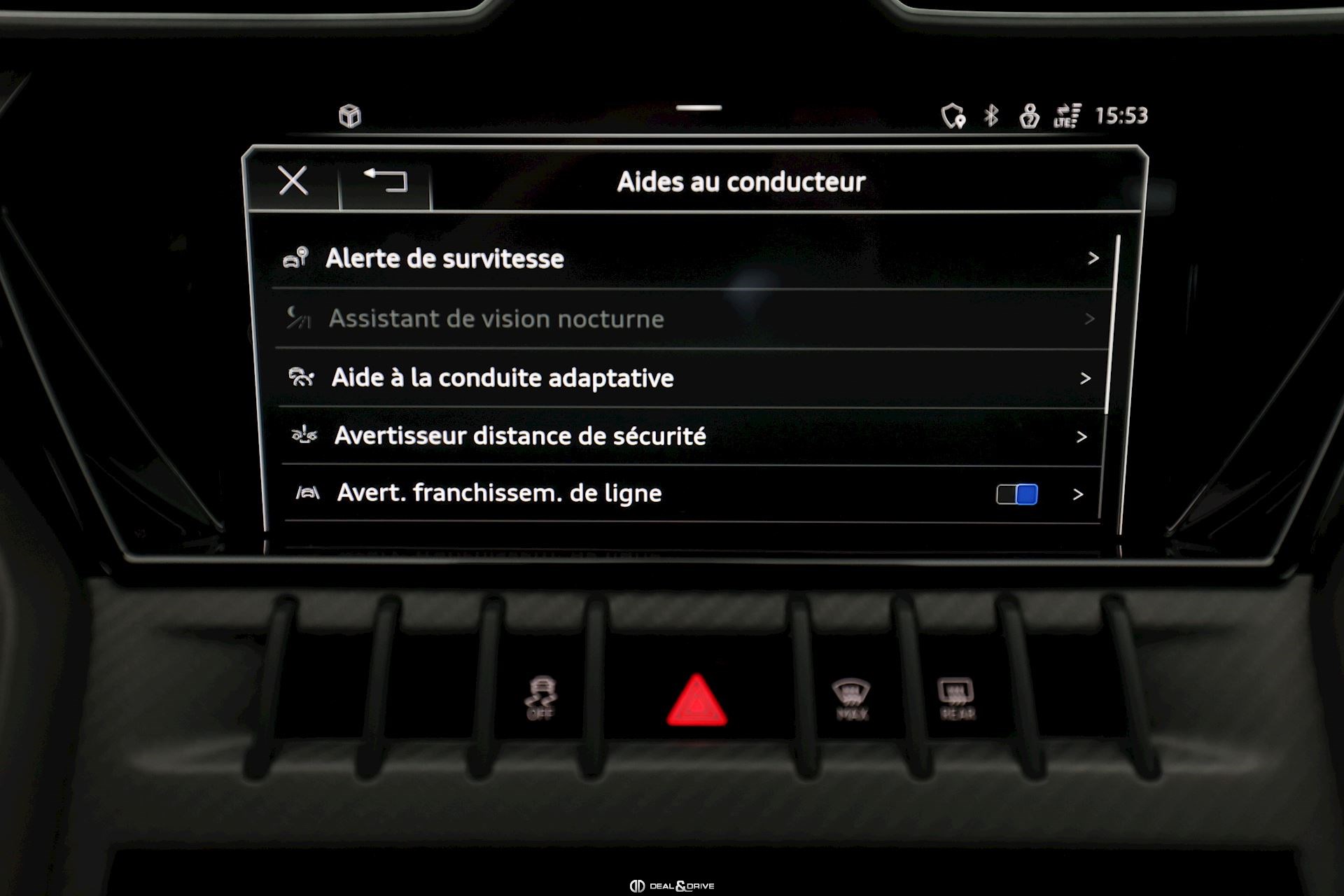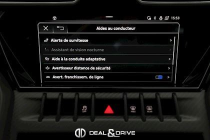 Pack complet ADAS Régulateur de vitesse adaptatif ACC Limiteur de vitesse Système de freinage d’urgence Alerte de franchissement involontaire de ligne Système de reconnaissance des panneaux de signalisation Aides au stationnement avant et arrière Caméra 360° avec vue 3D Assistant de stationnement Park Assist Affichage tête haute Aide au maintien dans la voie