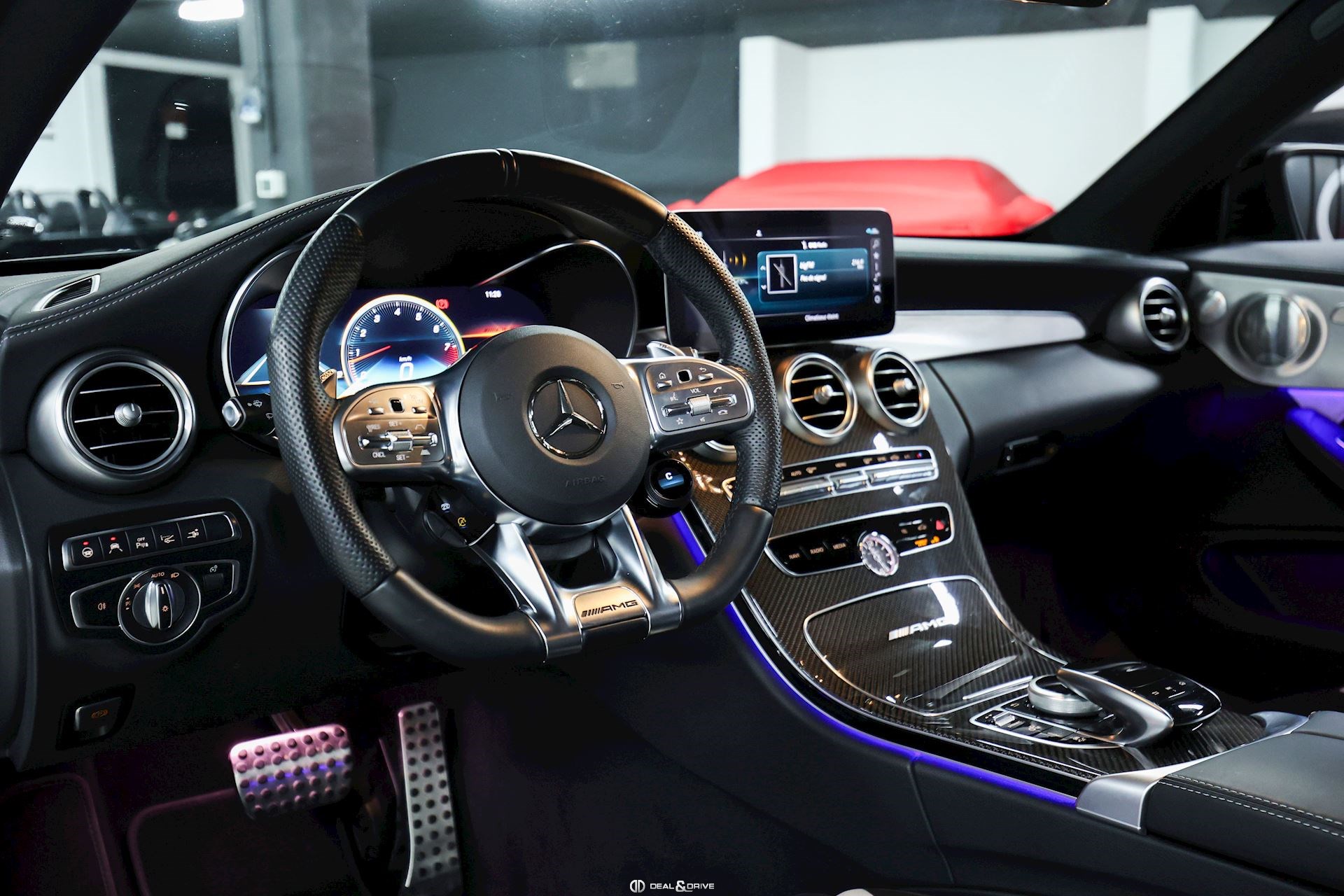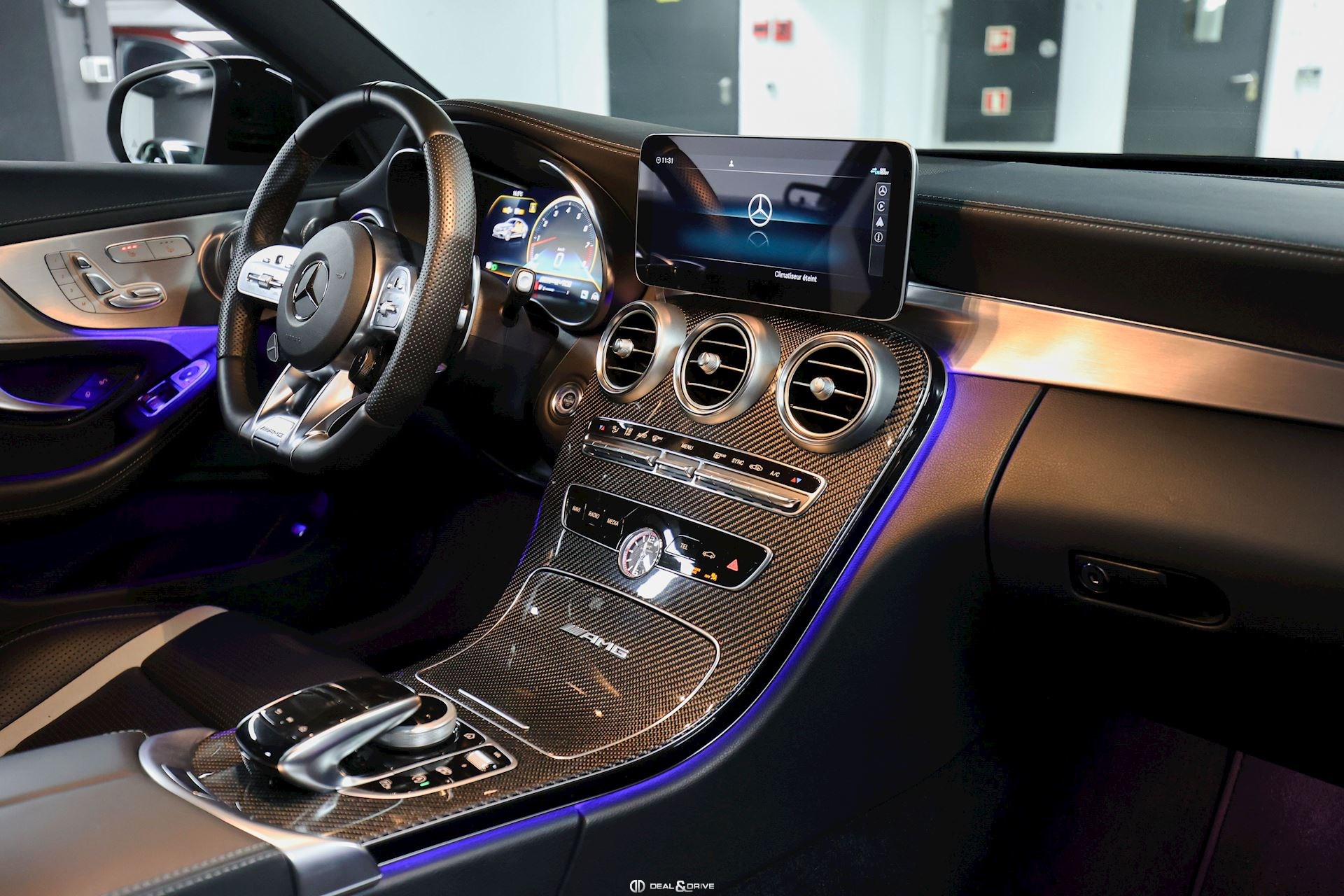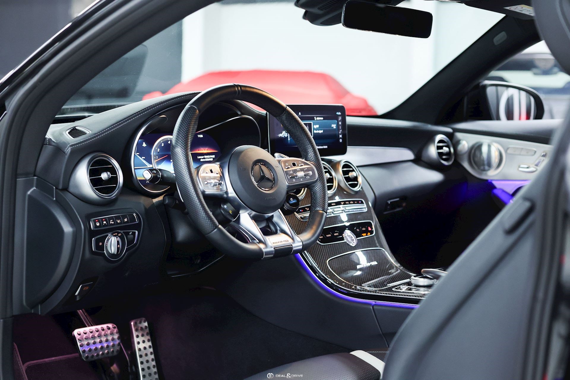 Ceinture de sécurité en Noir Seuils de porte en Aluminium, éclairés, AMG Accoudoir central avant Plafonnier Noir Pédalier en Acier Inox Design Sport