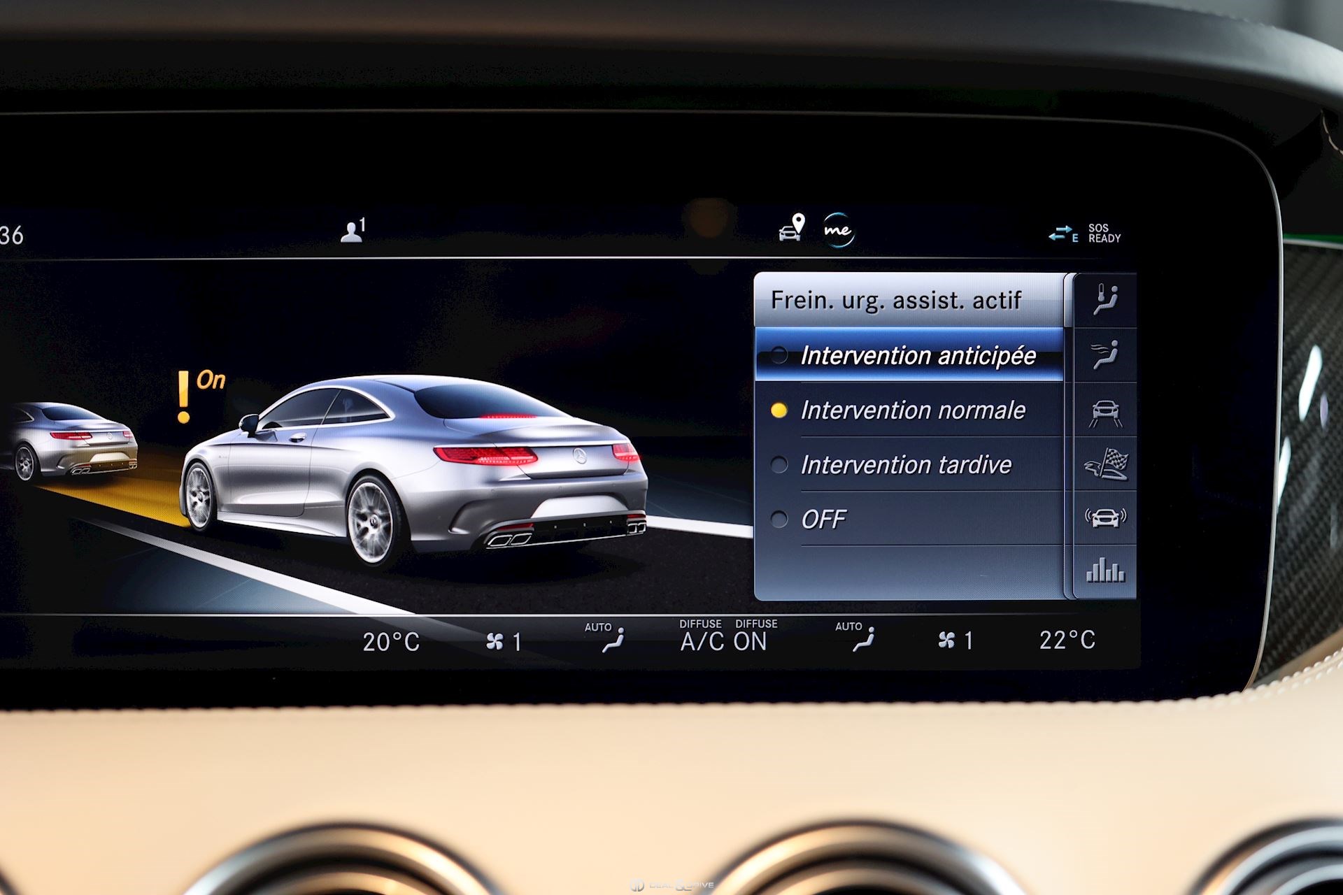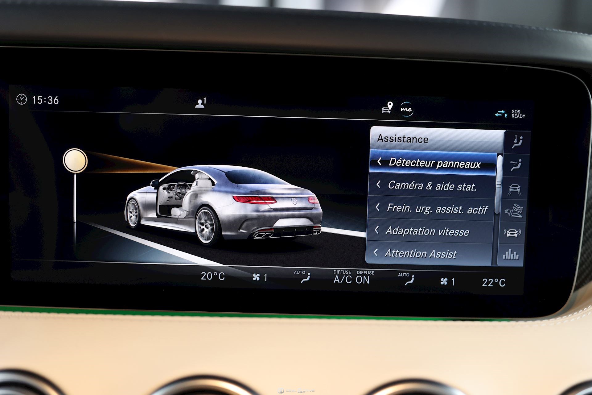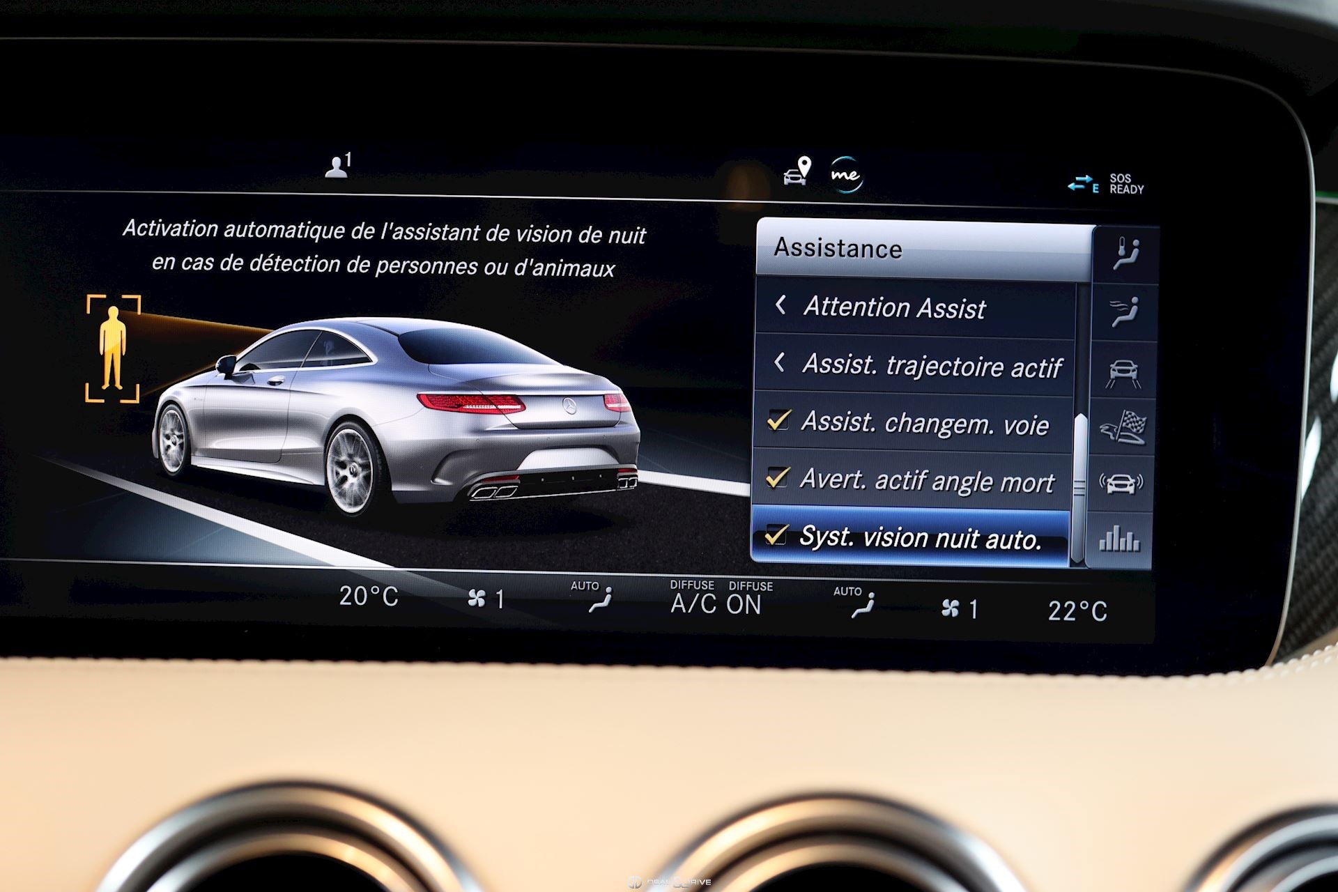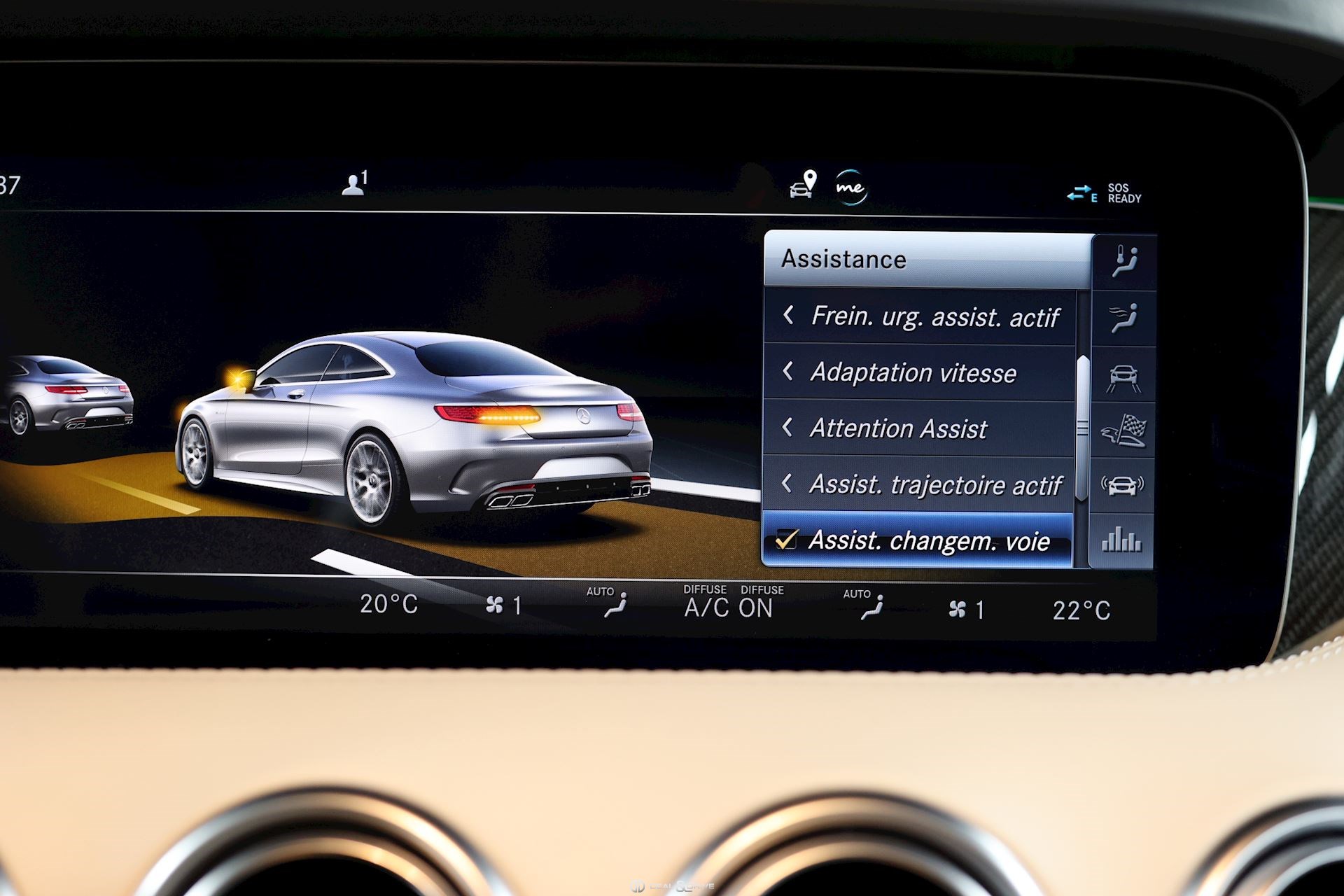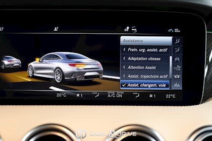 CONFORT, SYSTÈME D'ASSISTANCE Affichage tête haute Assistant de fermeture des portes Soft Close Chauffage auxiliaire Chauffage zone tête AIRSCARF Energizing commande confort Assistant de vision nocturne Night Vision Essuie-glaces adaptatifs Magic Vision Control, chauffants Système de contrôle de la pression des pneus Aide au démarrage en côte Système d'appel d'urgence Assistant de freinage Plus Capteur de somnolence Attention-Assist Système de reconnaissance des panneaux de signalisation
