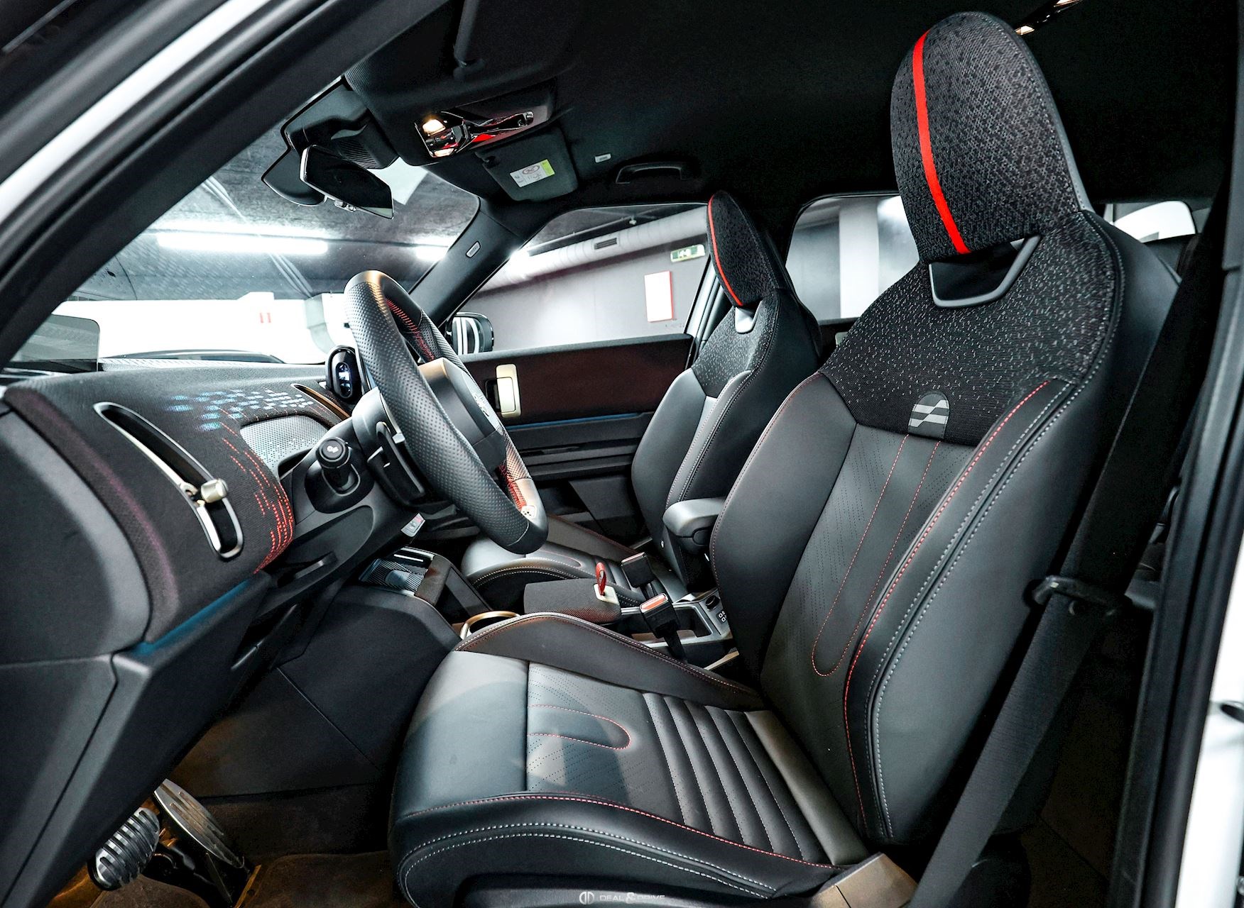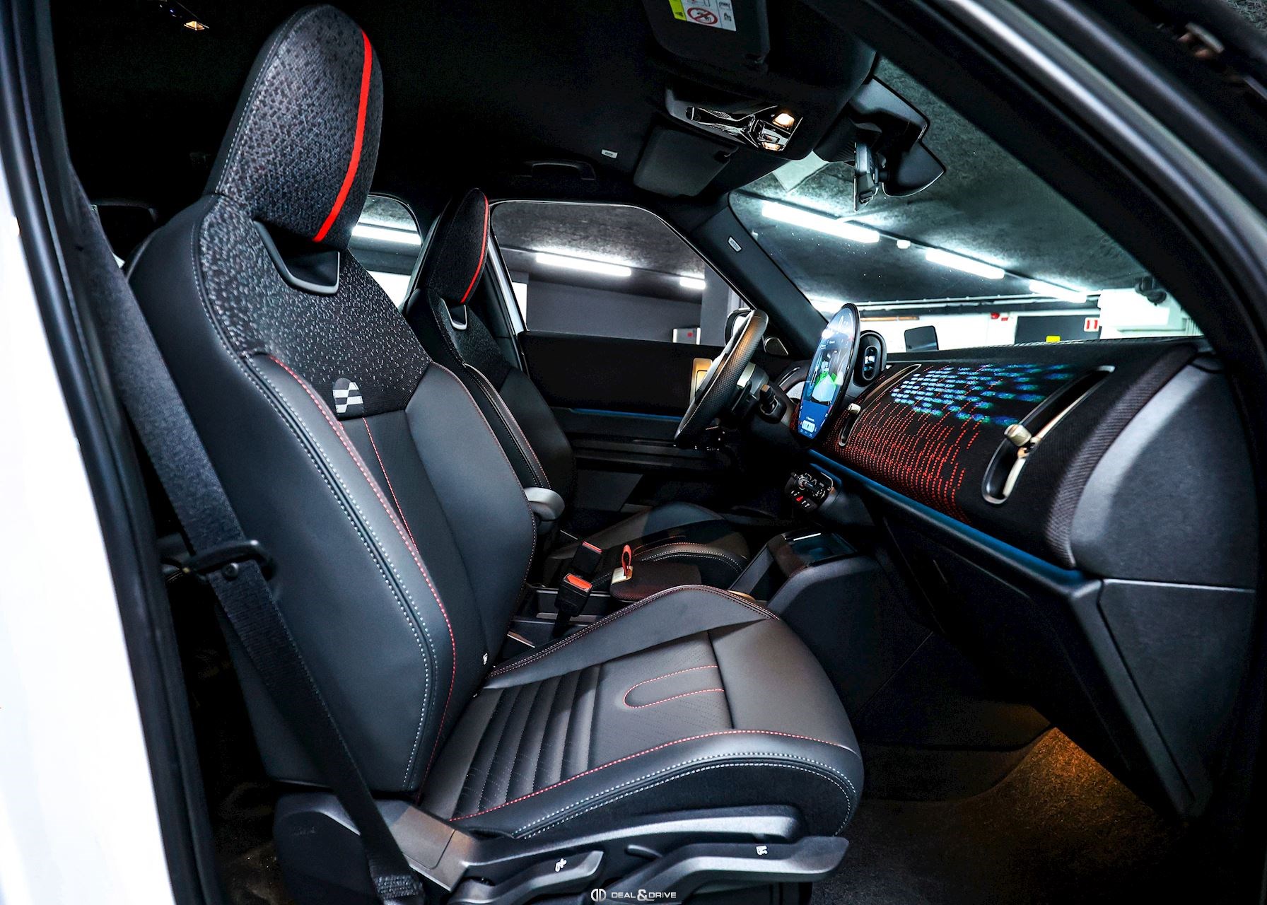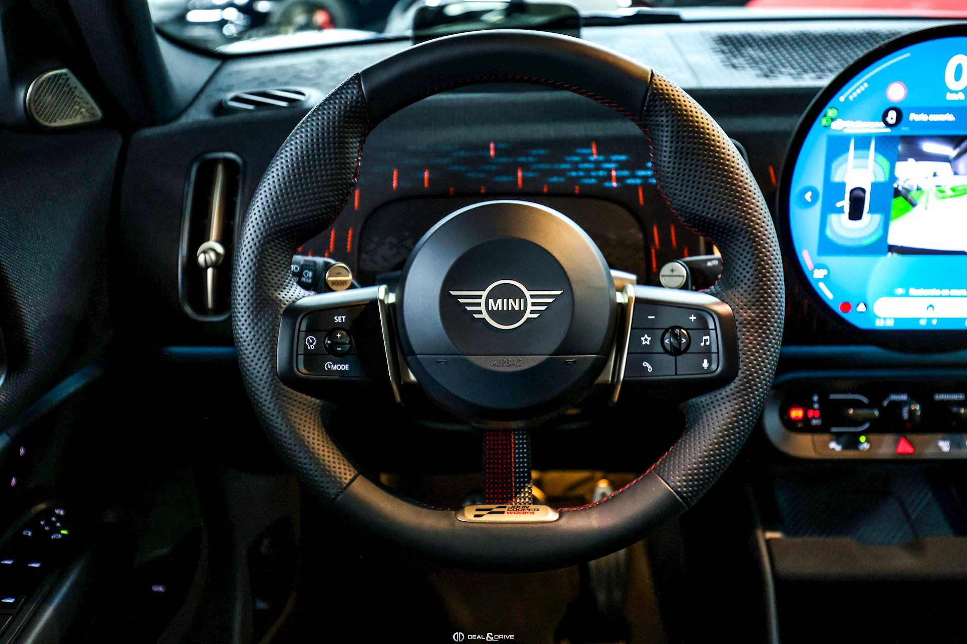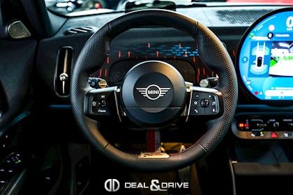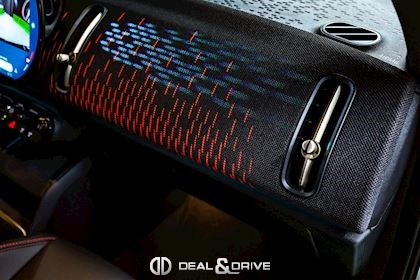 INTÉRIEUR Volant Sport John Cooper Works avec similicuir perforé et palettes de changement de vitesse, multifonctions Volant chauffant Sièges Sport John Cooper Works Isofix sur siège passager Climatisation automatique 2 zones Tapis de sol Plafonnier Noir Accoudoir central avant