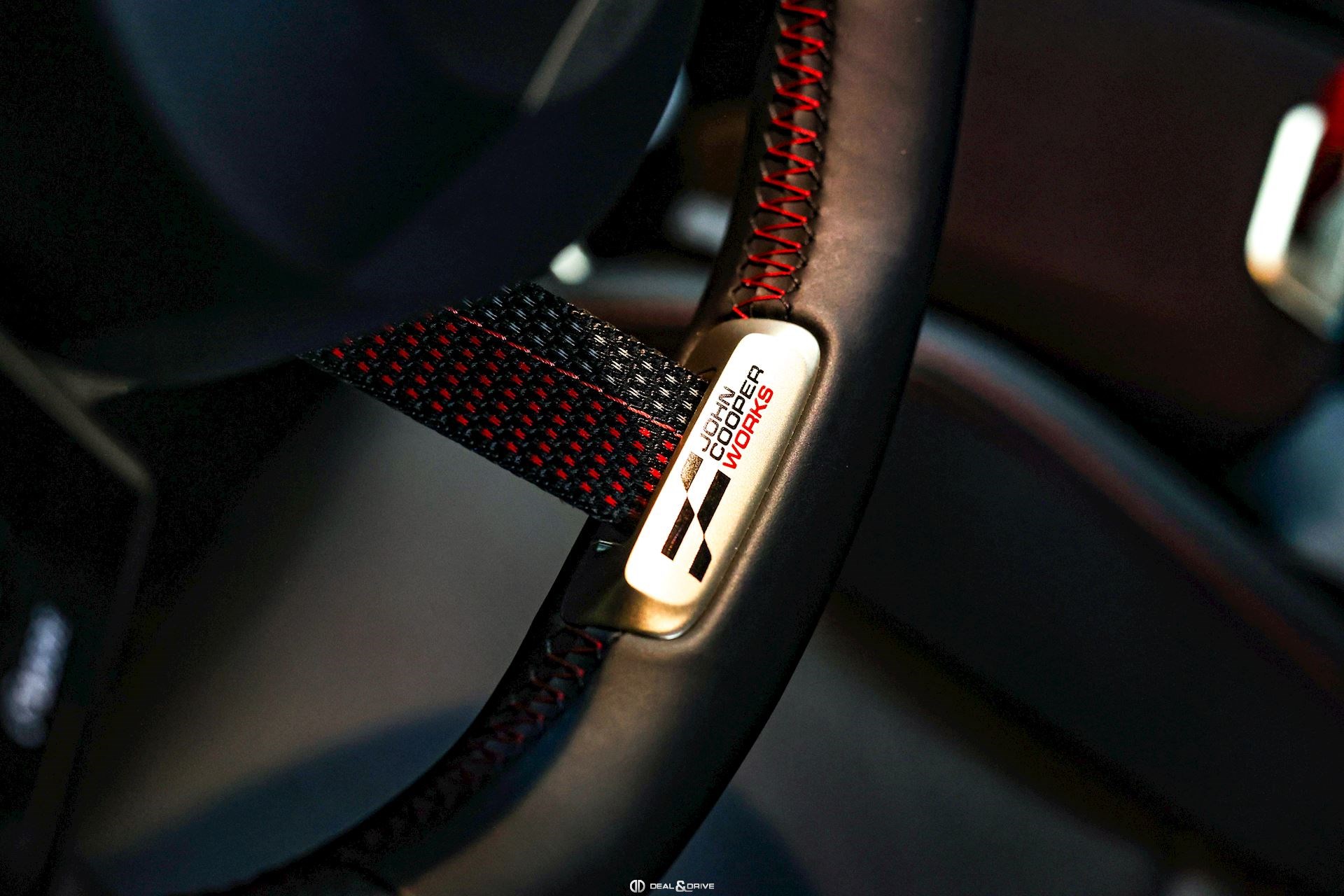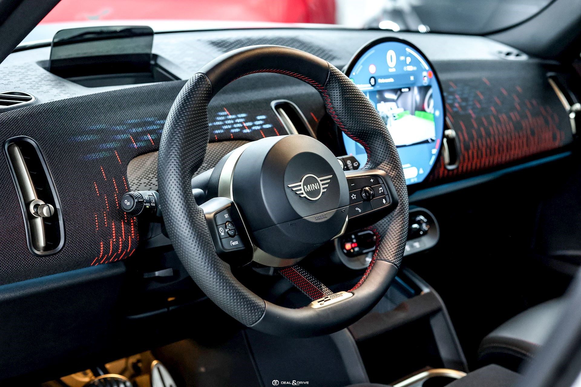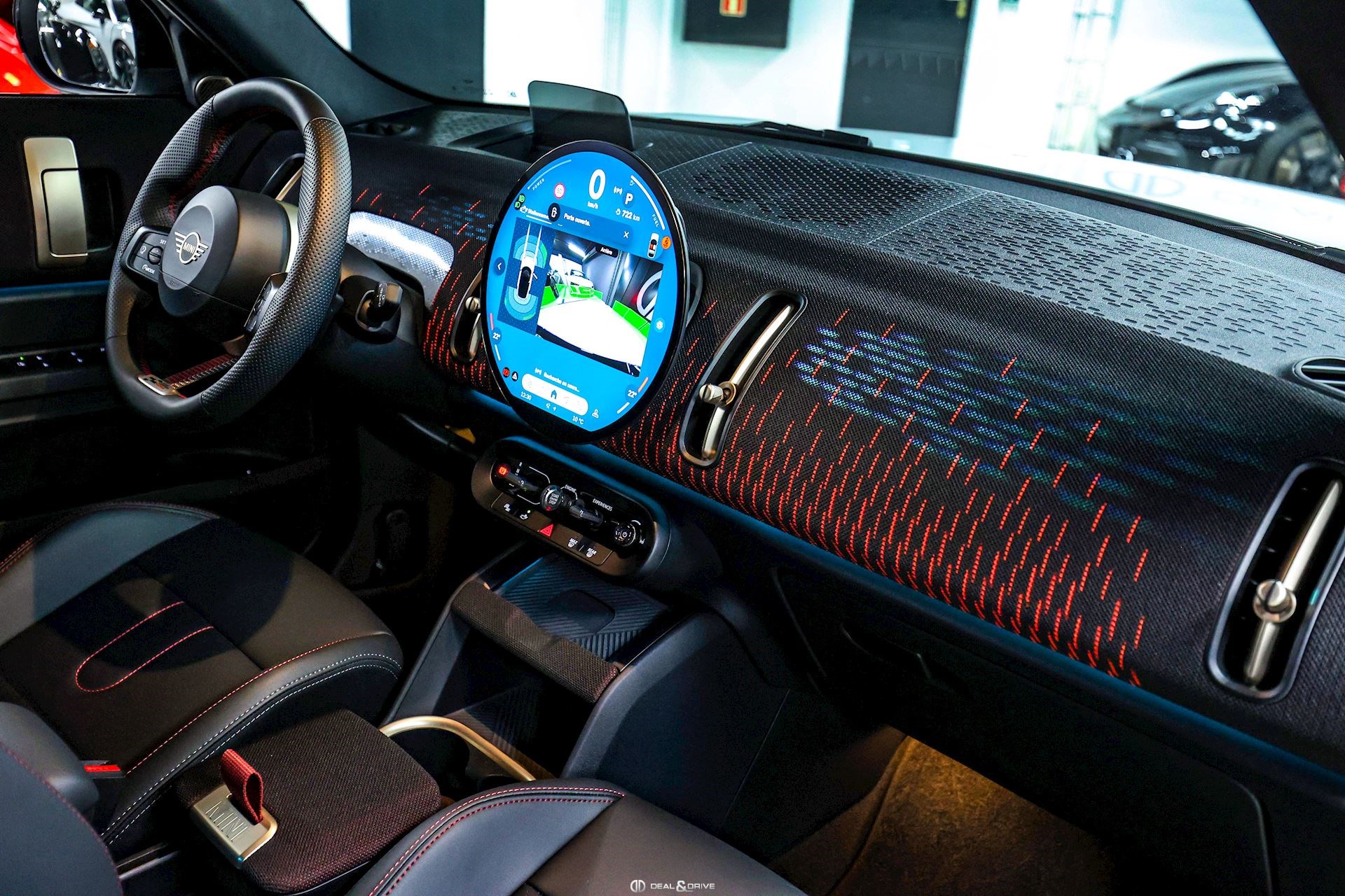 INTÉRIEUR Volant Sport John Cooper Works avec similicuir perforé et palettes de changement de vitesse, multifonctions Volant chauffant Sièges Sport John Cooper Works Isofix sur siège passager Climatisation automatique 2 zones Tapis de sol Plafonnier Noir Accoudoir central avant