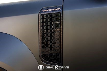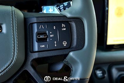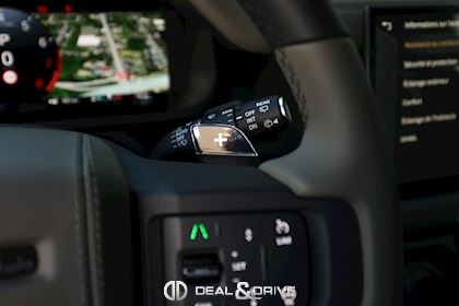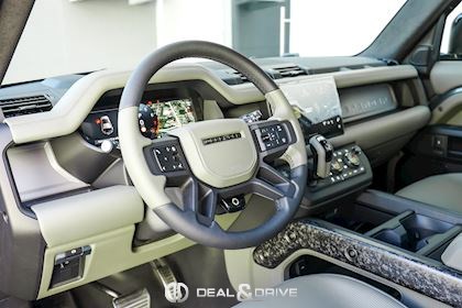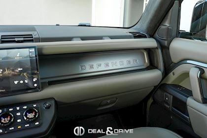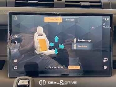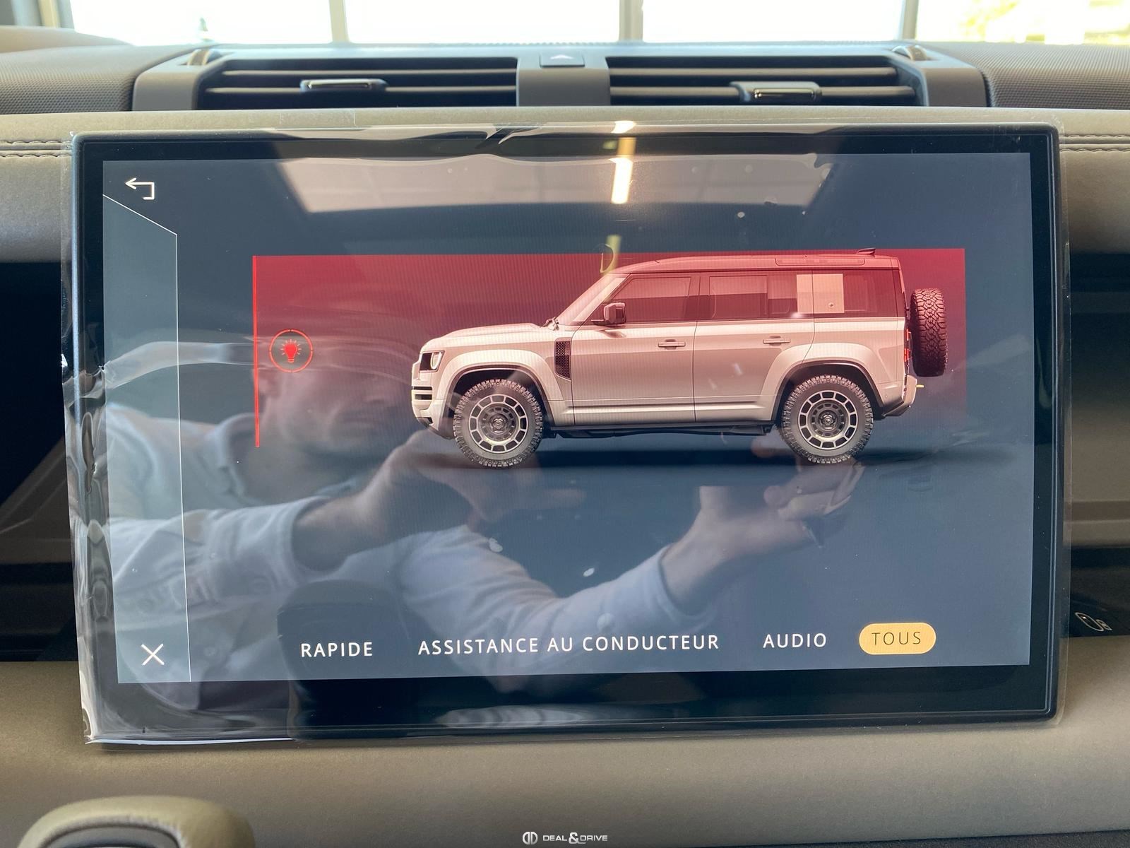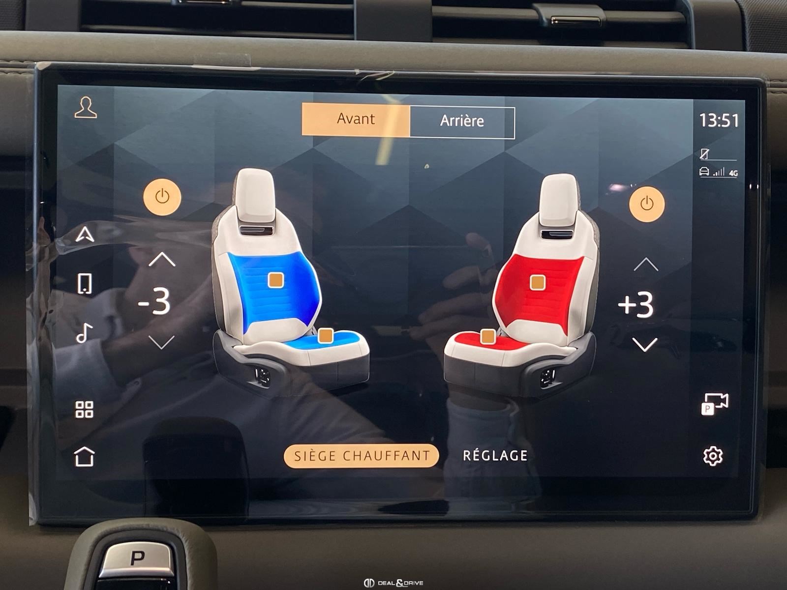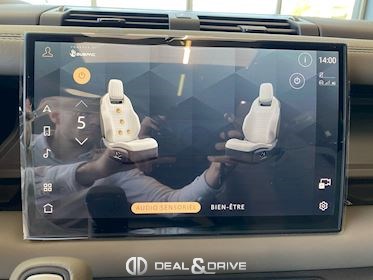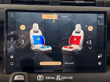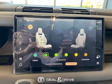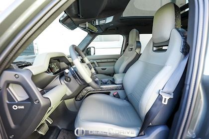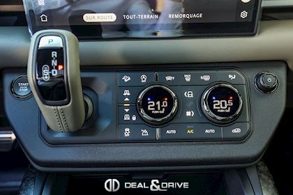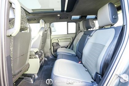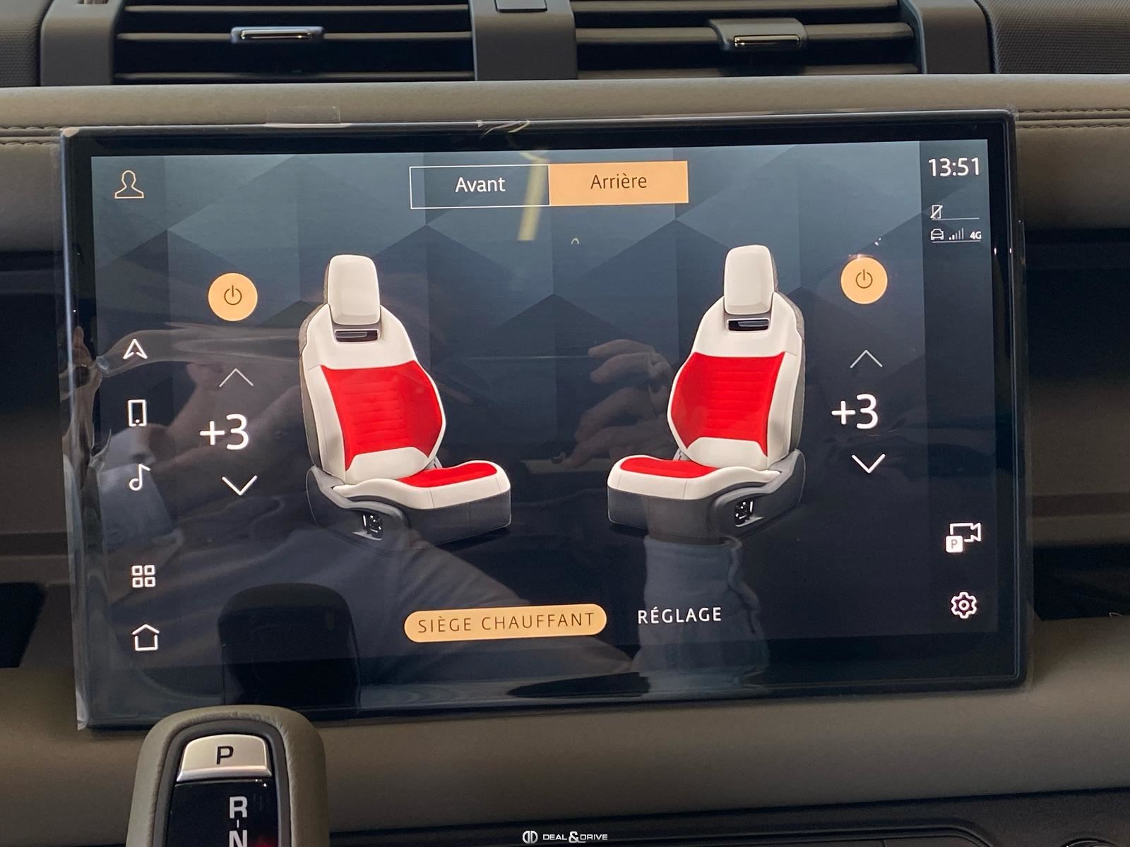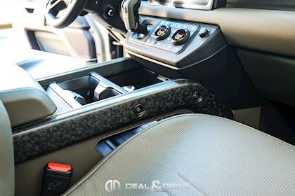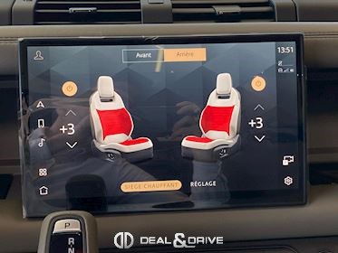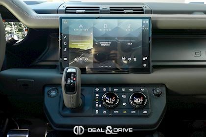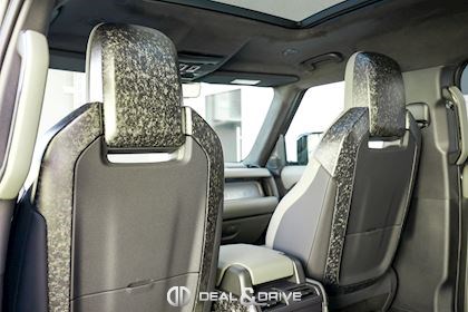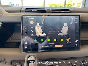 INTÉRIEUR Inserts en Fibre de Carbone fragmentée Dossier de siège en fibre de Carbone fragmentée Finition de console centrale en fibre de carbone fragmentée Traverse en finition metallisée Grey Powder Habitacle finition signature Plafonnier en Suédine en couleur Ebony Console centrale réfrigérée Sièges incluant le système audio Body and Soul Sièges avant électriques réglables en 14 voies Sièges avant avec fonction mémoire Sièges avant chauffants Sièges avant ventilés Appuie-lombaires électriques Sièges arrière chauffants rabattables en configuration 40/20/40 avec accoudoir central Volant Performance Volant chauffant Volant réglable électriquement Sélecteur de vitesse en tissu Resist Signature graphique avec rangement intérieur Pédalier en métal brillant Plaques de seuils avant illuminées en métal avec inscription 'DEFENDER' Palettes de changement de rapports au volant, éclairées Tapis de sol signature Climatisation automatique 3 zones Capteur de qualité de l’air Système de purification de l’air de l’habitacle avec filtre PM2.5 - Niveau 2 Isofix sur siège passager Couvre bagage