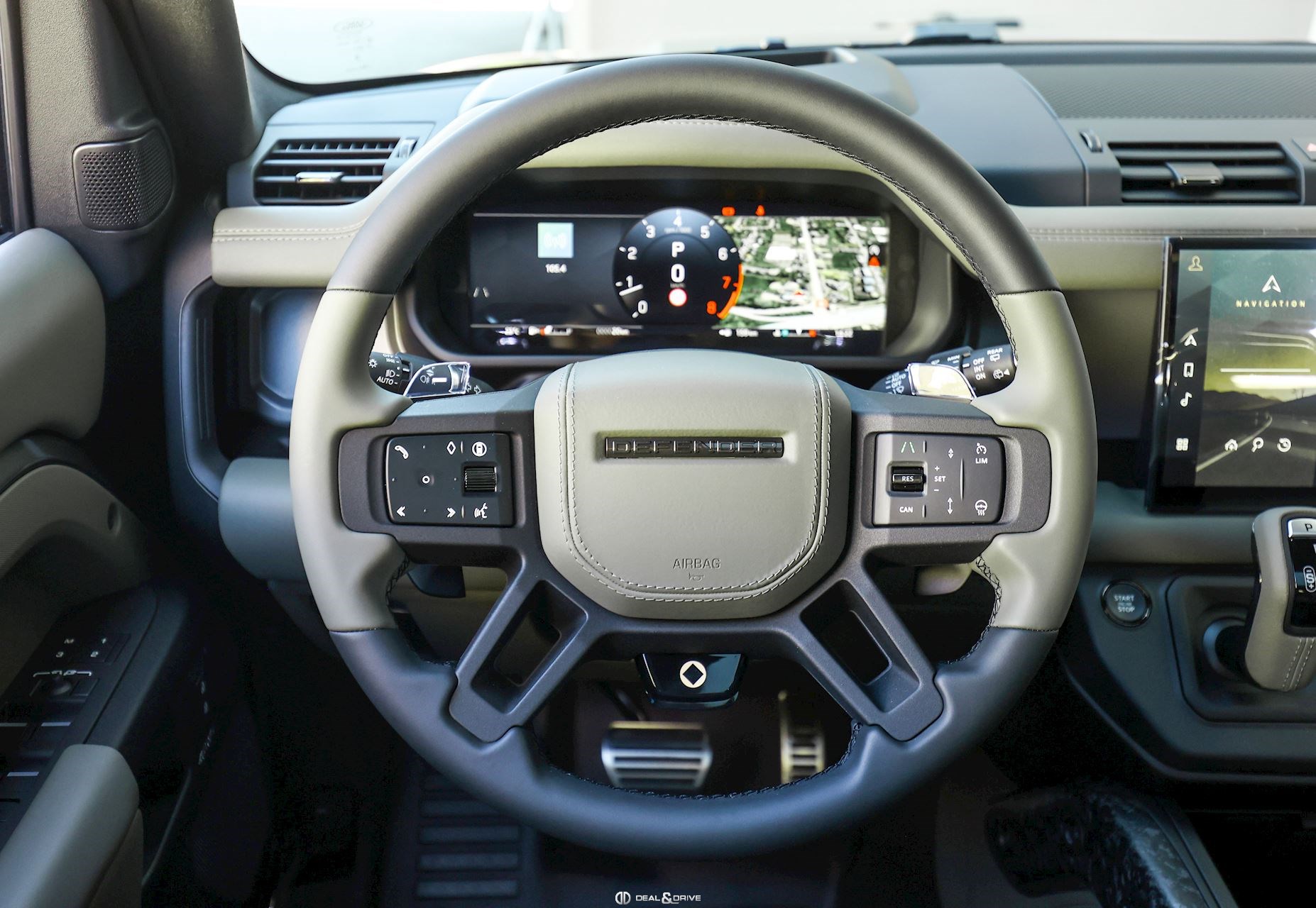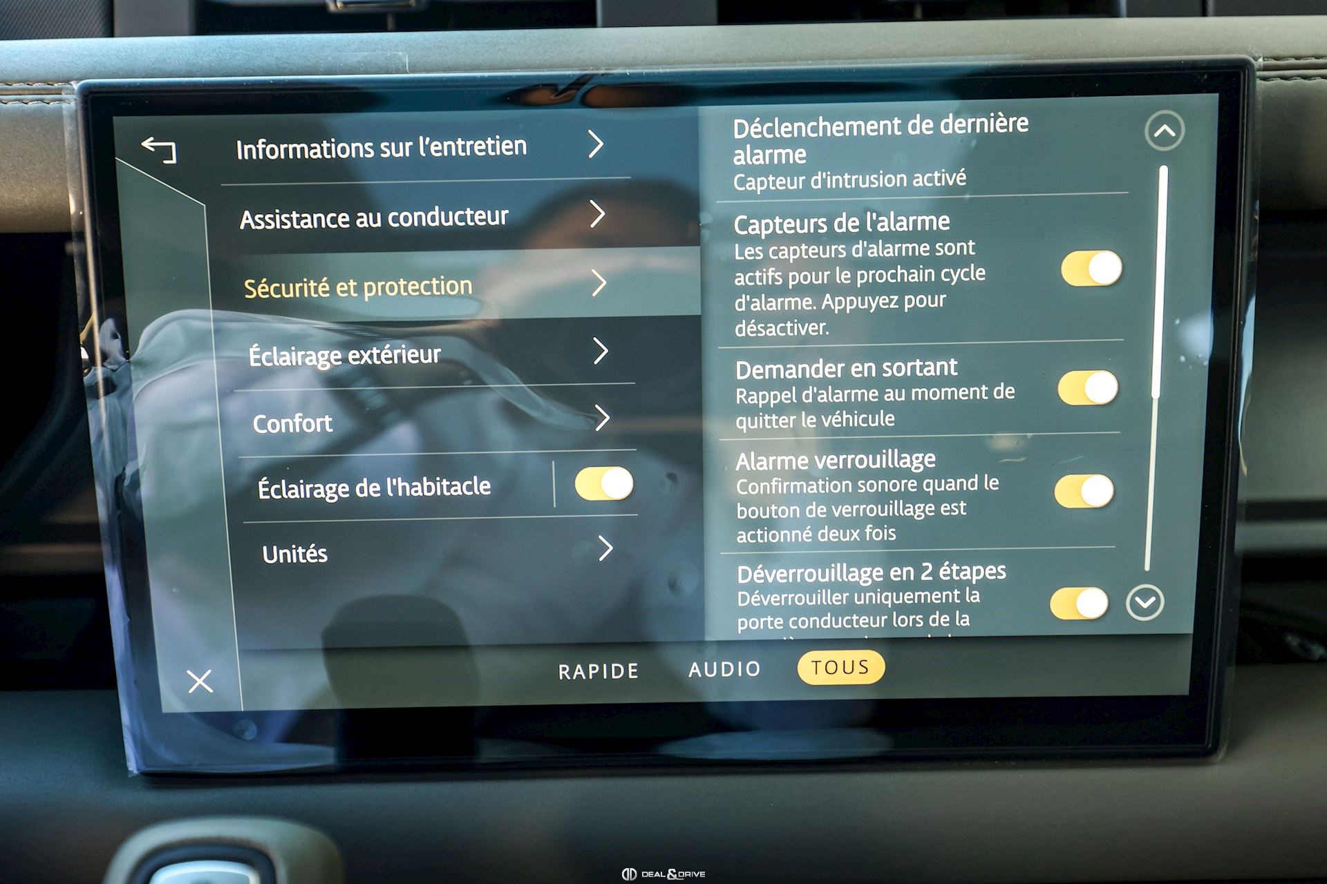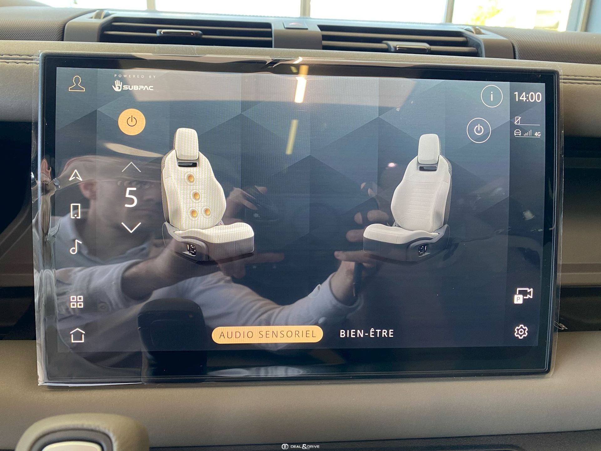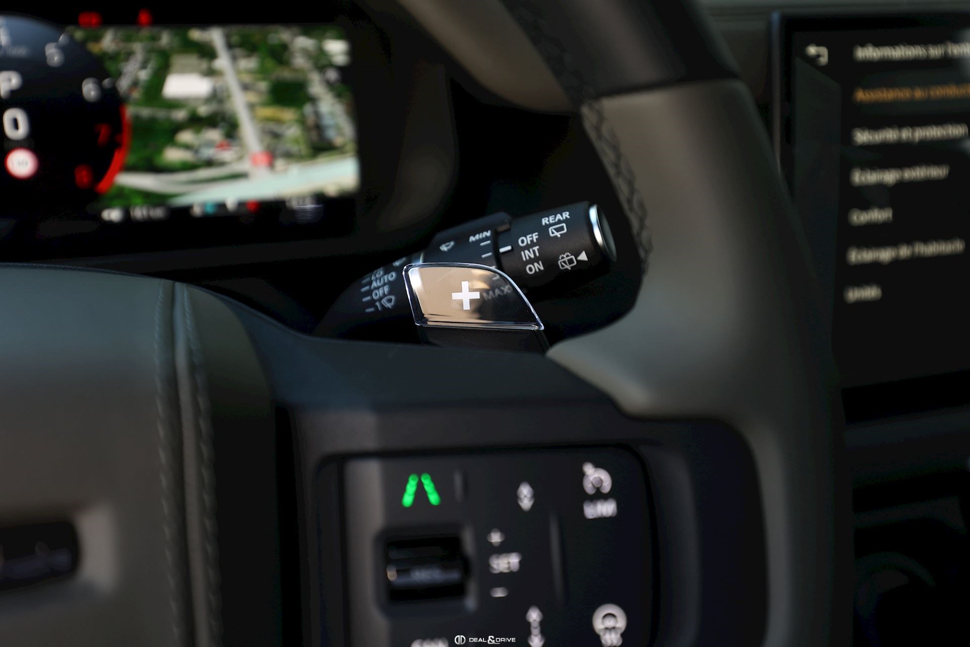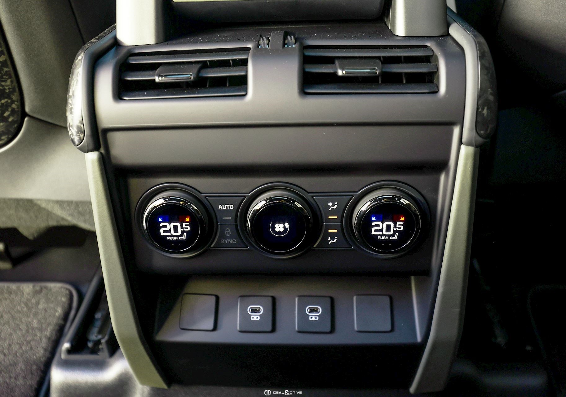 INTÉRIEUR Inserts en Fibre de Carbone fragmentée Dossier de siège en fibre de Carbone fragmentée Finition de console centrale en fibre de carbone fragmentée Traverse en finition metallisée Grey Powder Habitacle finition signature Plafonnier en Suédine en couleur Ebony Console centrale réfrigérée Sièges incluant le système audio Body and Soul Sièges avant électriques réglables en 14 voies Sièges avant avec fonction mémoire Sièges avant chauffants Sièges avant ventilés Appuie-lombaires électriques Sièges arrière chauffants rabattables en configuration 40/20/40 avec accoudoir central Volant Performance Volant chauffant Volant réglable électriquement Sélecteur de vitesse en tissu Resist Signature graphique avec rangement intérieur Pédalier en métal brillant Plaques de seuils avant illuminées en métal avec inscription 'DEFENDER' Palettes de changement de rapports au volant, éclairées Tapis de sol signature Climatisation automatique 3 zones Capteur de qualité de l’air Système de purification de l’air de l’habitacle avec filtre PM2.5 - Niveau 2 Isofix sur siège passager Couvre bagage
