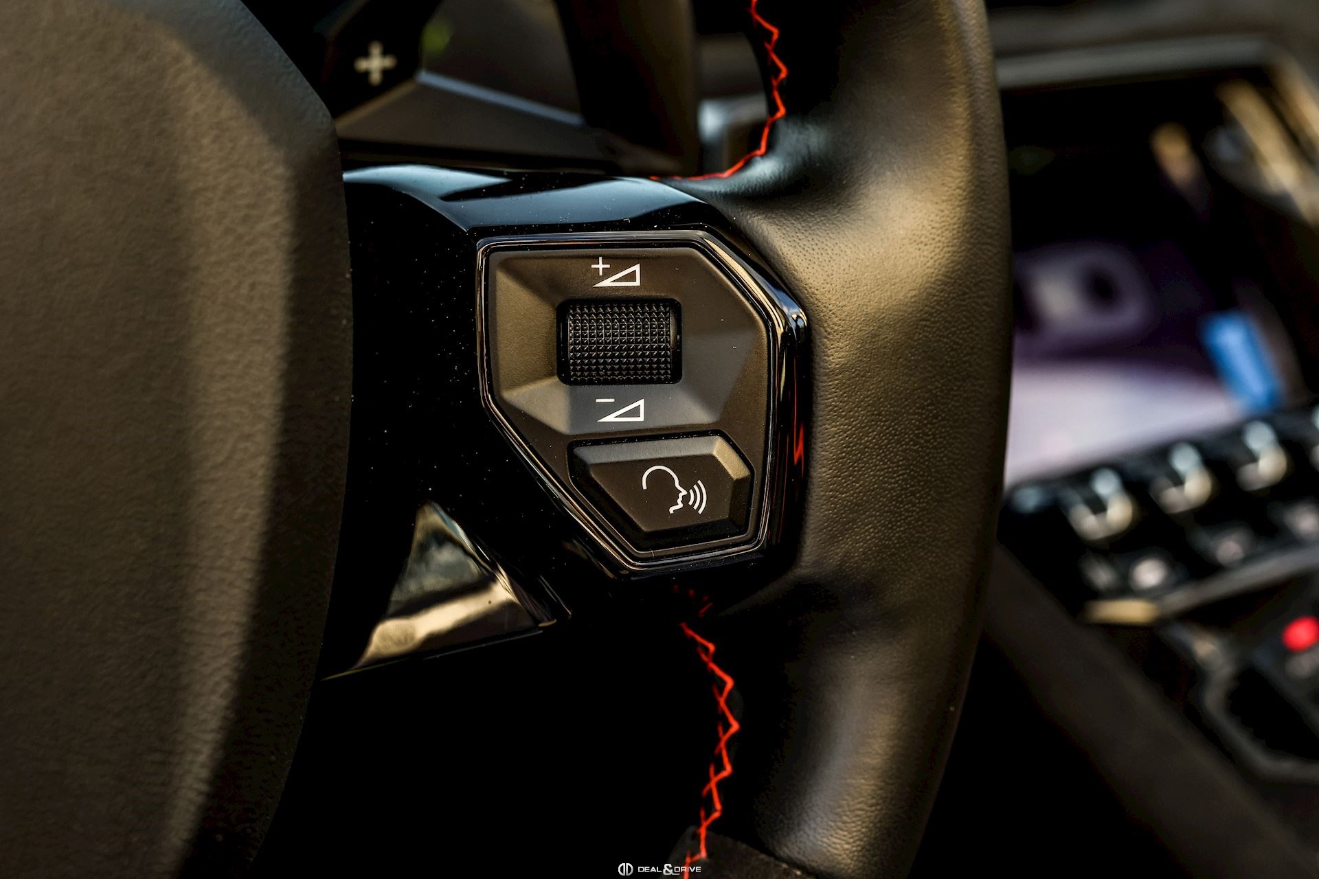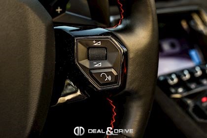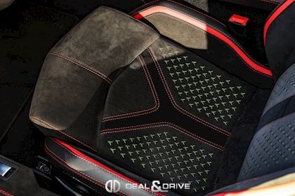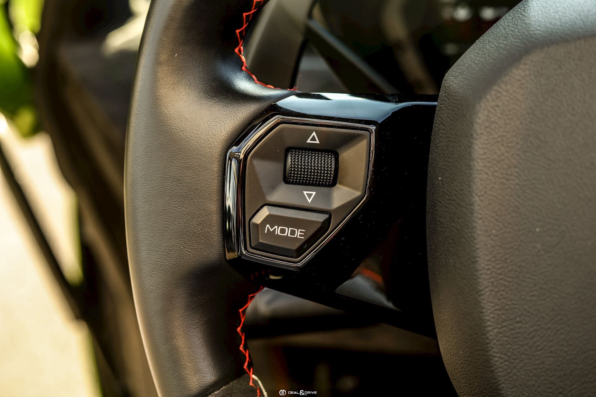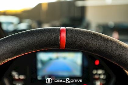 - Volant en cuir et Alcantara, multifonctions avec marqueur à midi en Rouge et surpiqûres en Rouge