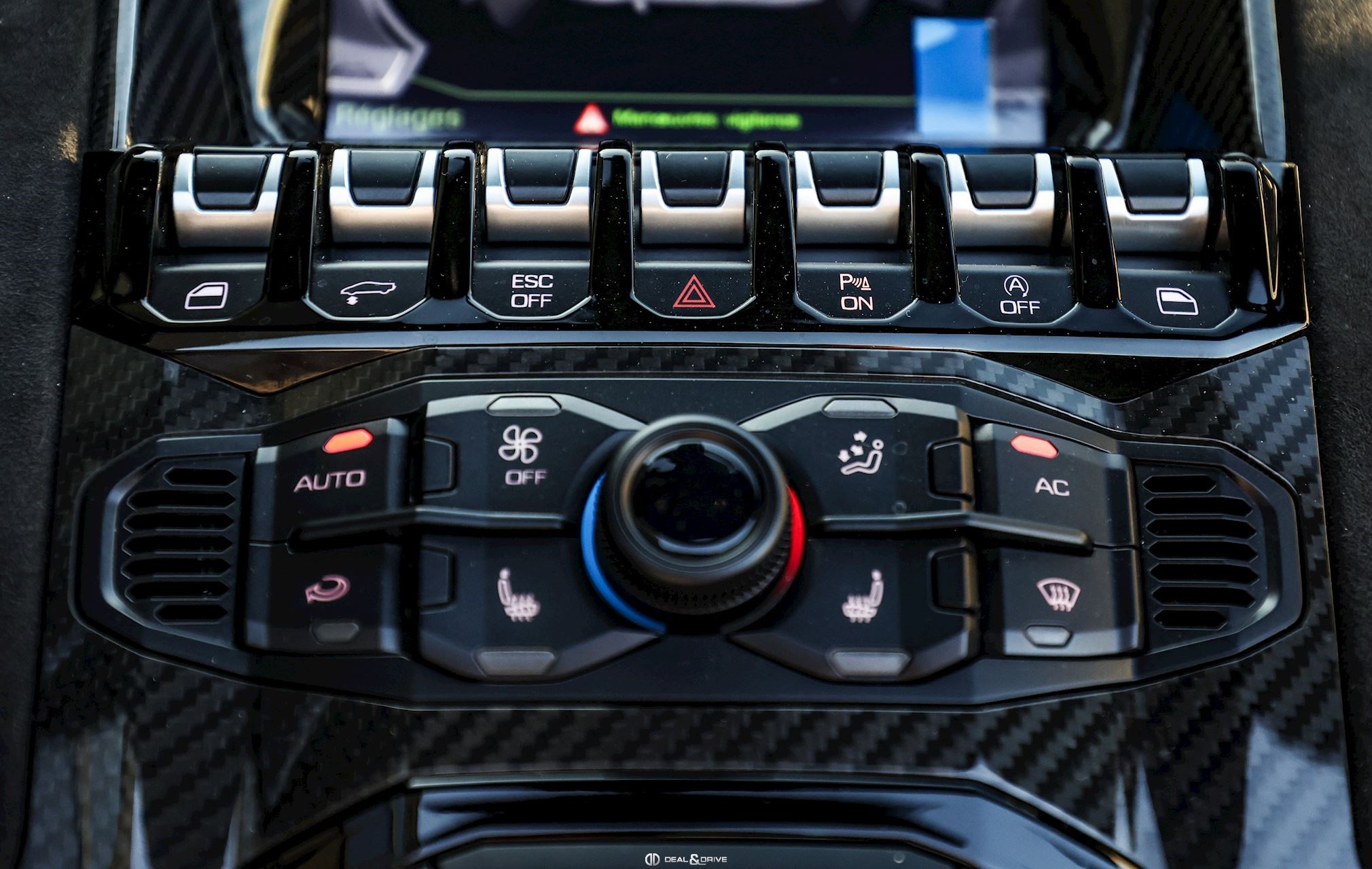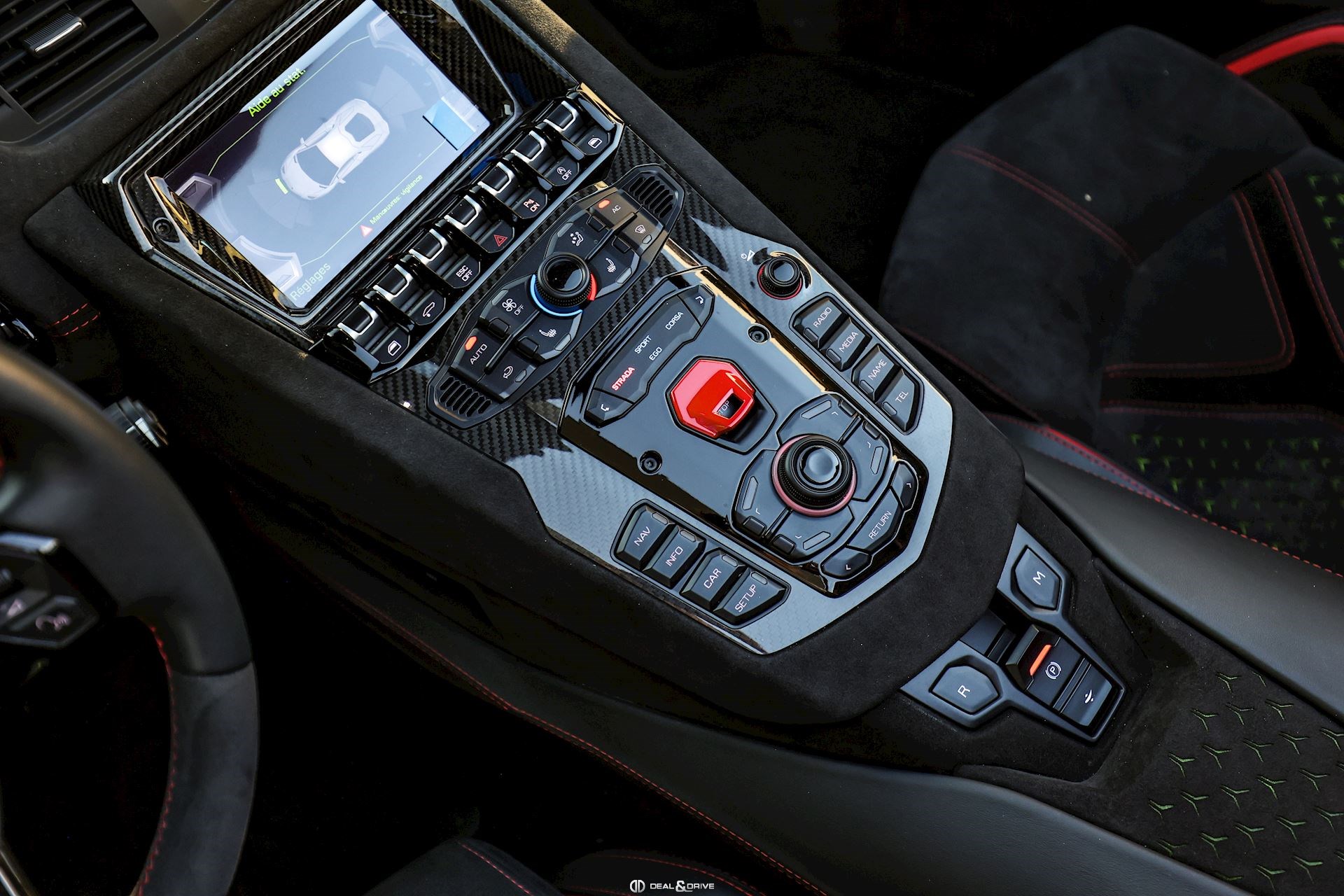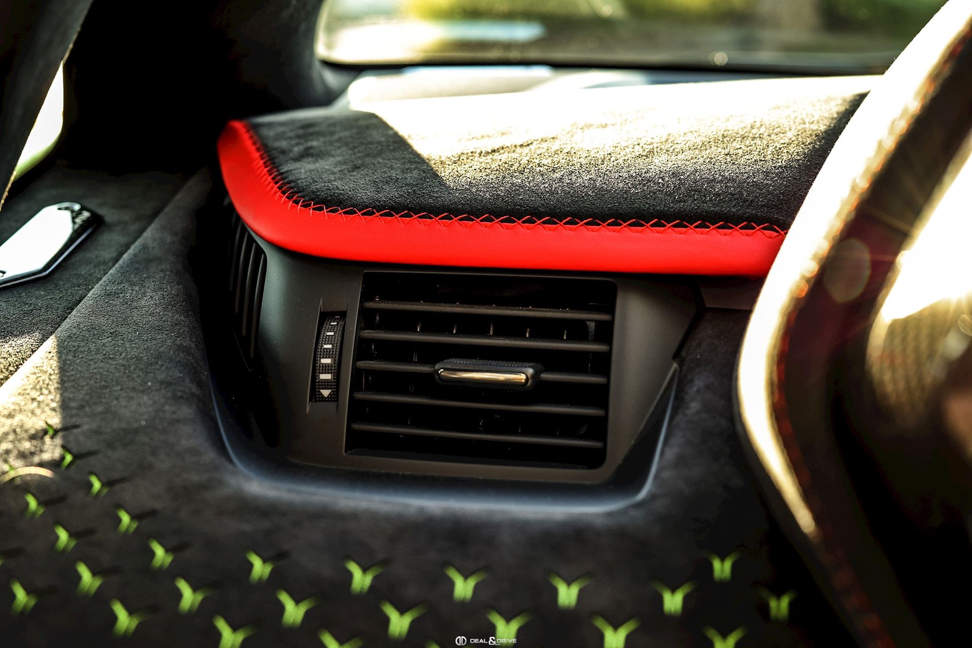 - Volant en cuir et Alcantara, multifonctions avec marqueur à midi en Rouge et surpiqûres en Rouge