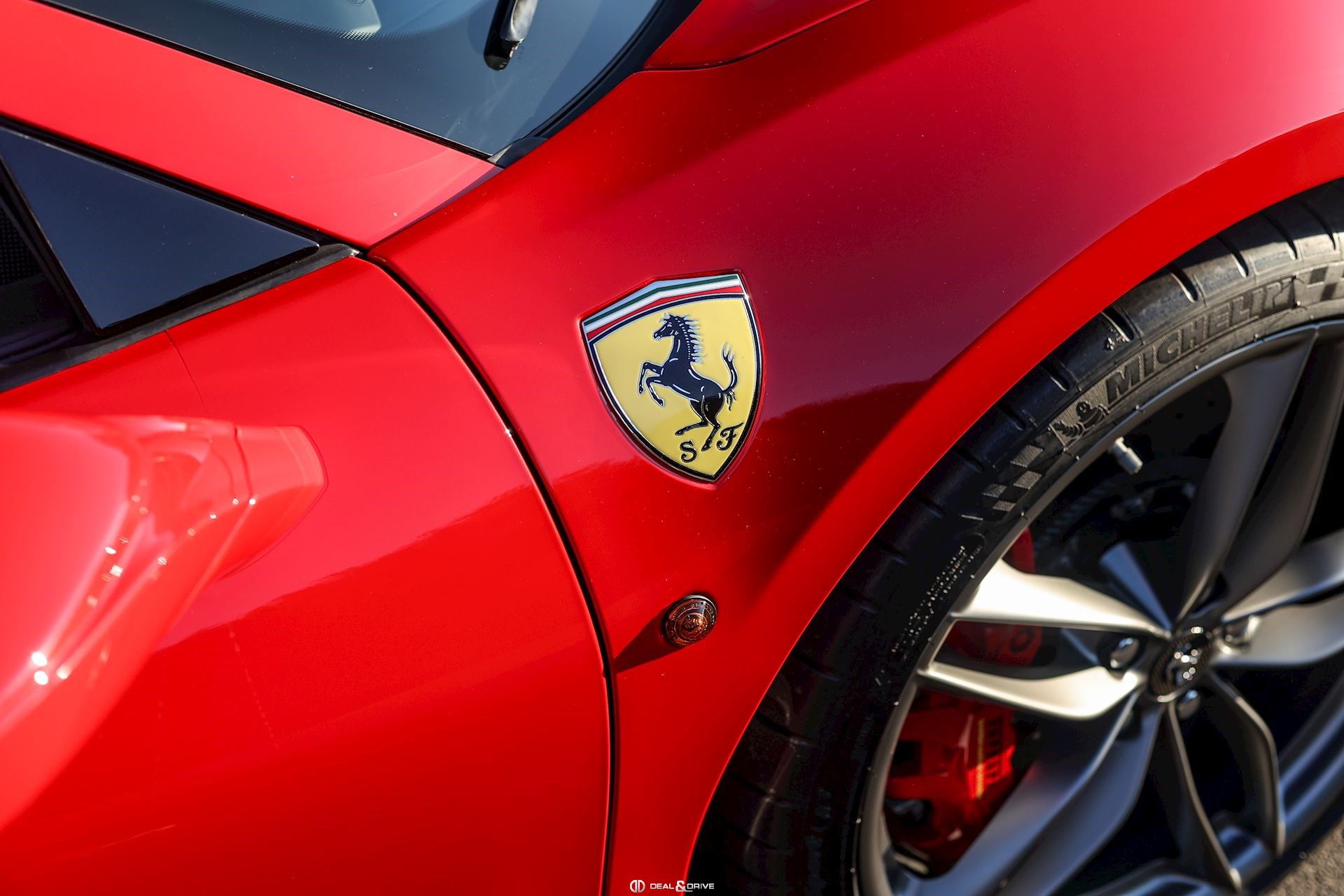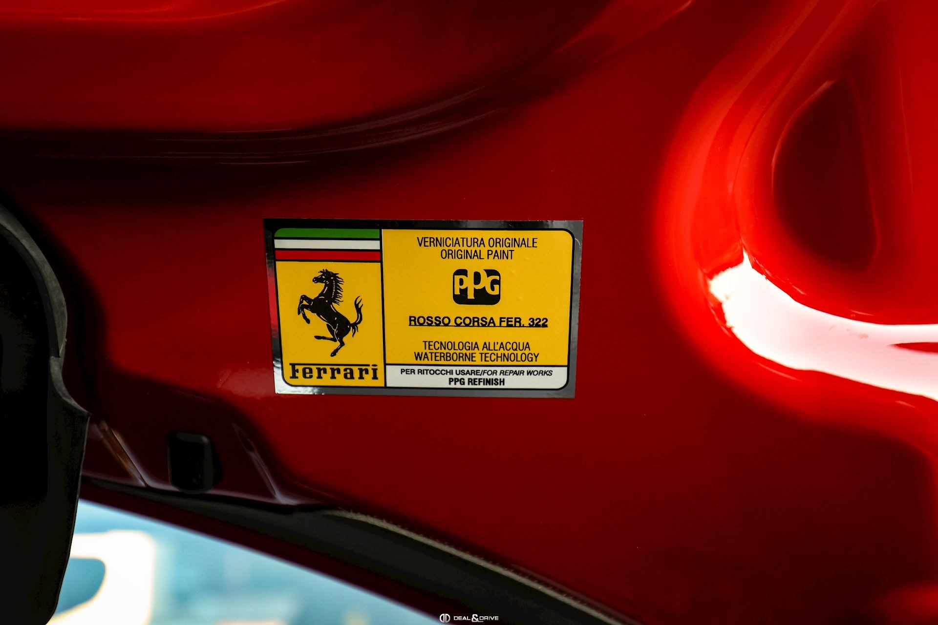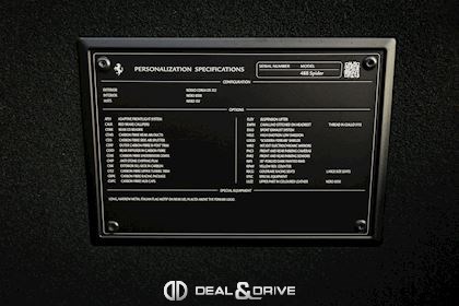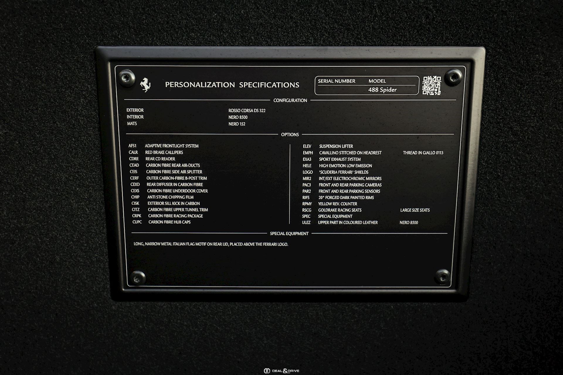SPEC – Équipement spécial : motif drapeau italien métallique long et étroit sur le capot arrière, placé au-dessus du logo Ferrari