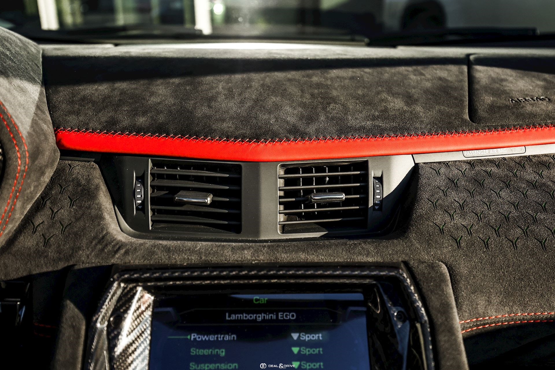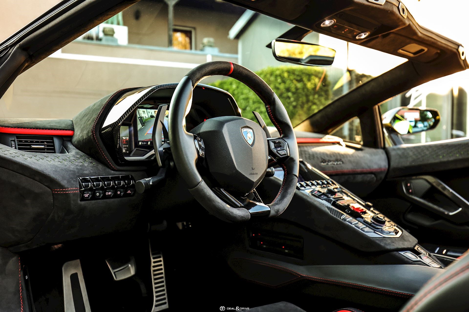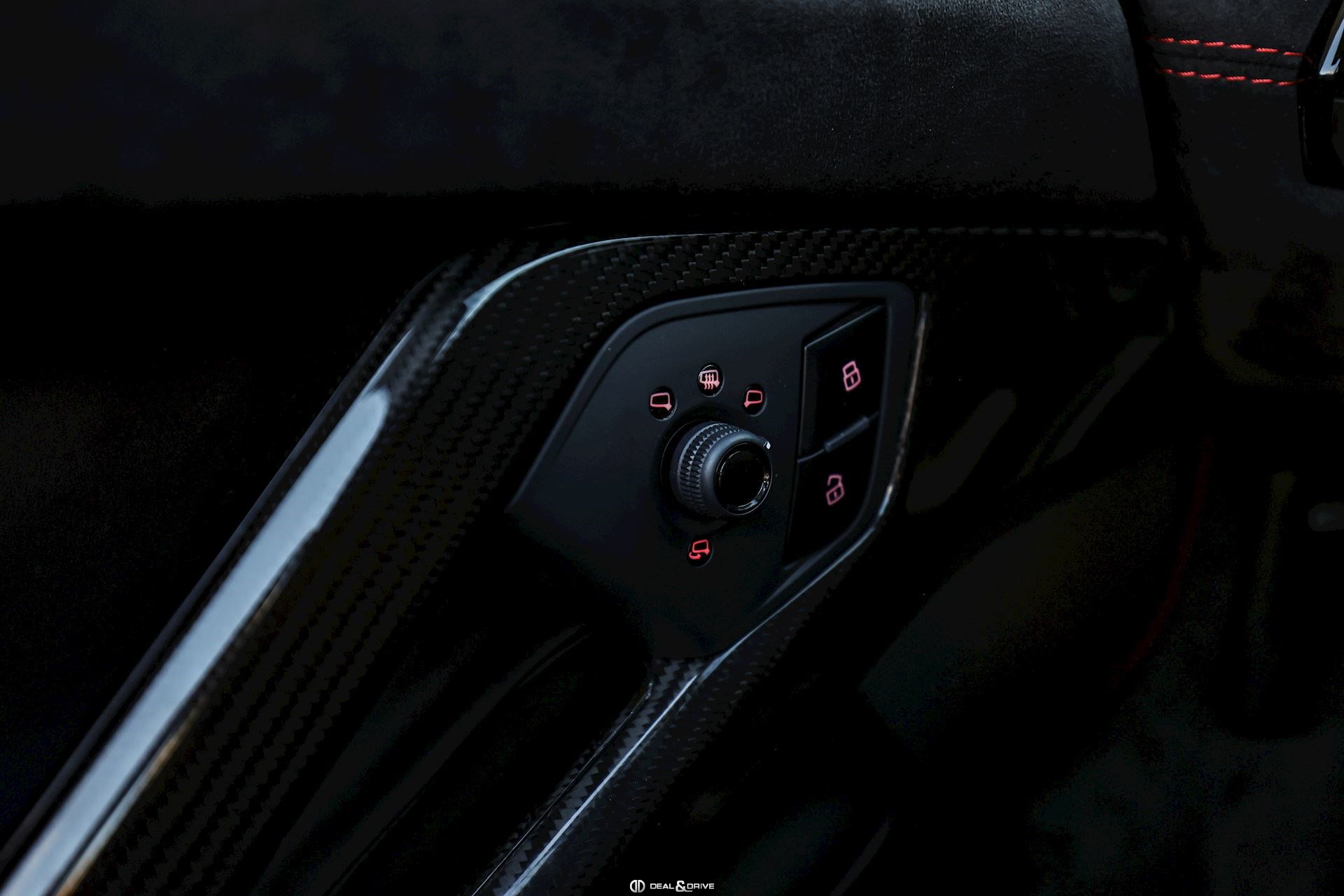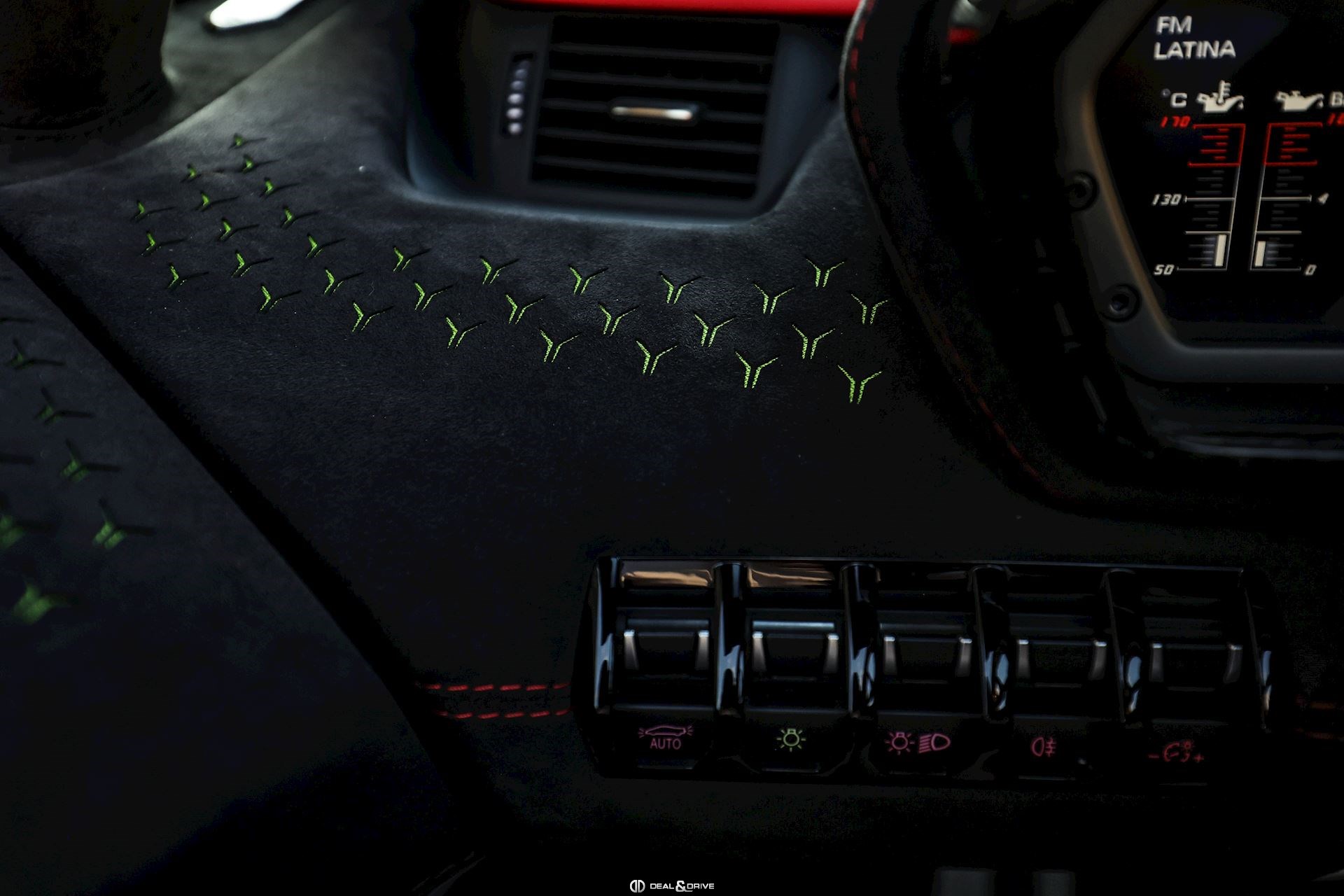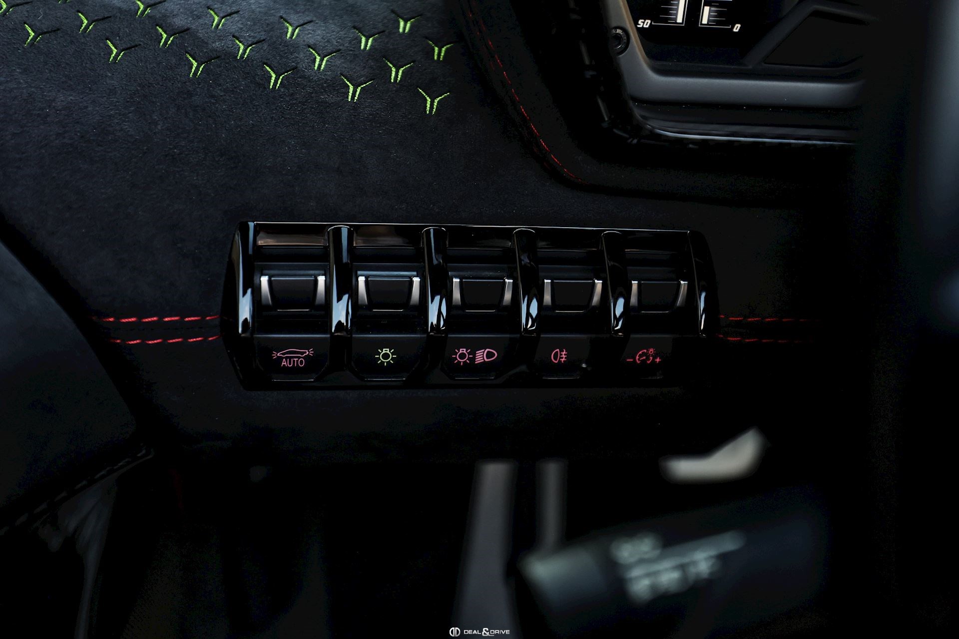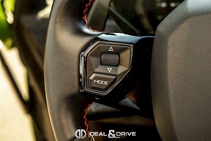 - Volant en cuir et Alcantara, multifonctions avec marqueur à midi en Rouge et surpiqûres en Rouge